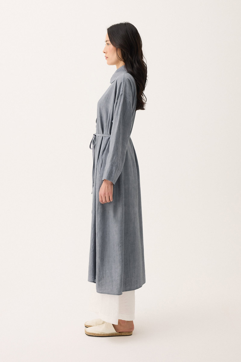 Bebe Yaka Tilbe Elbise Gri. Bebe yakadır, düşük omuzludur, kalın manşetlidir, önden düğmelidir, biye bağlama detaylıdır. Günlük kullanım için uygundur.