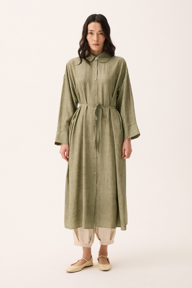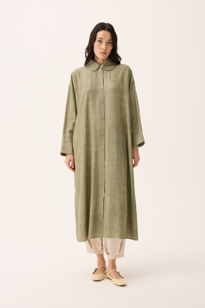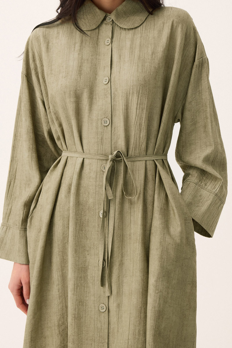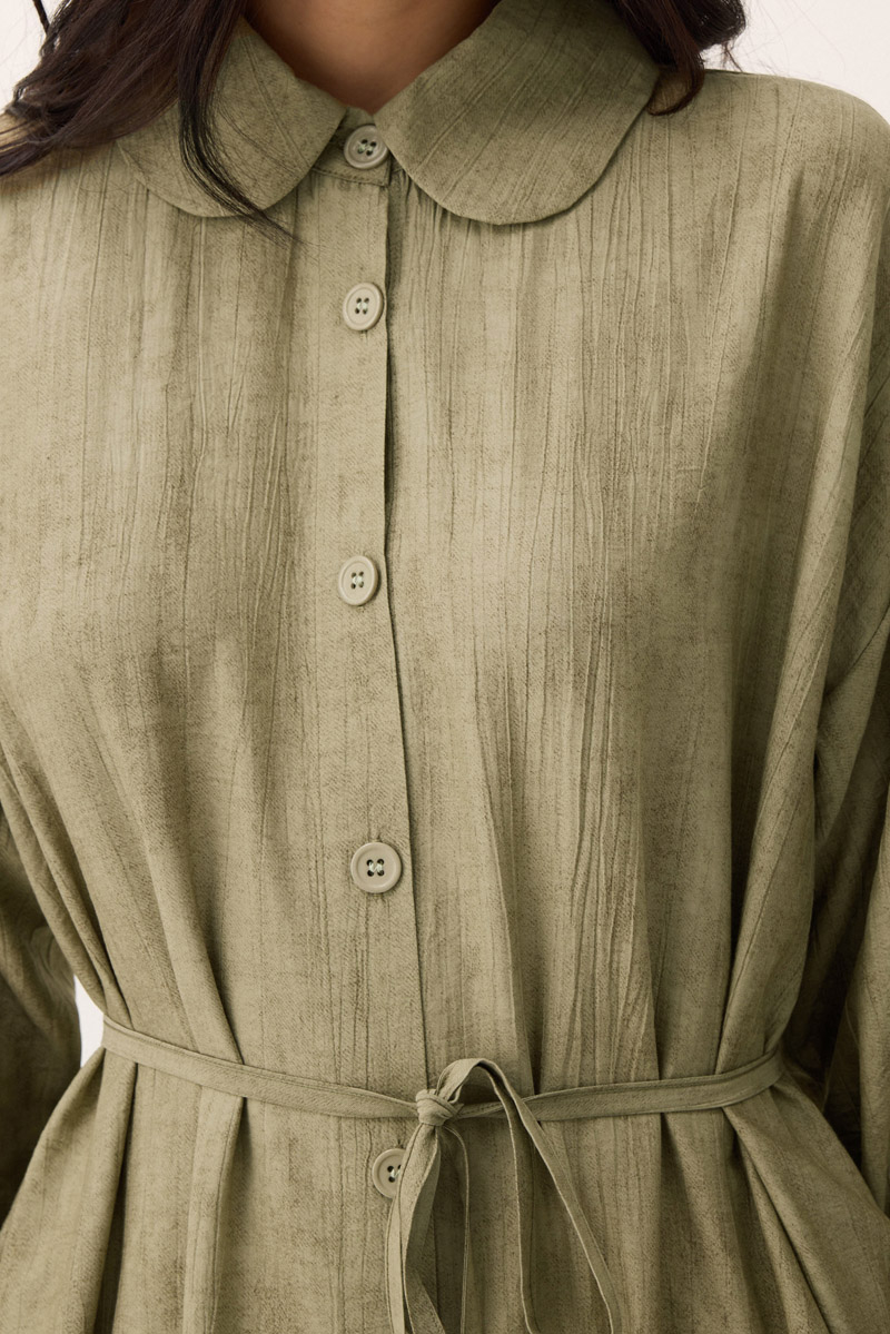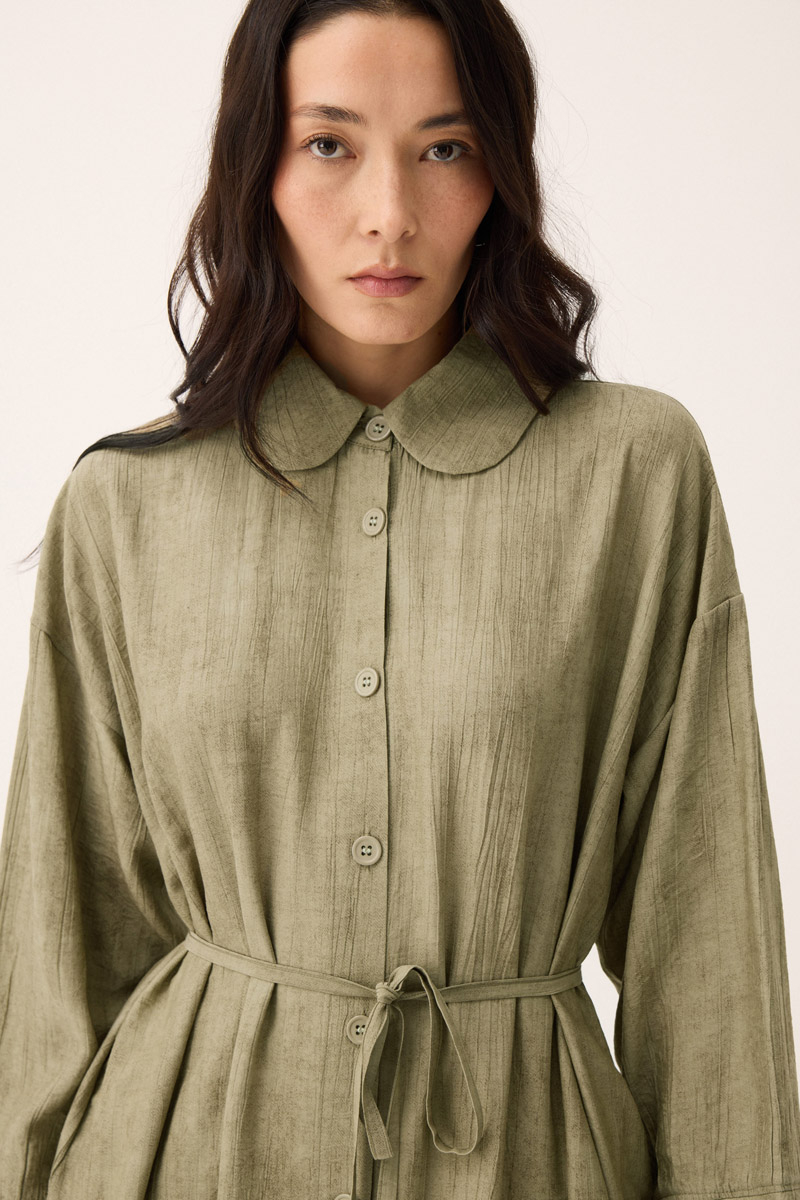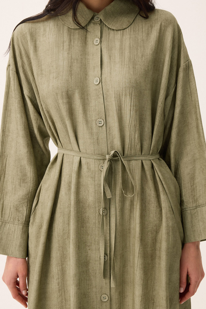 Bebe Yaka Tilbe Elbise Haki. Bebe yakadır, düşük omuzludur, kalın manşetlidir, önden düğmelidir, biye bağlama detaylıdır. Günlük kullanım için uygundur.