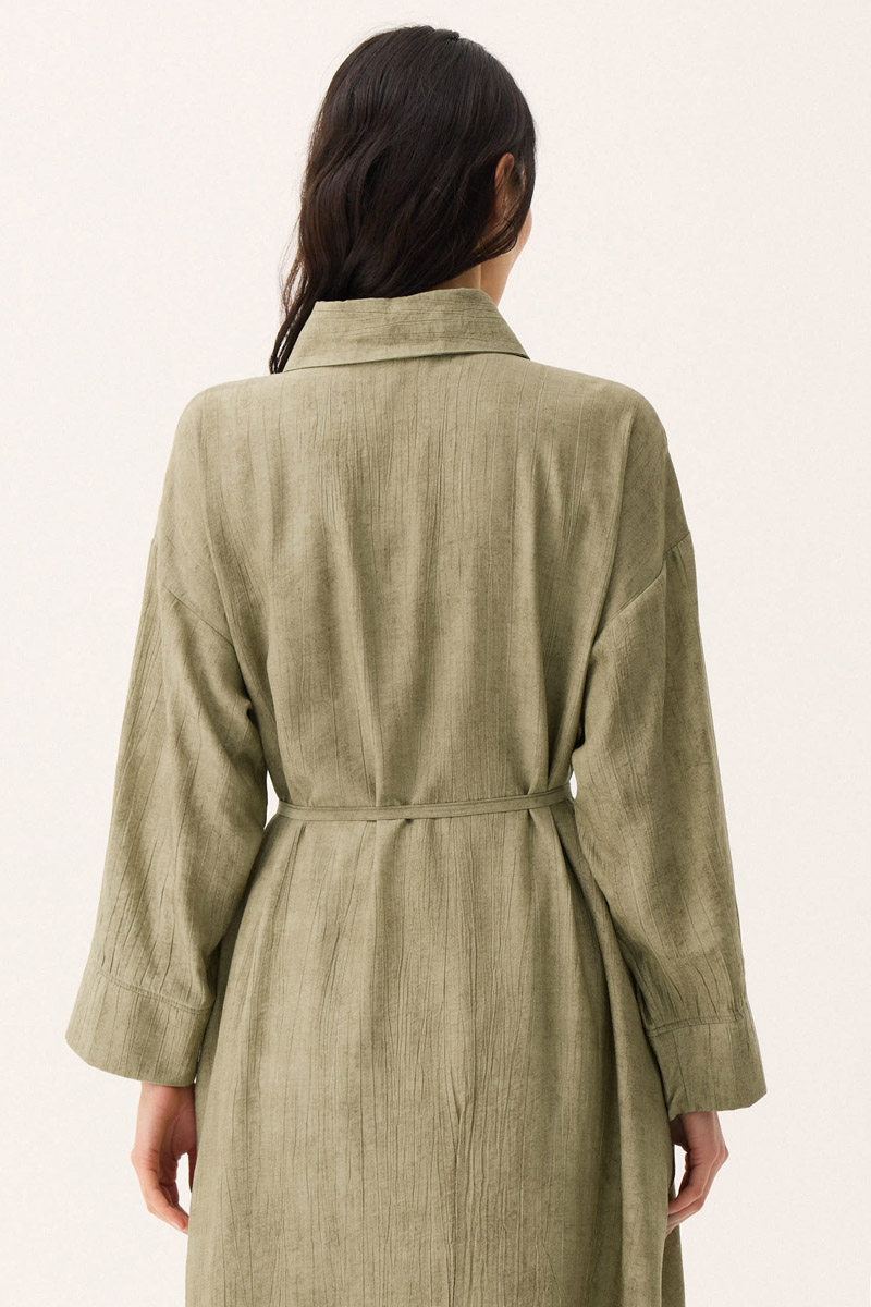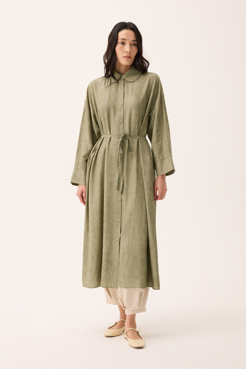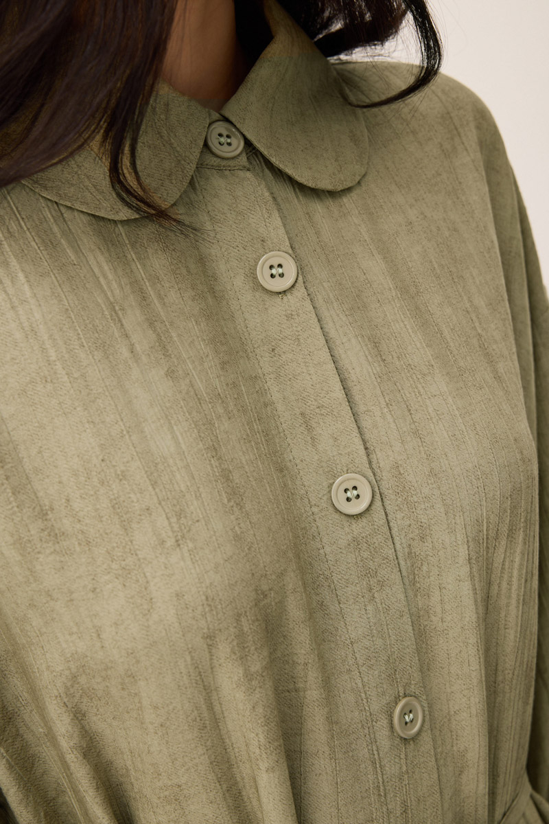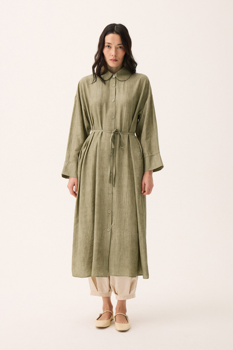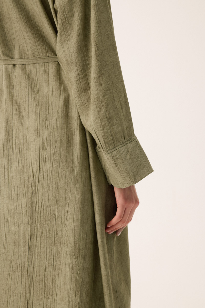 Bebe Yaka Tilbe Elbise Haki. Bebe yakadır, düşük omuzludur, kalın manşetlidir, önden düğmelidir, biye bağlama detaylıdır. Günlük kullanım için uygundur.