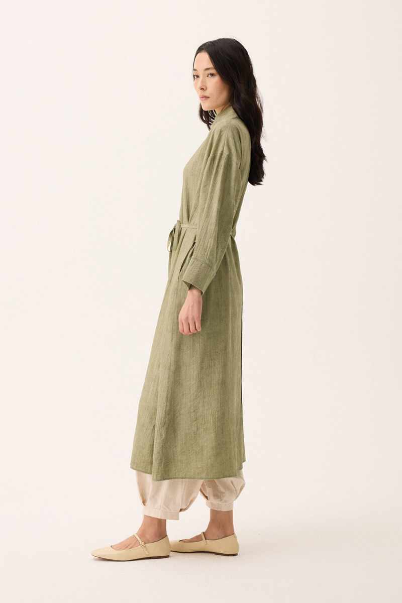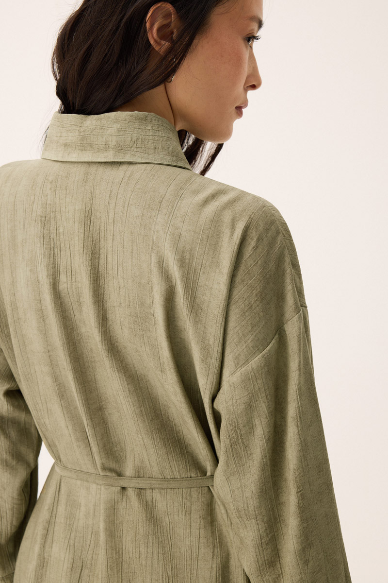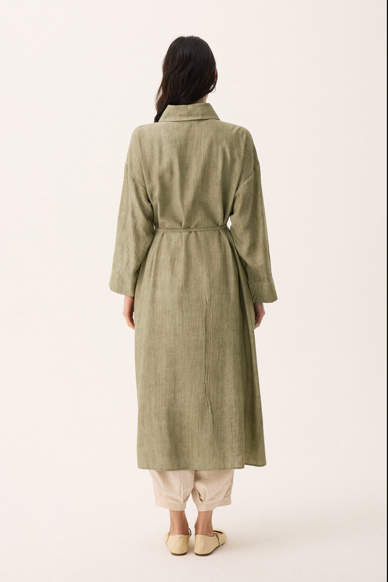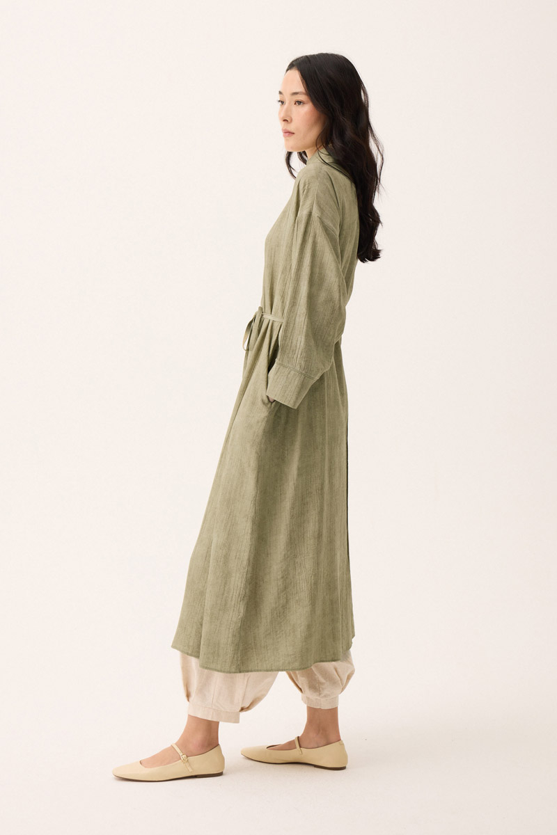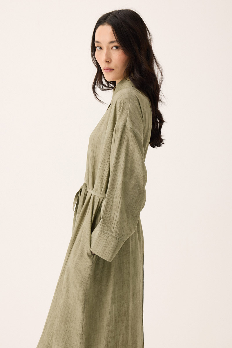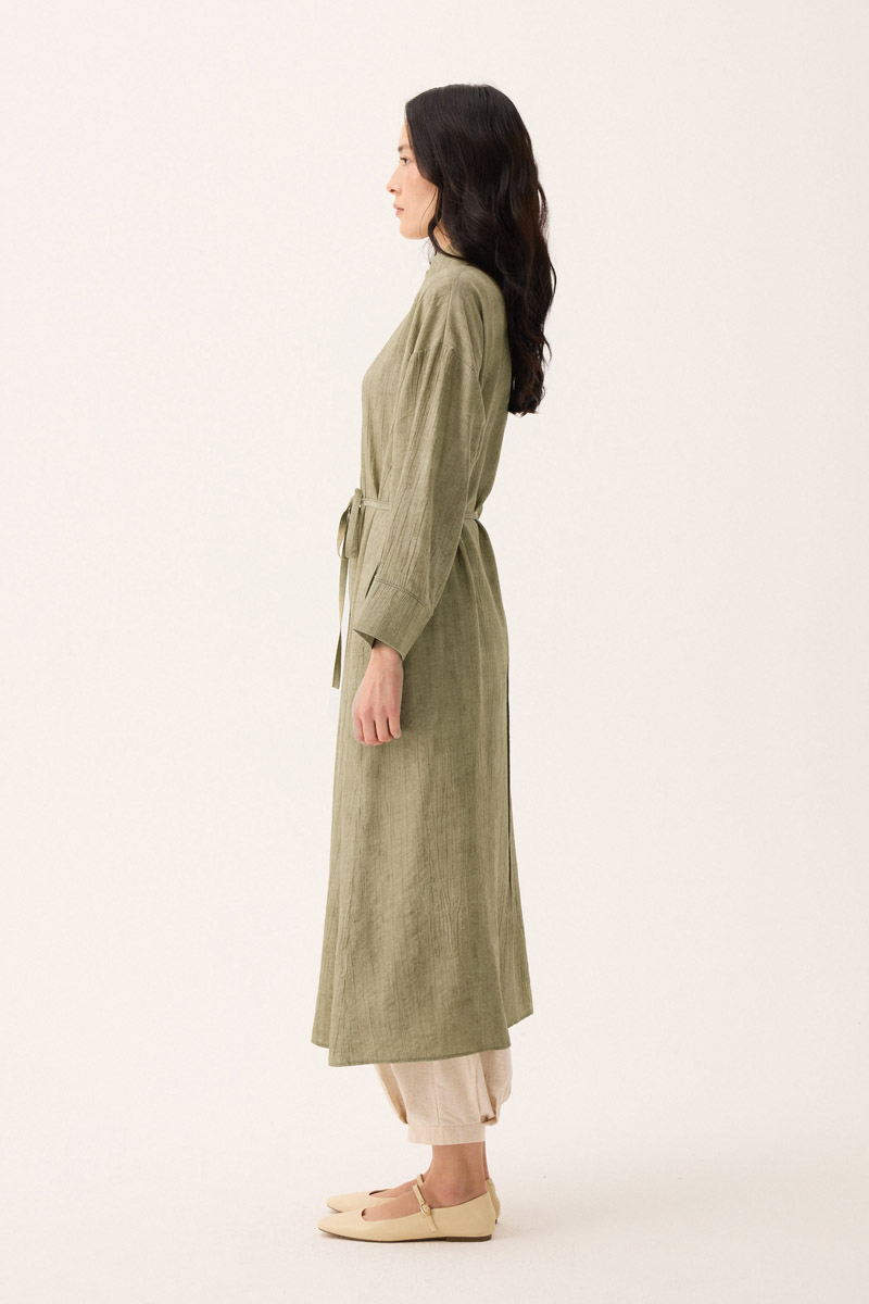 Bebe Yaka Tilbe Elbise Haki. Bebe yakadır, düşük omuzludur, kalın manşetlidir, önden düğmelidir, biye bağlama detaylıdır. Günlük kullanım için uygundur.