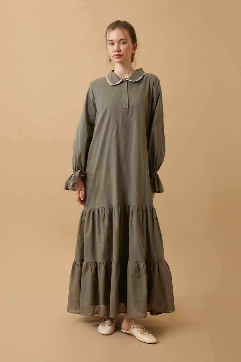 Bebe Yaka Vual Elbise Haki, Zarif detayları ve doğal duruşuyla hafif ve nefes alabilen vual kumaşı sayesinde gün boyu konfor sunar. İnce yapısı ve dökümlü formu ile özellikle bahar ve yaz aylarında ideal bir tercih olan bu elbise, dantel işlemeli yuvarlak yakasıyla nostaljik bir şıklık yakalıyor.