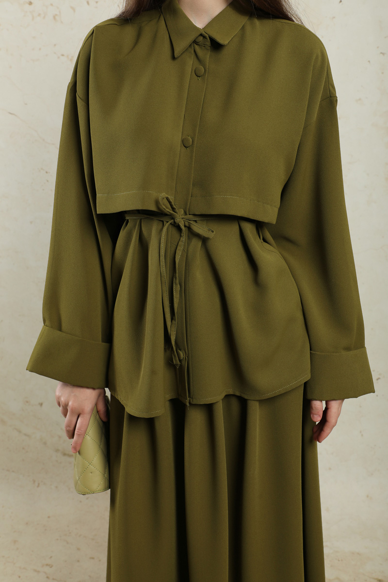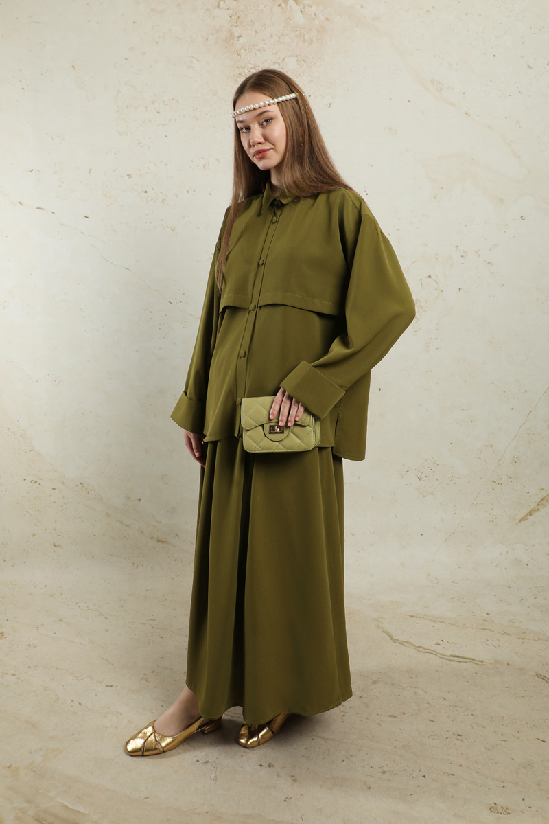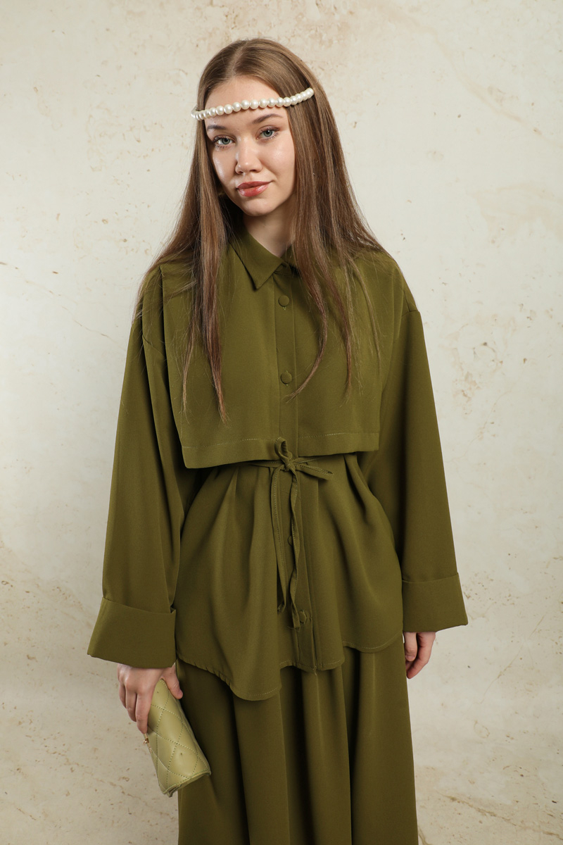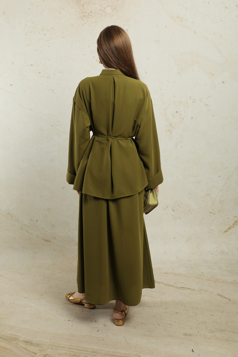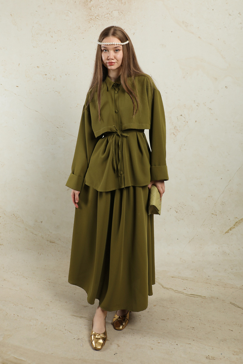 Krep Etek Takım Haki. Düşük kolludur. Arkadan A pile detaylıdır. Önden düğmelidir. Yandan ceplidir. Duble kol detaylıdır. Etek beli lastiklidir. Beli İnce kuşaklıdır. Günlük kullanım ve özel günlerinizde tercih edebilirsiniz.