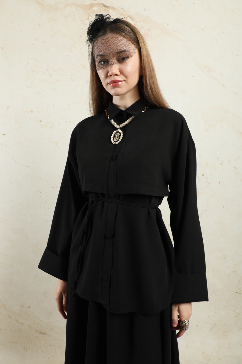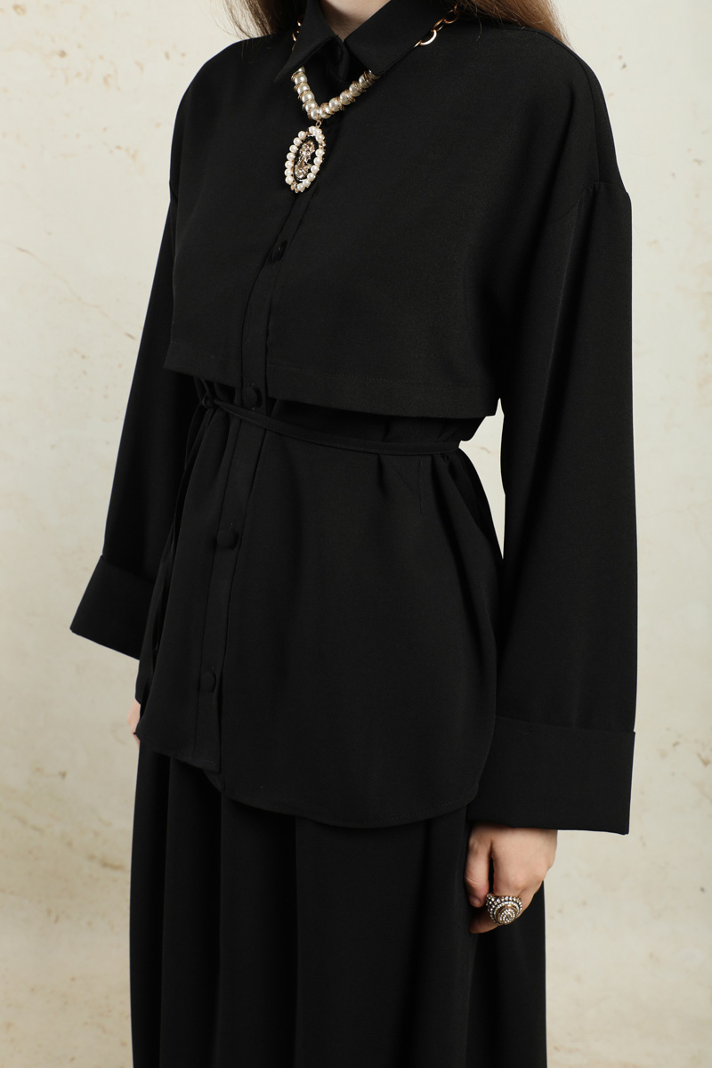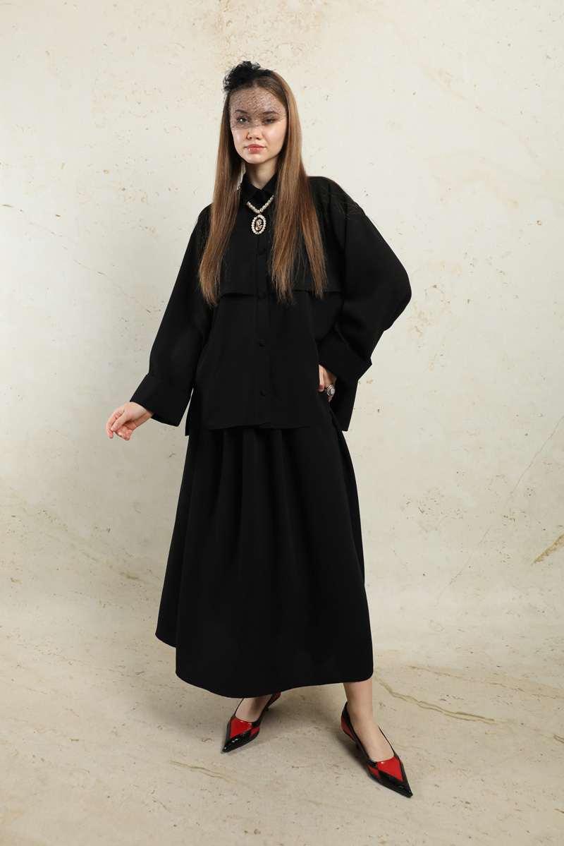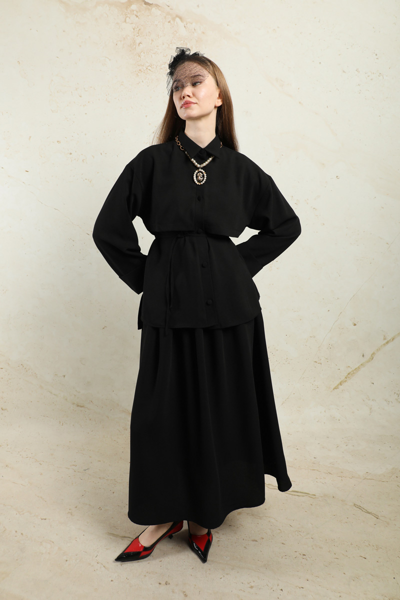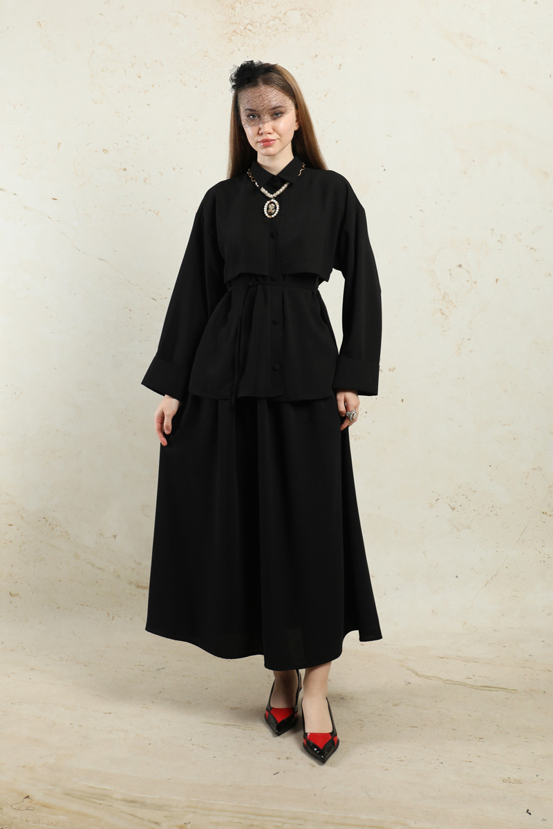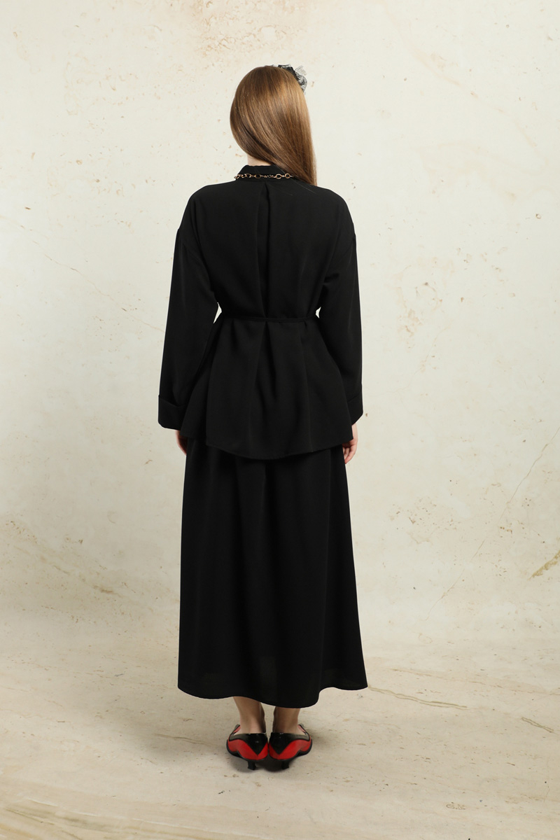 Krep Etek Takım Siyah. Düşük kolludur. Arkadan A pile detaylıdır. Önden düğmelidir. Yandan ceplidir. Duble kol detaylıdır. Etek beli lastiklidir. Beli İnce kuşaklıdır. Günlük kullanım ve özel günlerinizde tercih edebilirsiniz.