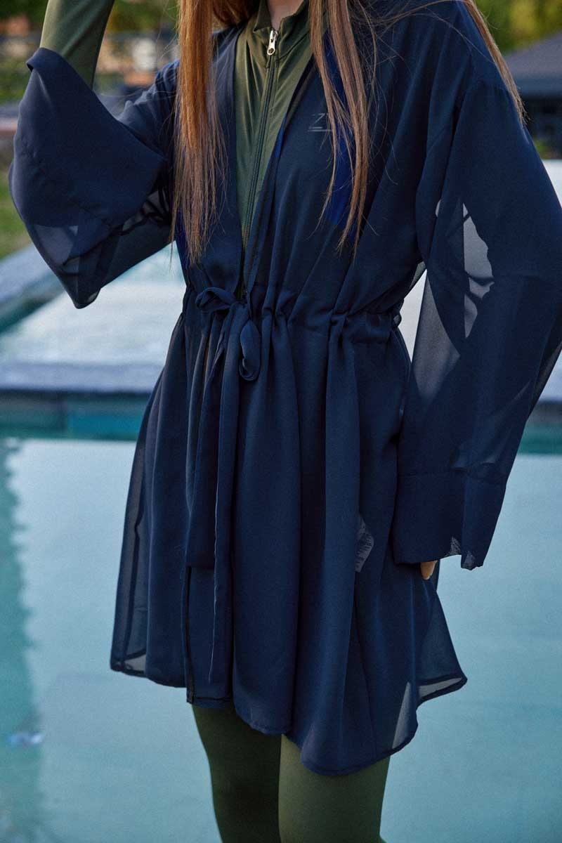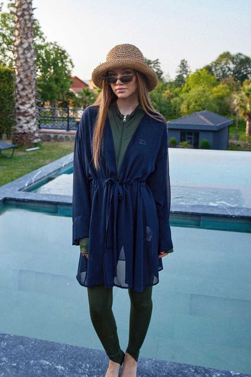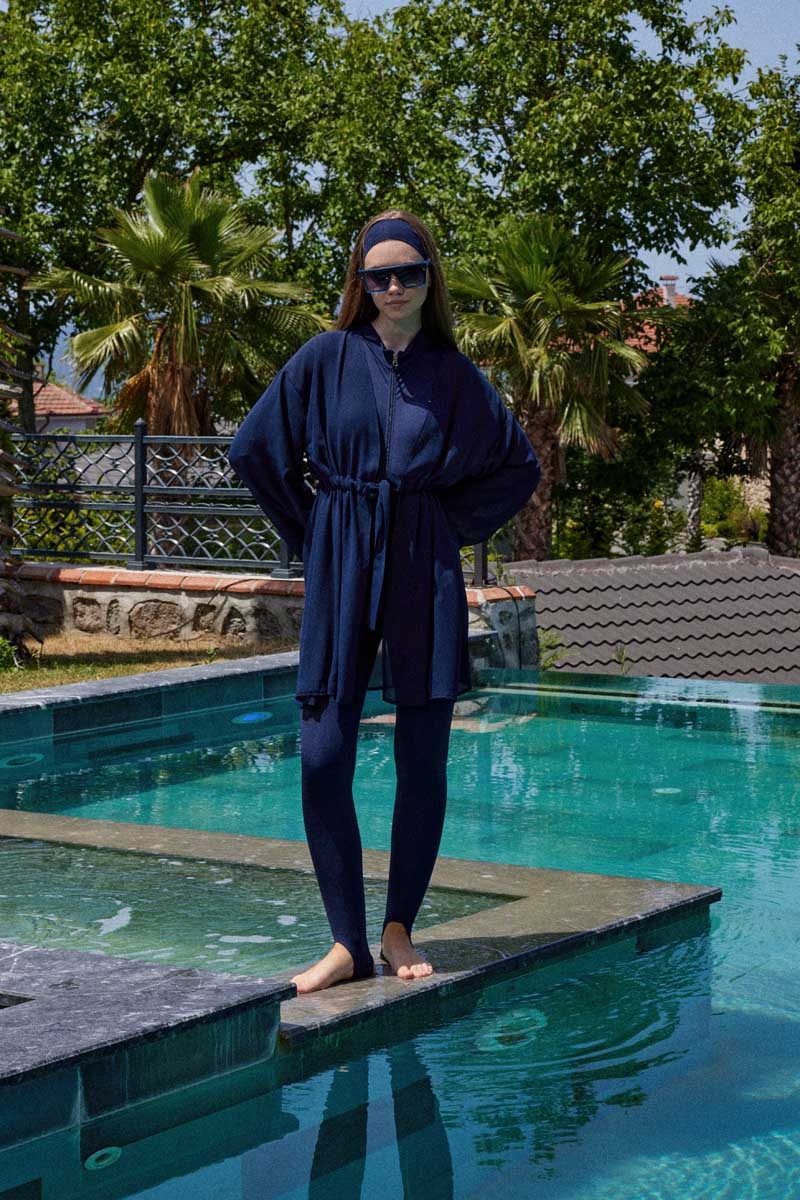 Belden Bağlamalı Kısa Pareo Lacivert. Ayarlanabilir büzgülü bağlaması mevcuttur, double koldur, deniz ve havuzda kullanıma uygundur.(Şapka takıma dahil değildir)