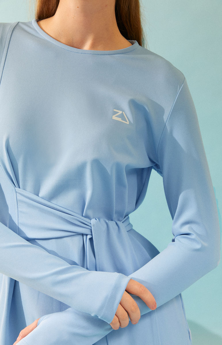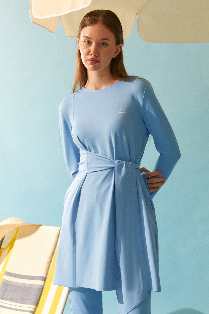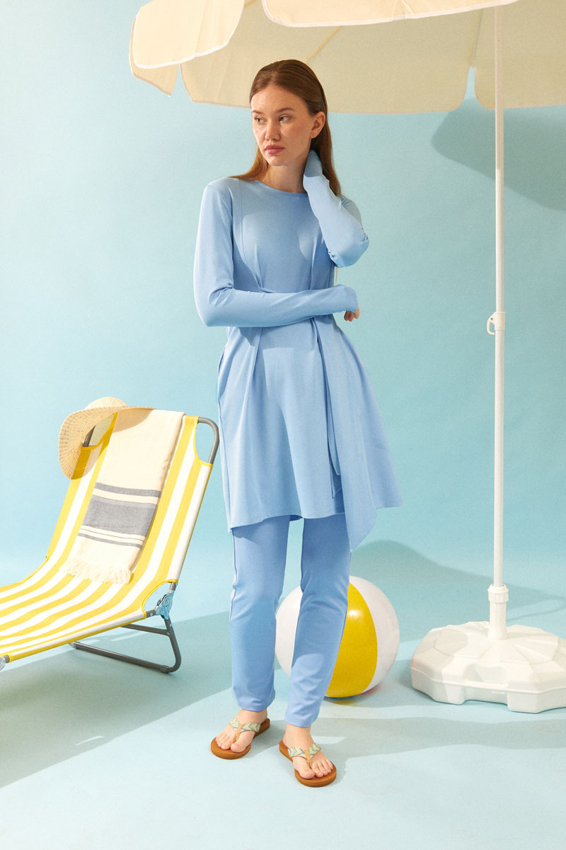 Featuring stitched fabric details on both the front and back, the tunic’s adjustable side tie offers a sporty yet elegant silhouette. Paired with straight-leg, stretch-fit pants, this set provides ease of movement and all-day comfort. Perfect for women seeking a modest and graceful look by the sea or poolside.
