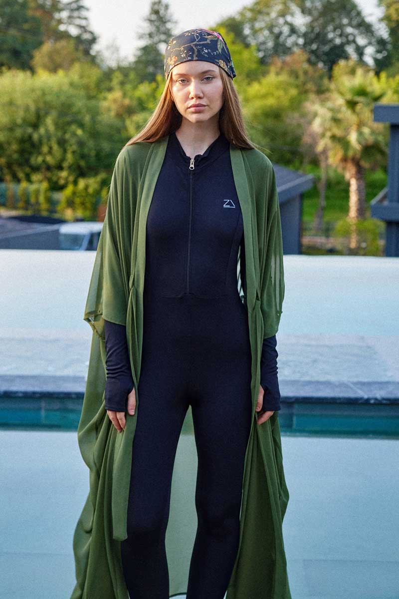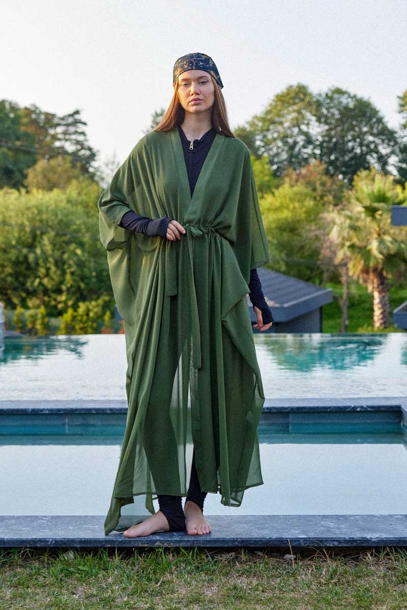 Belden Bağlamalı Uzun Pareo Haki. Ayarlanabilir büzgülü bağlaması mevcuttur, yarasa koldur, deniz ve havuzda kullanıma uygundur.