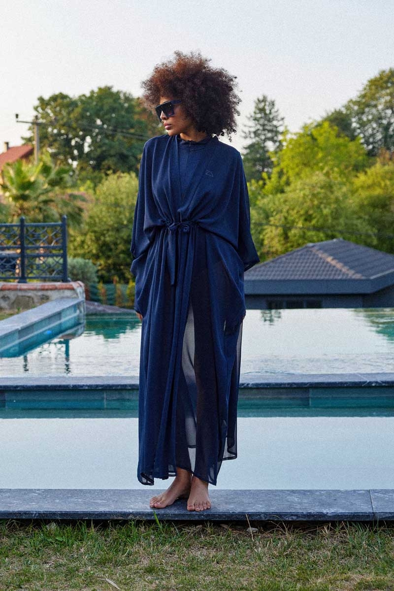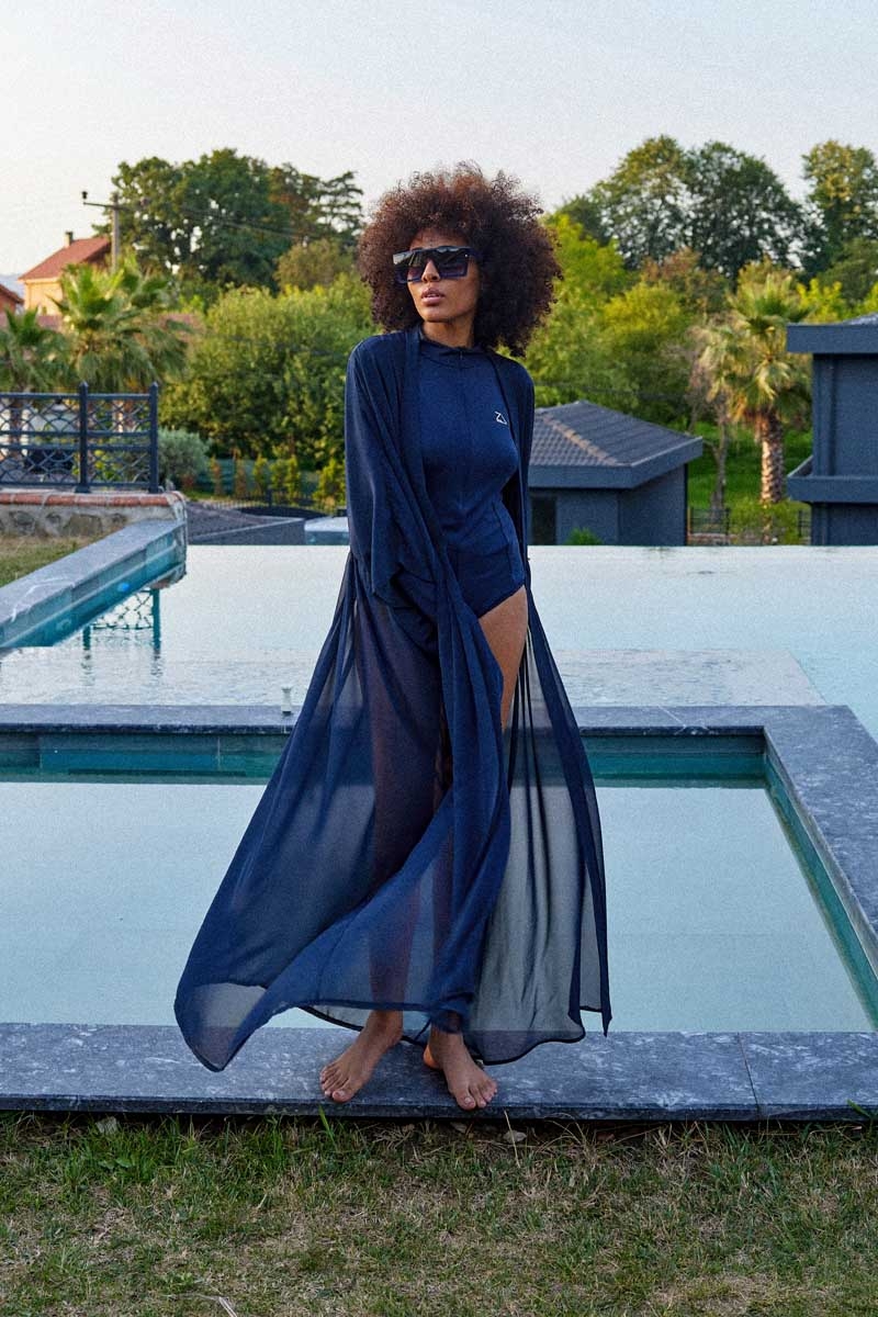 Belden Bağlamalı Uzun Pareo Lacivert. Ayarlanabilir büzgülü bağlaması mevcuttur, yarasa koldur, deniz ve havuzda kullanıma uygundur.