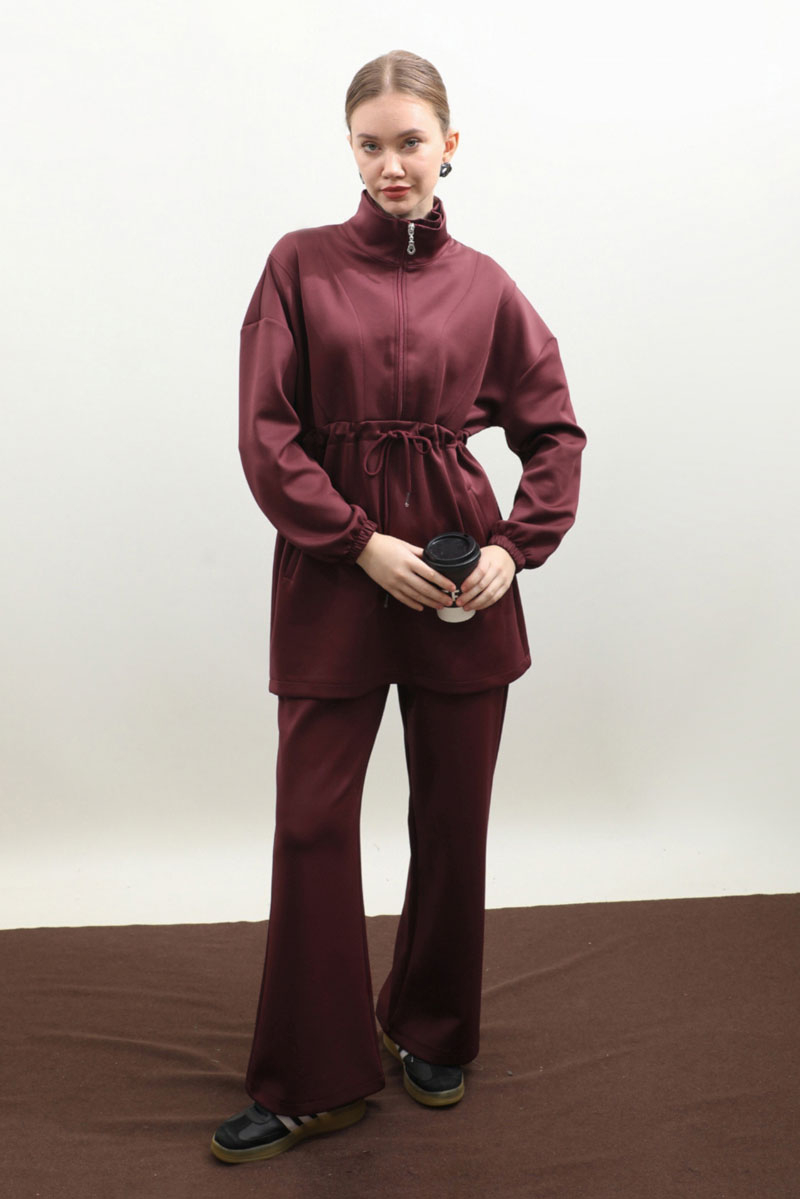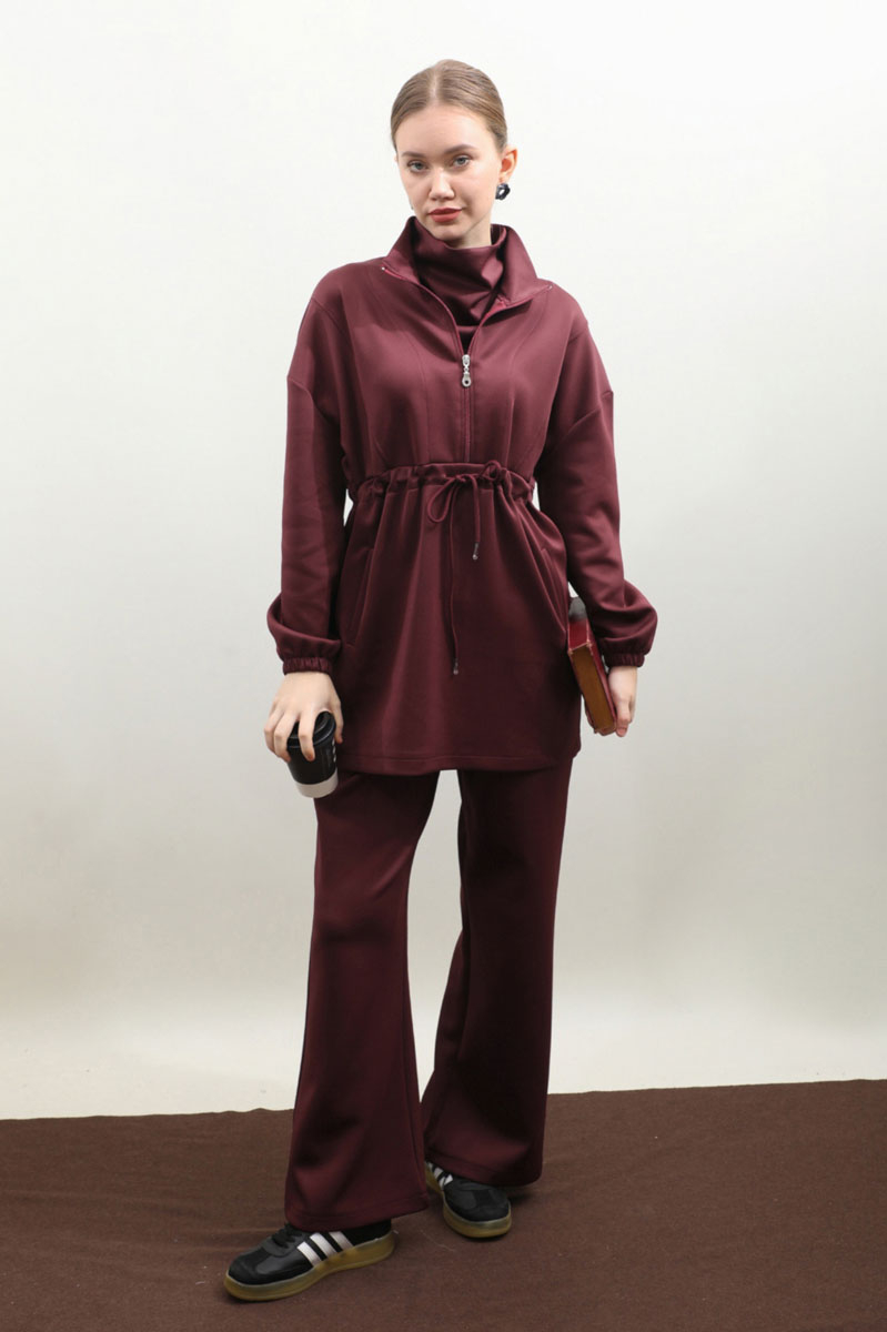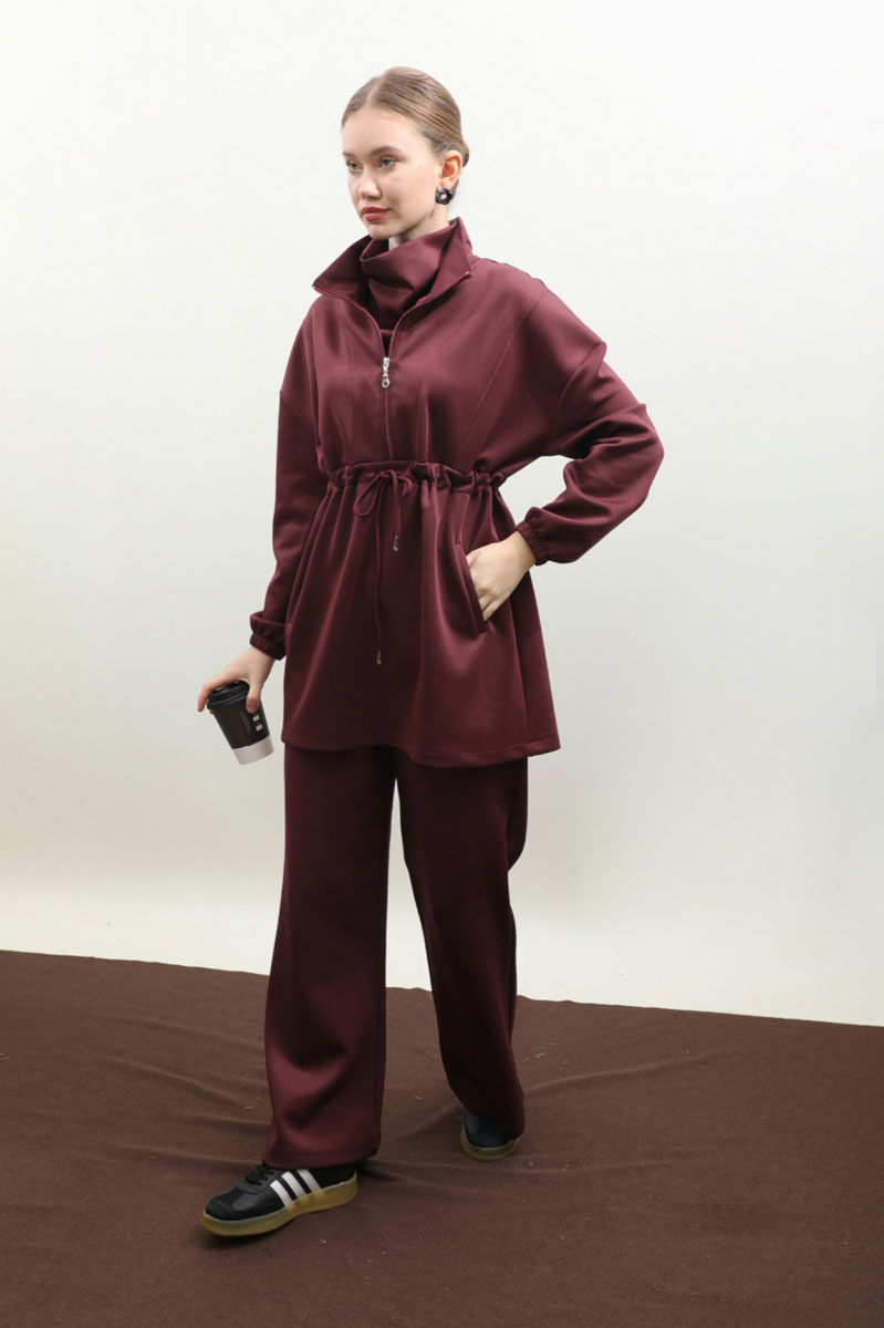 Belden Sıkmalı Eşofman Takım Bordo. Dik yaka, önden fermuarlı, fermuar açılınca iç kısmınızın gözükmemesi için body gibi kumaş eklemesi mevcuttur. Önden dikiş detaylı, belden sıkmalı, yandan cepli, düşük omuz, manşeti lastiklidir. Pantolon beli lastikli, bol paçadır. Bahar ve kış mevsimleri için uygundur.
