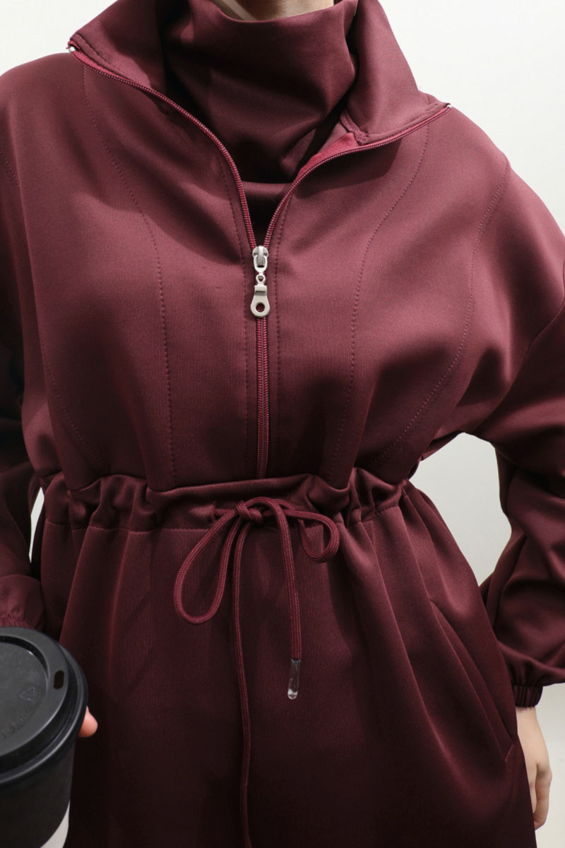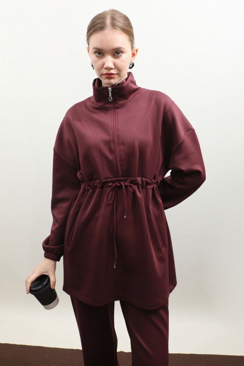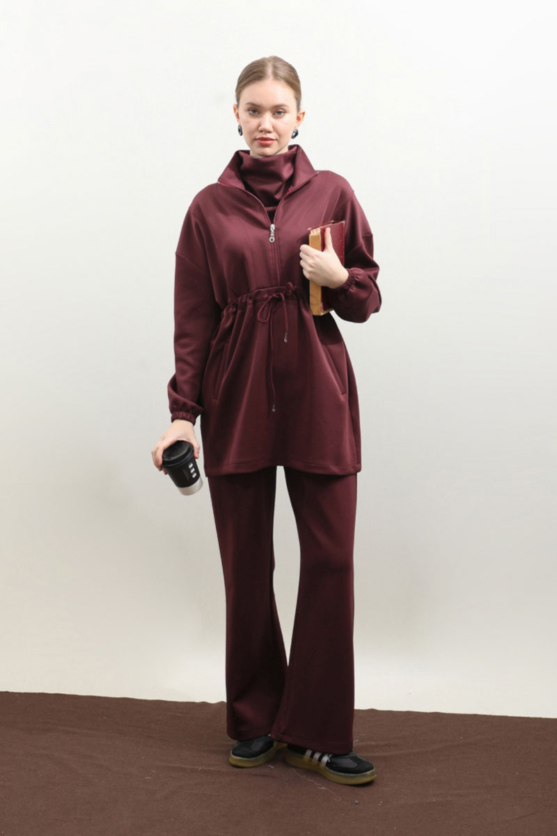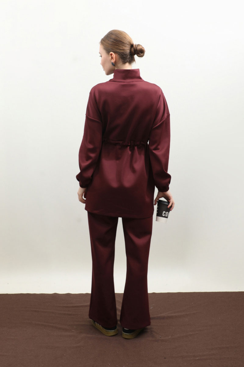 Belden Sıkmalı Eşofman Takım Bordo. Dik yaka, önden fermuarlı, fermuar açılınca iç kısmınızın gözükmemesi için body gibi kumaş eklemesi mevcuttur. Önden dikiş detaylı, belden sıkmalı, yandan cepli, düşük omuz, manşeti lastiklidir. Pantolon beli lastikli, bol paçadır. Bahar ve kış mevsimleri için uygundur.