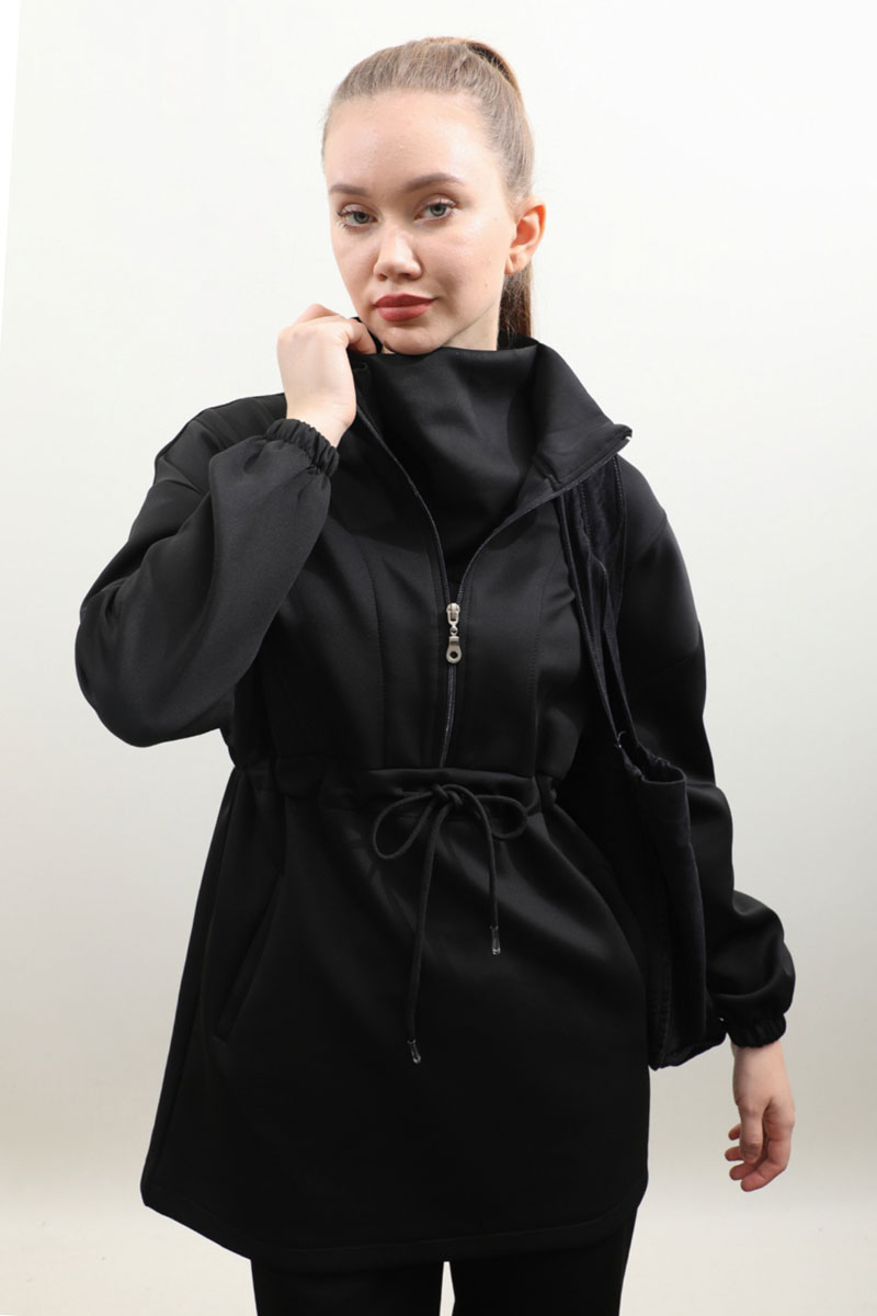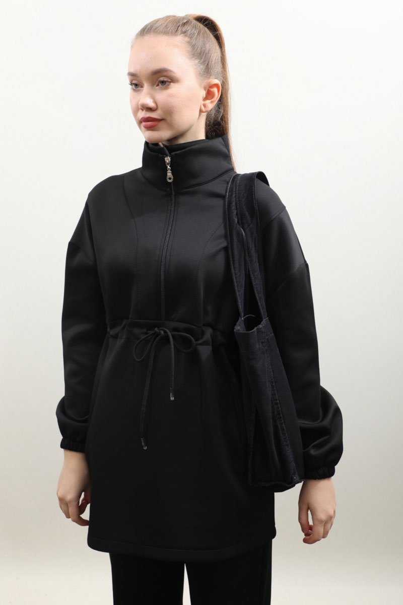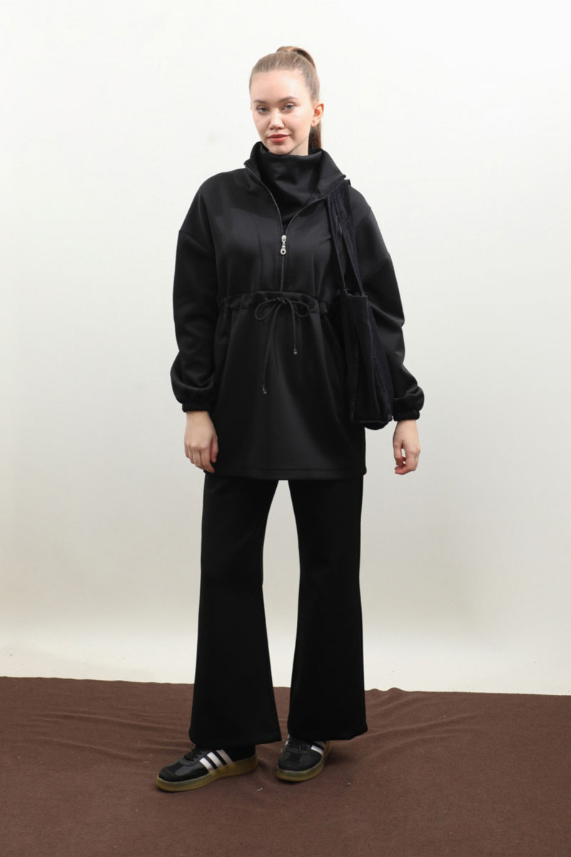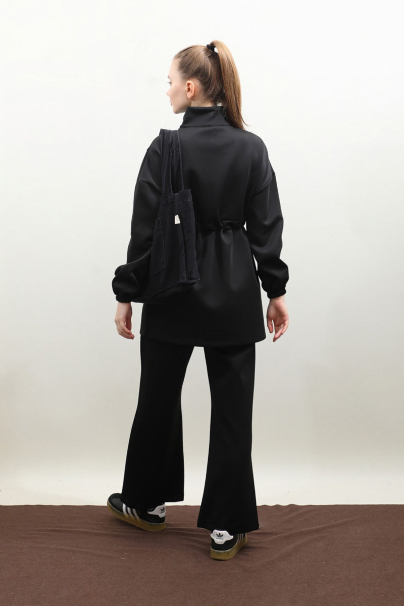 Belden Sıkmalı Eşofman Takım Siyah Dik yaka, önden fermuarlı, fermuar açılınca iç kısmınızın gözükmemesi için body gibi kumaş eklemesi mevcuttur. Önden dikiş detaylı, belden sıkmalı, yandan cepli, düşük omuz, manşeti lastiklidir. Pantolon beli lastikli, bol paçadır. Bahar ve kış mevsimleri için uygundur.
