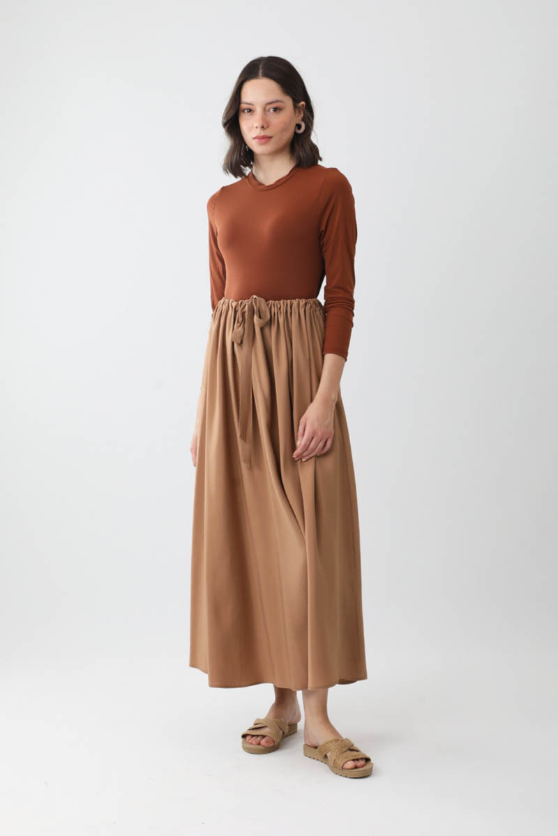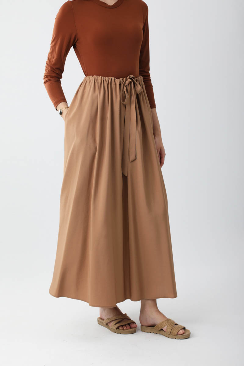 Beli Büzgülü Etek Açık Taba. Beli tünellidir, ayarlanabilir bağlama detaylıdır, yandan ceplidir, fermuarsız ve astarsızdır. Günlük kullanım için uygundur.