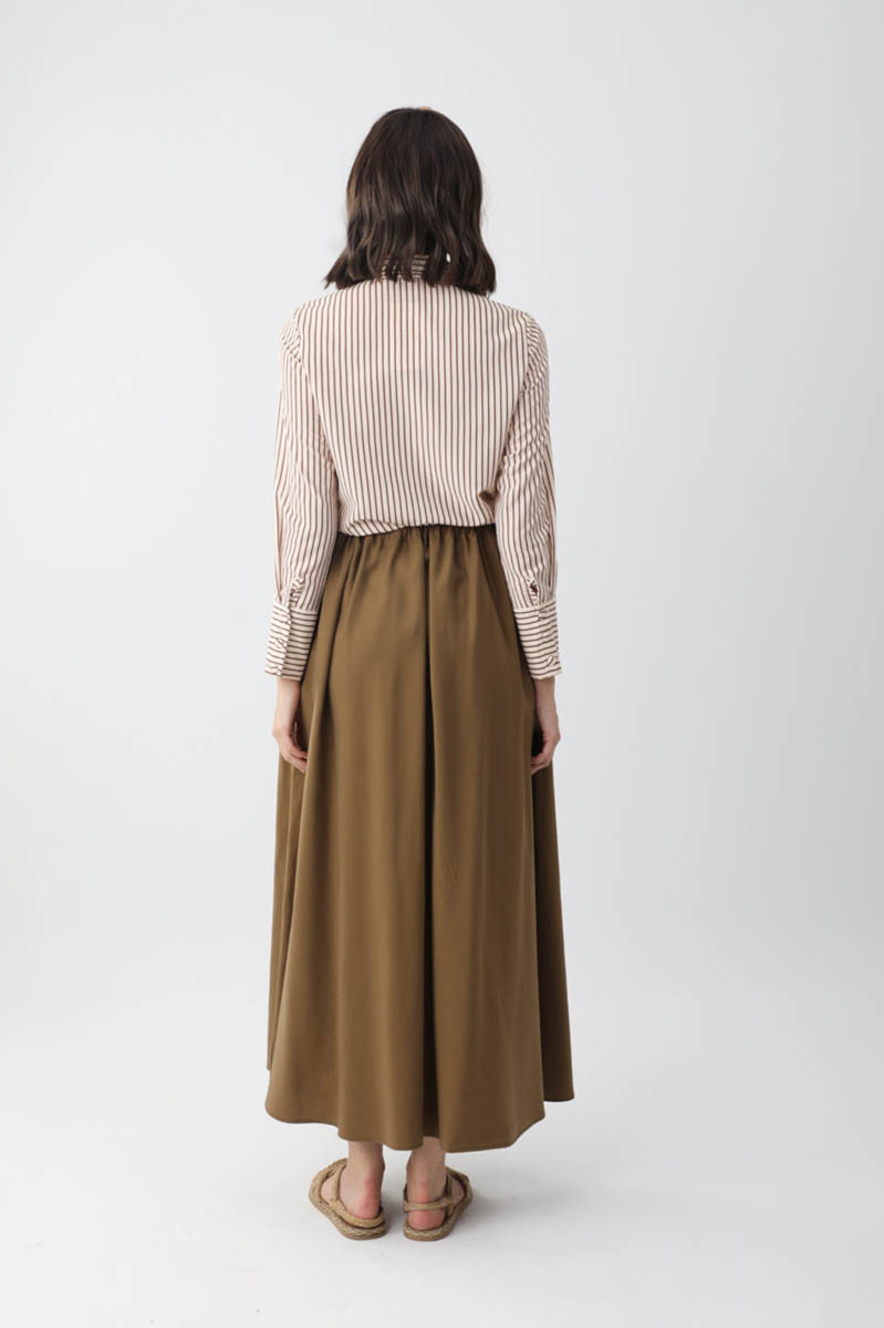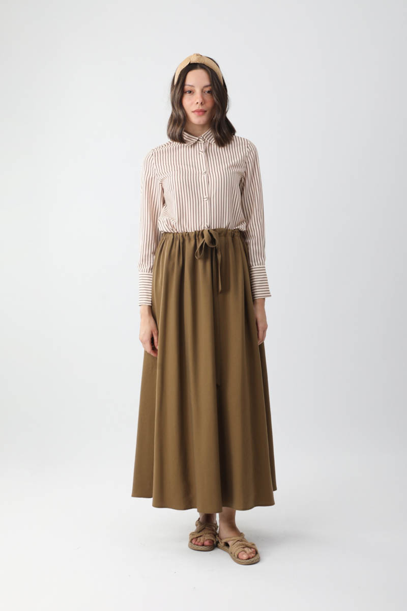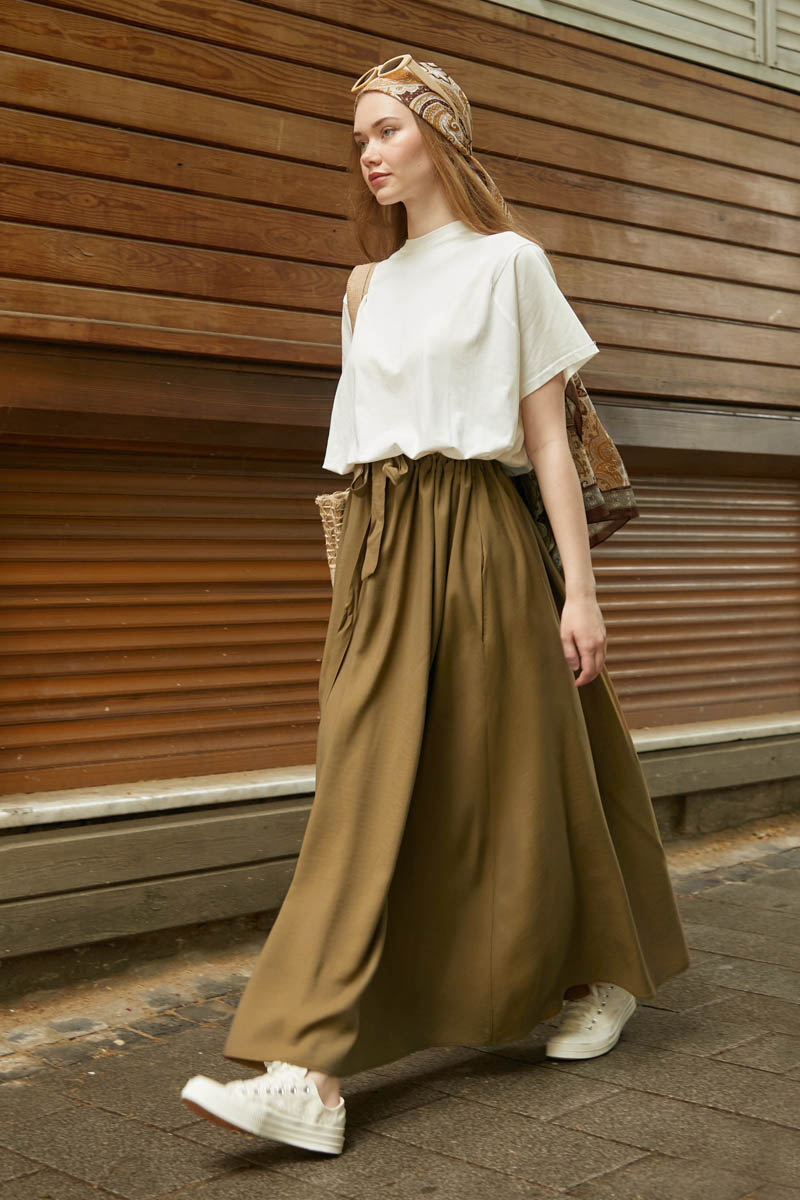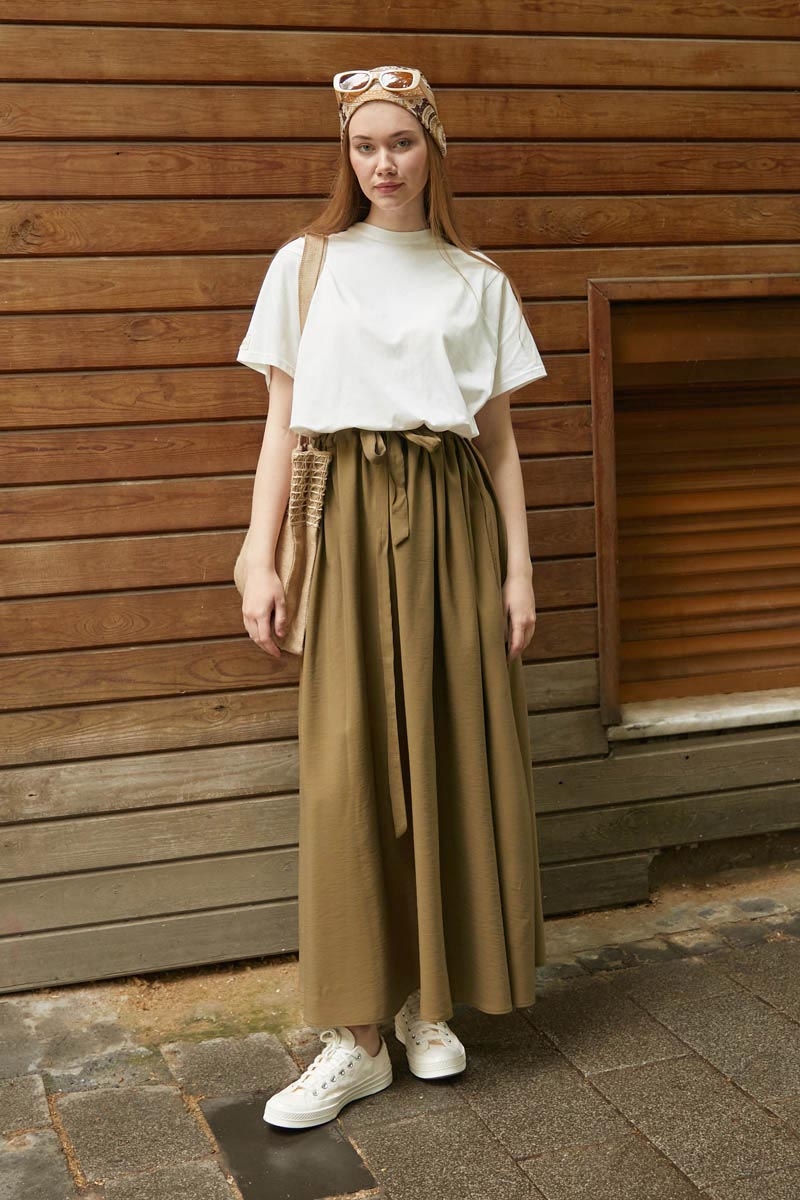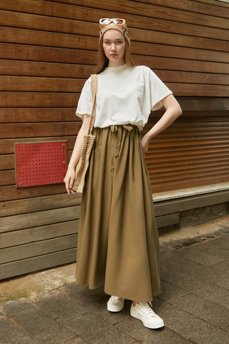 Beli Büzgülü Etek Koyu Bronz. Beli tünellidir, ayarlanabilir bağlama detaylıdır, yandan ceplidir, fermuarsız ve astarsızdır. Günlük kullanım için uygundur.