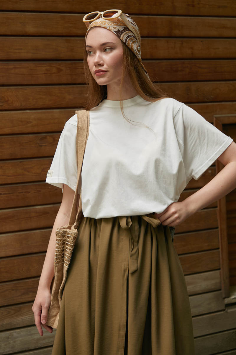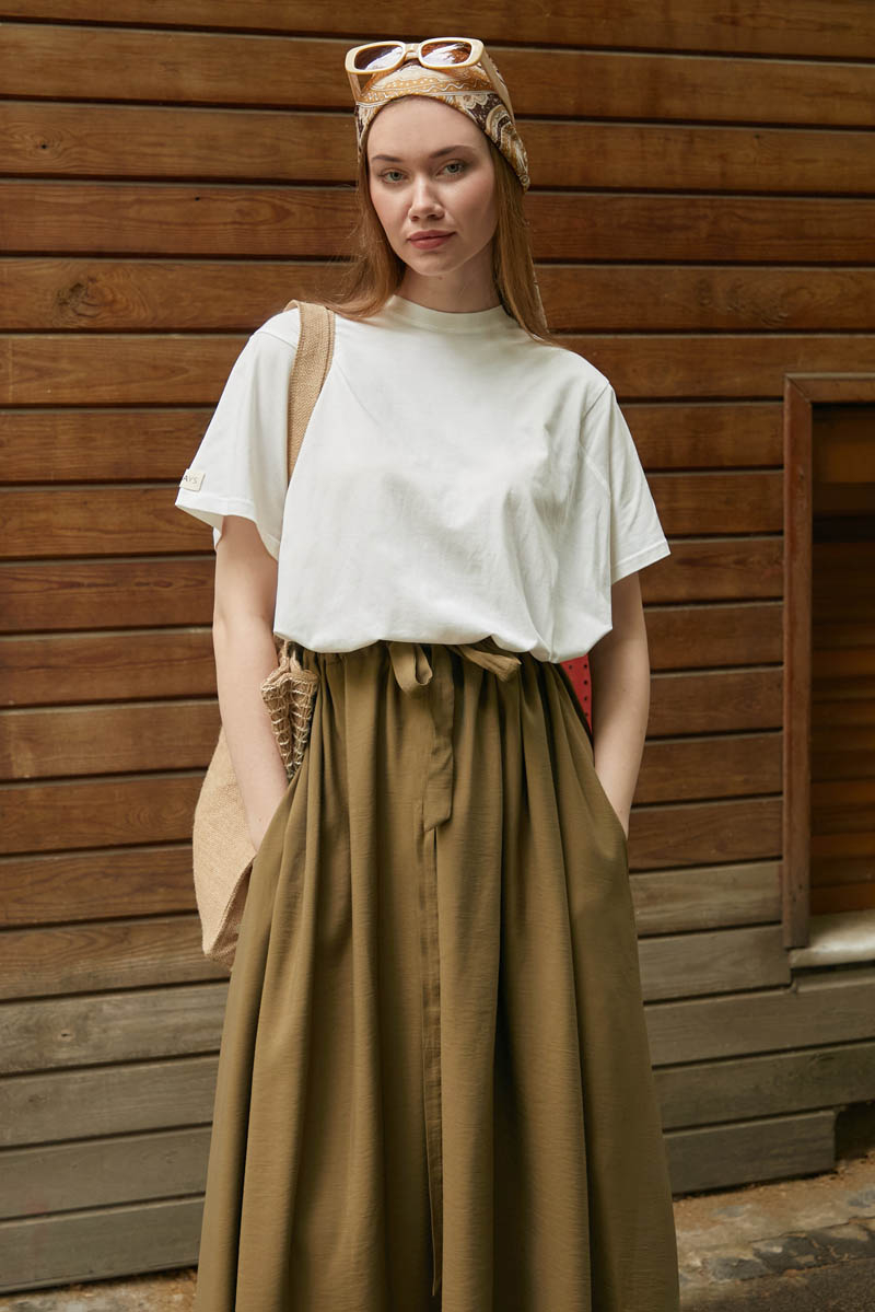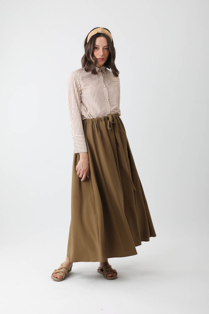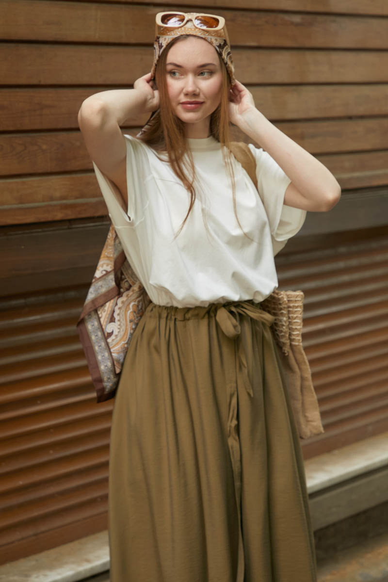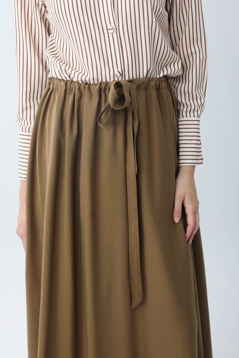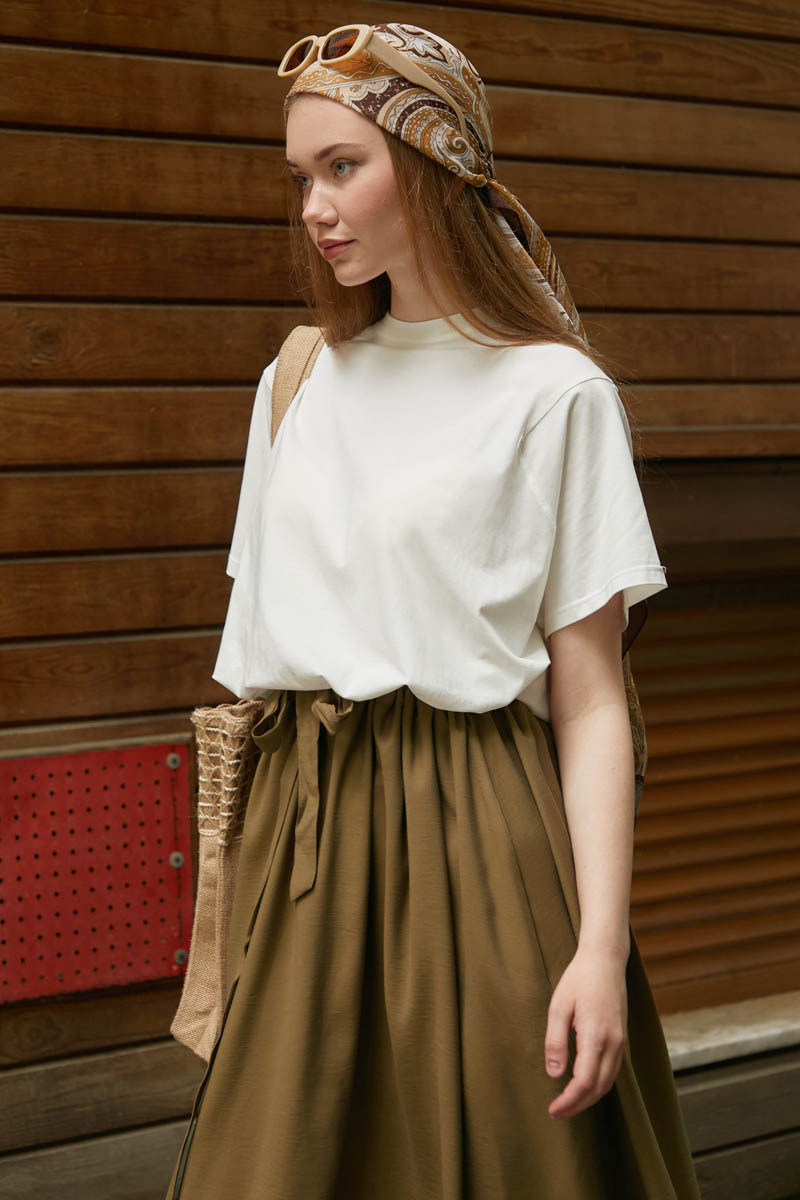 Beli Büzgülü Etek Koyu Bronz. Beli tünellidir, ayarlanabilir bağlama detaylıdır, yandan ceplidir, fermuarsız ve astarsızdır. Günlük kullanım için uygundur.