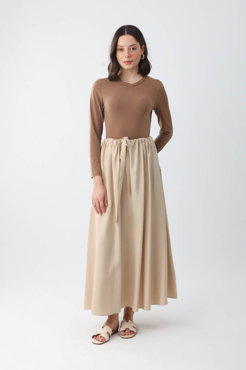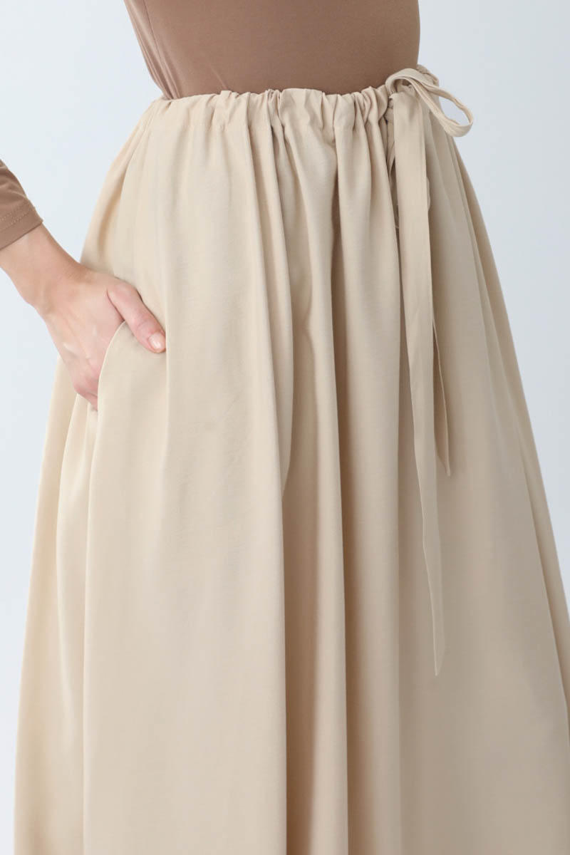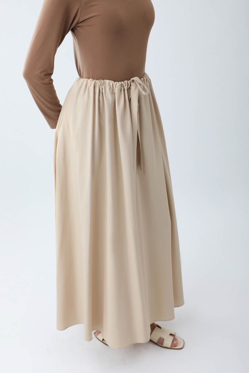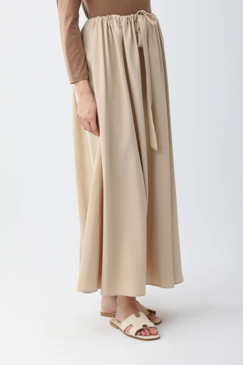 Beli Büzgülü Etek Taş. Beli tünellidir, ayarlanabilir bağlama detaylıdır, yandan ceplidir, fermuarsız ve astarsızdır. Günlük kullanım için uygundur.