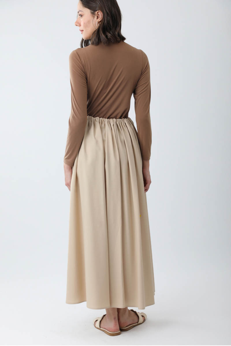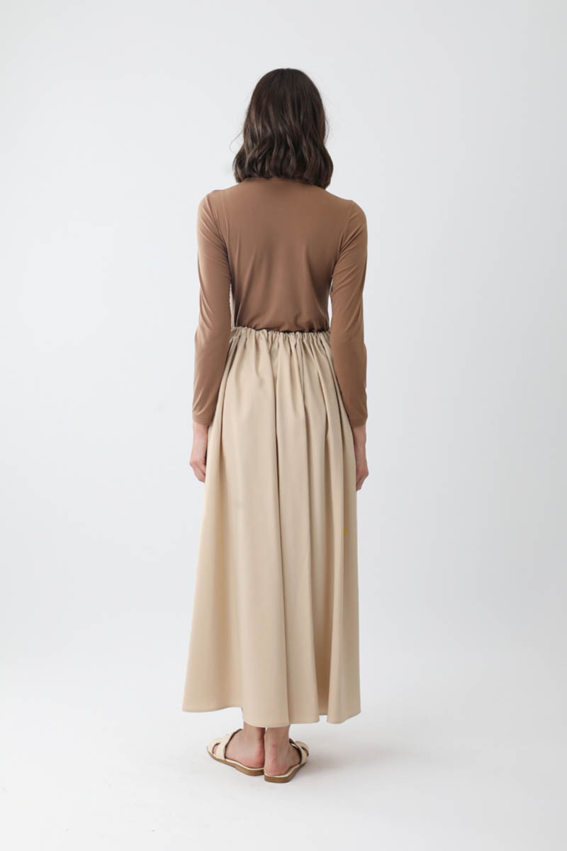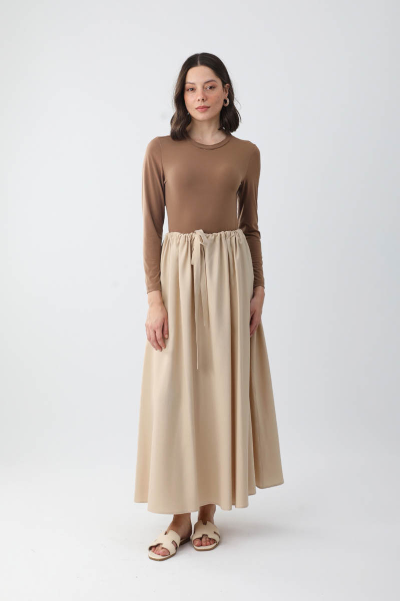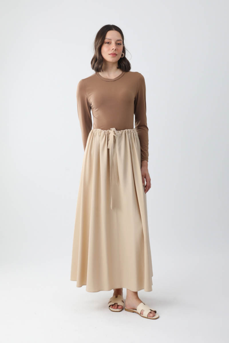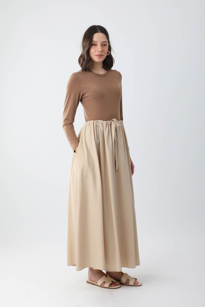 Beli Büzgülü Etek Taş. Beli tünellidir, ayarlanabilir bağlama detaylıdır, yandan ceplidir, fermuarsız ve astarsızdır. Günlük kullanım için uygundur.