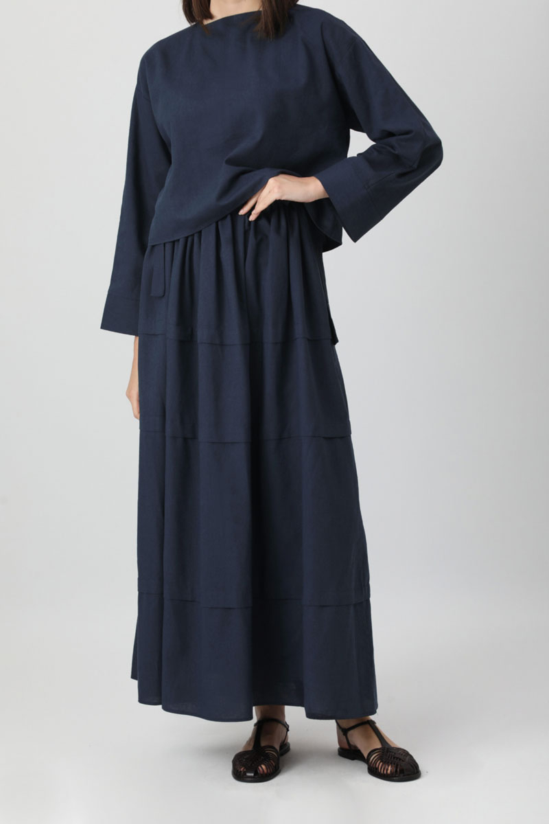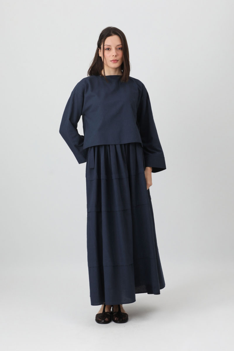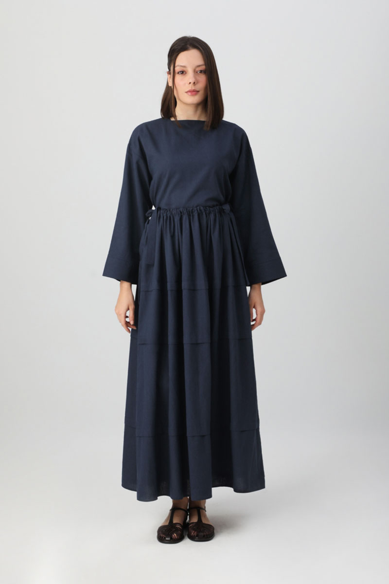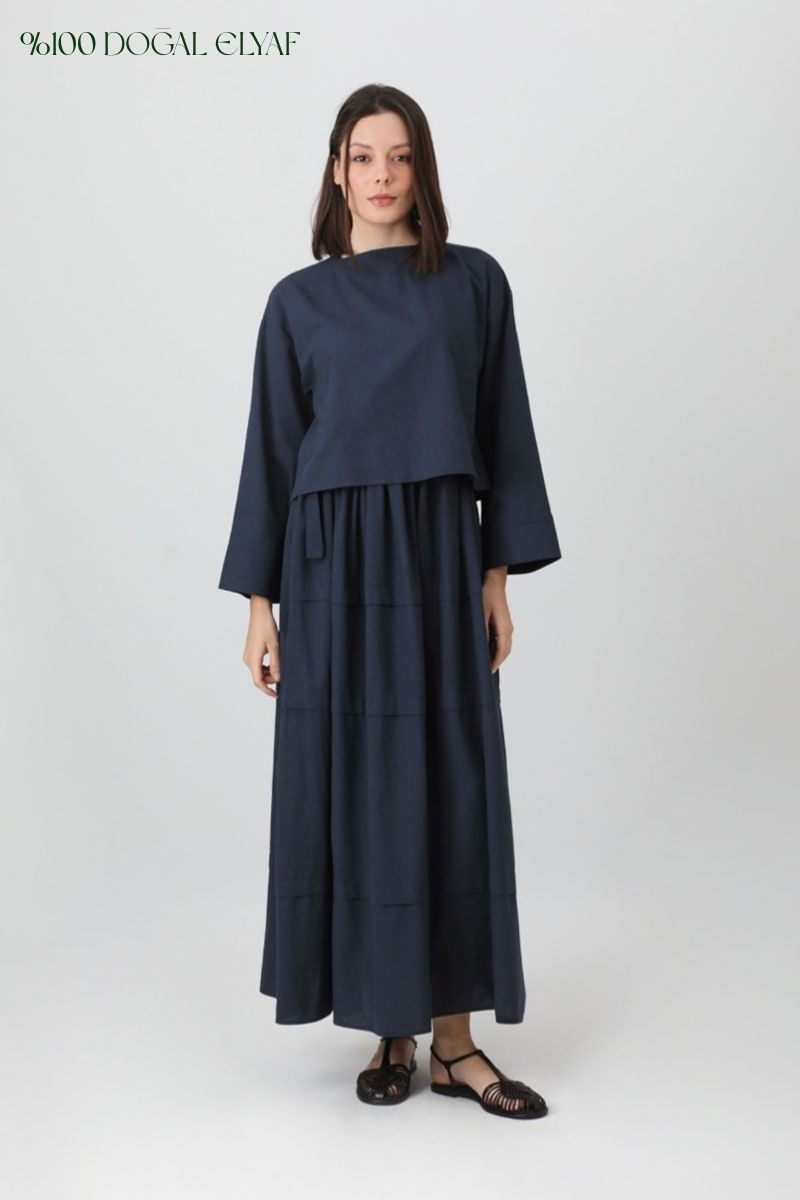Beli Tünelli Etek Takım Lacivert. Üst Bluz kare yakadır, arkadan fermuarlıdır, yandan fermuarlıdır, düşük omuzludur, Etek, beli tünel ve büzgülüdür, pilelidir, yanlardan bağlama detayldır, etek üstü aller parça dikiş detaylıdır, cepsizdir, astarsızdır, Günlük kullanım ve özel günlerinizde tercih edebilirsiniz.