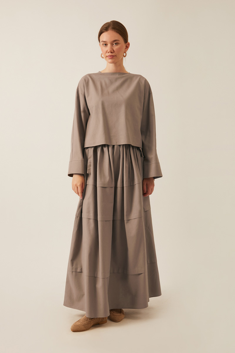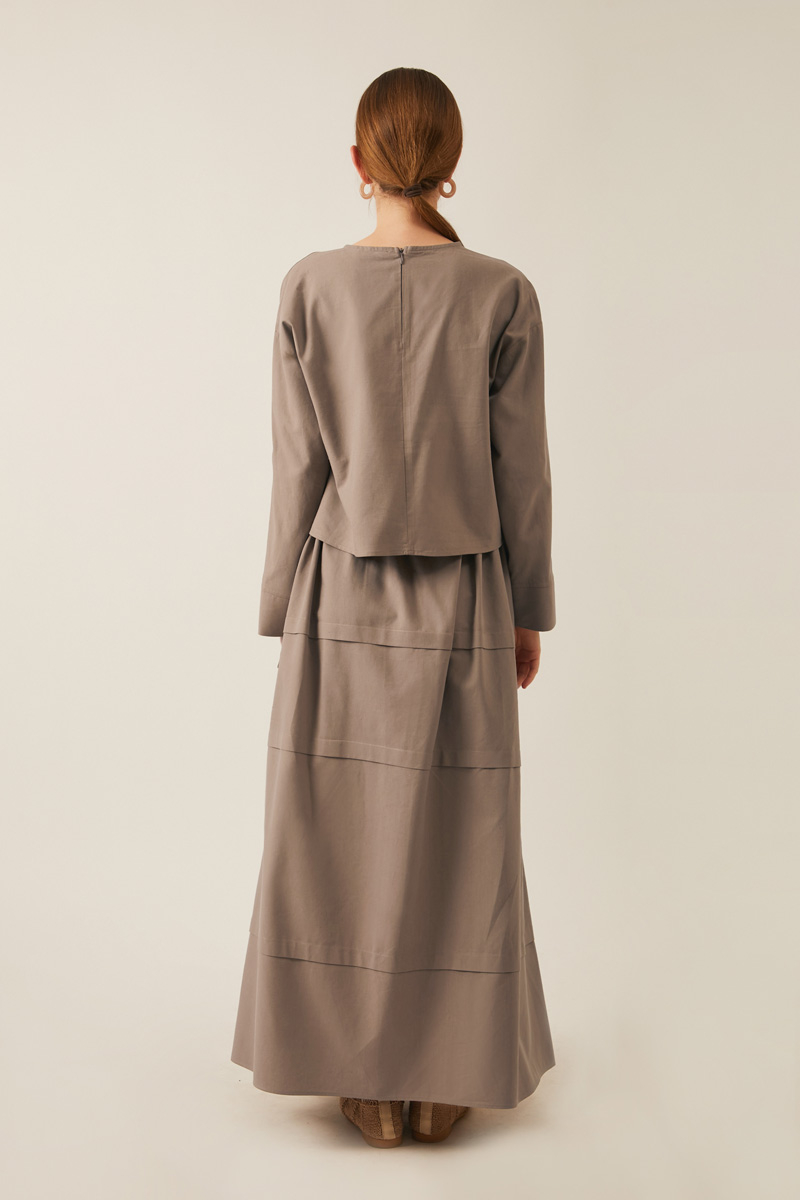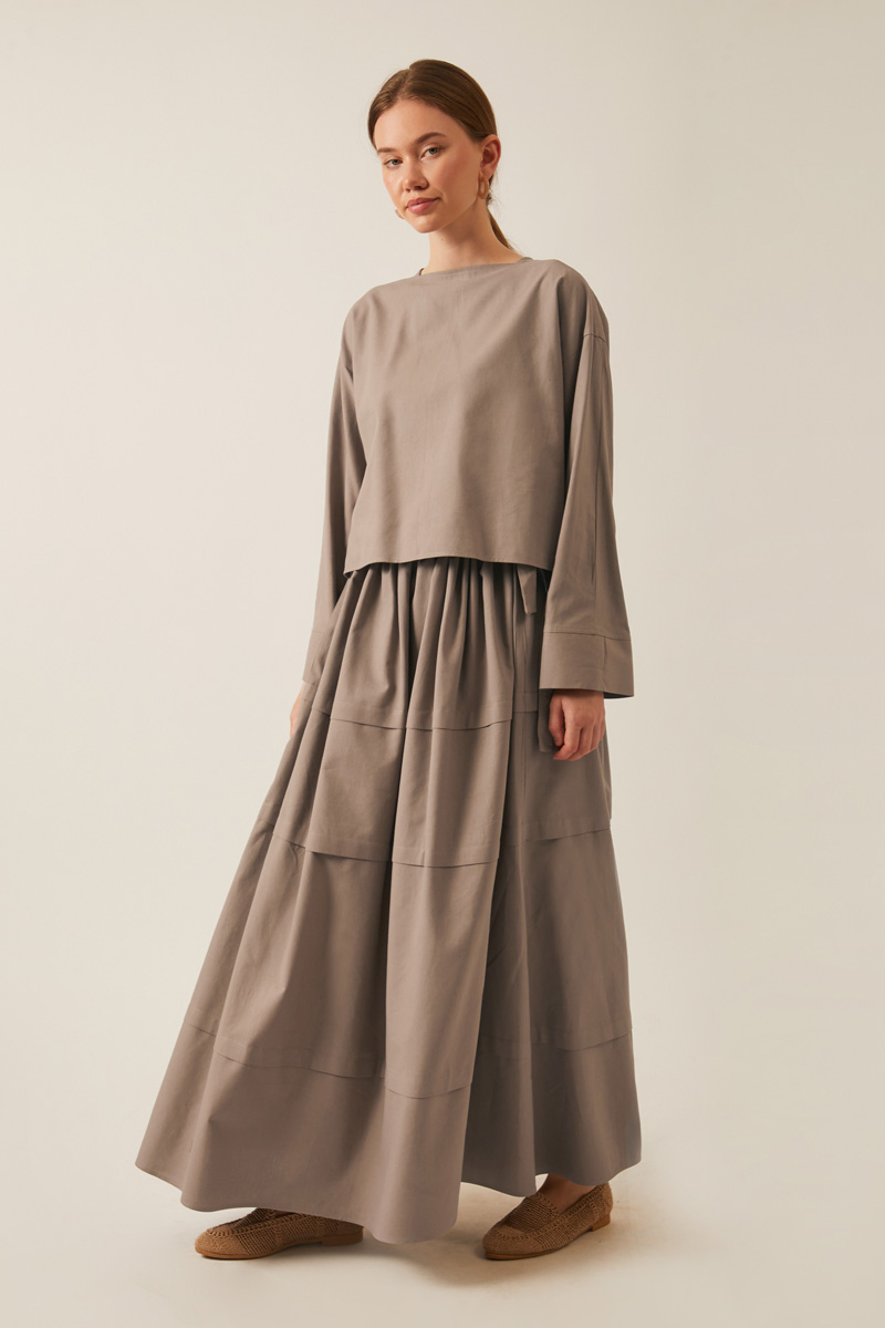 Beli Tünelli Etek Takım Vizon. Üst Bluz kare yakadır, arkadan fermuarlıdır, yandan fermuarlıdır, düşük omuzludur, Etek, beli tünel ve büzgülüdür, pilelidir, yanlardan bağlama detayldır, etek üstü aller parça dikiş detaylıdır, cepsizdir, astarsızdır, Günlük kullanım ve özel günlerinizde tercih edebilirsiniz.