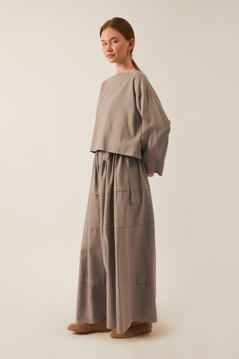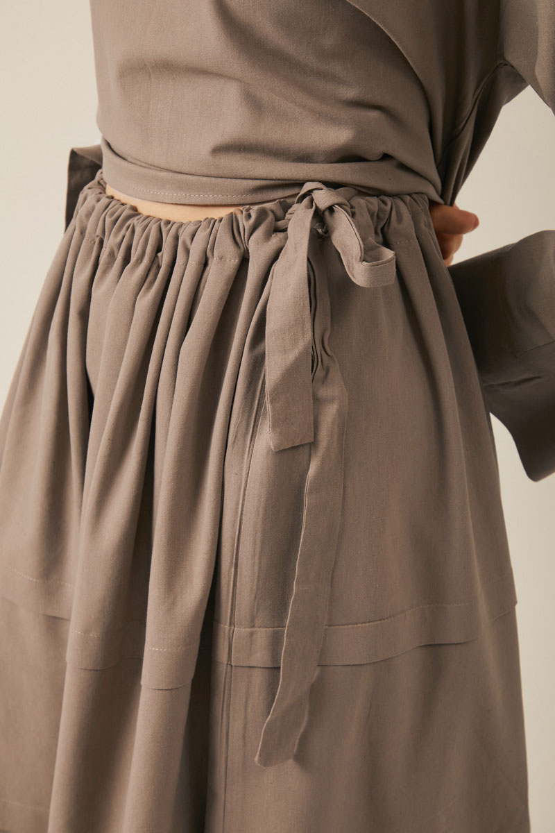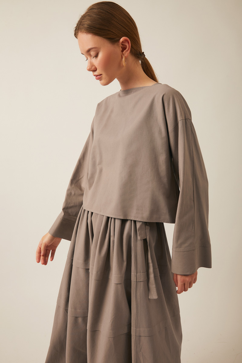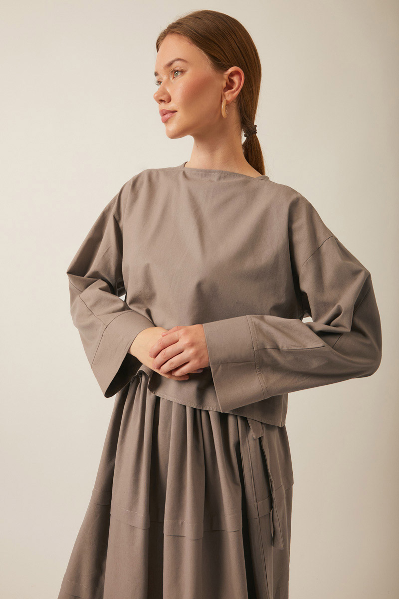 Beli Tünelli Etek Takım Vizon. Üst Bluz kare yakadır, arkadan fermuarlıdır, yandan fermuarlıdır, düşük omuzludur, Etek, beli tünel ve büzgülüdür, pilelidir, yanlardan bağlama detayldır, etek üstü aller parça dikiş detaylıdır, cepsizdir, astarsızdır, Günlük kullanım ve özel günlerinizde tercih edebilirsiniz.