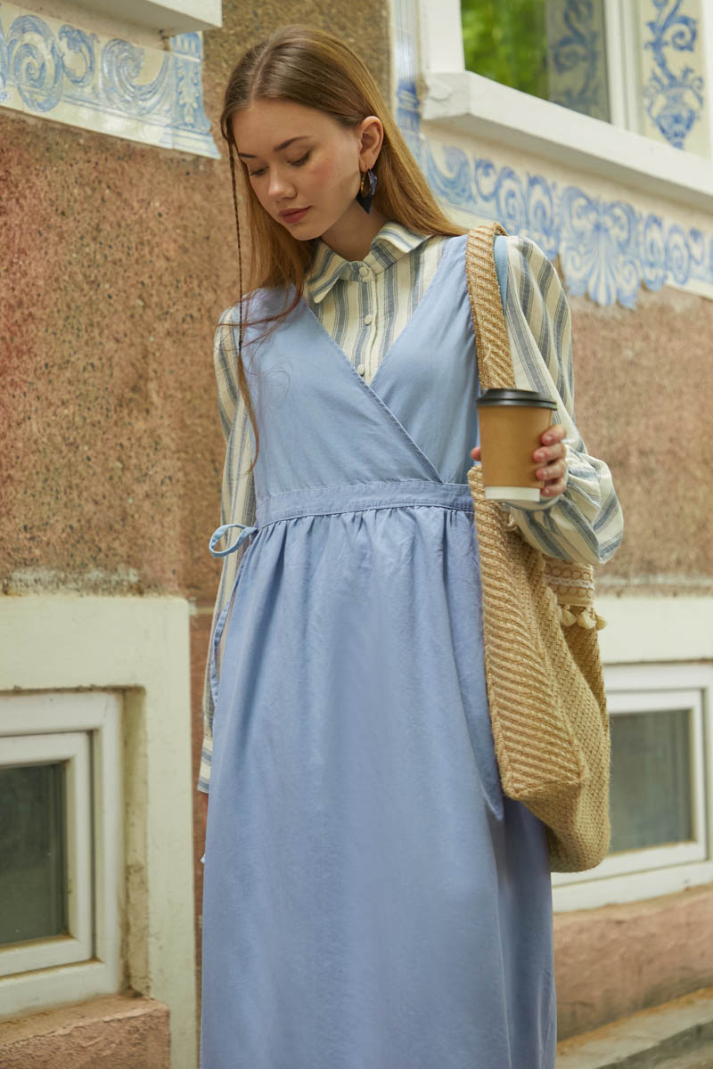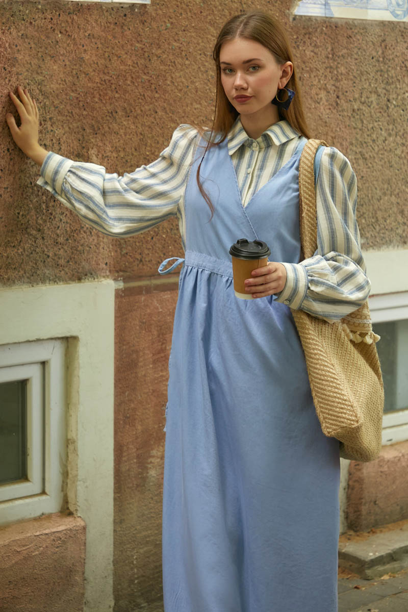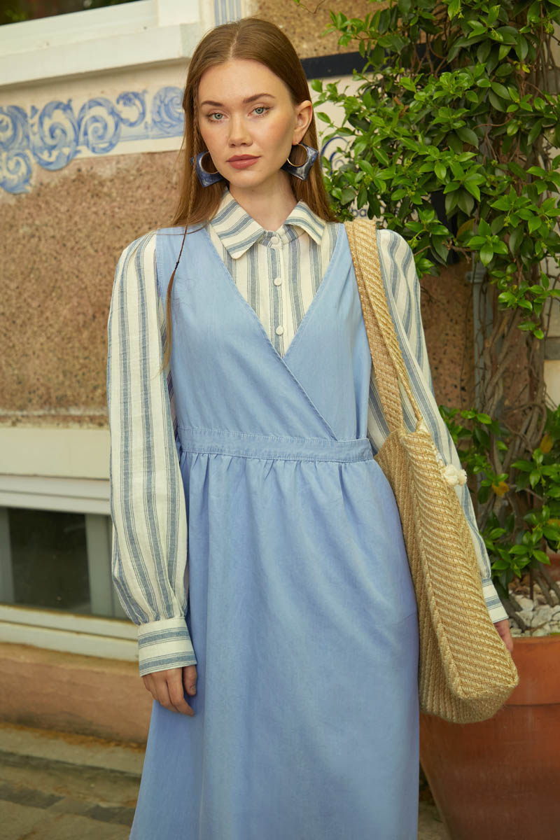 Berin Denim Jile Açık Mavi. V yakadır, yandan bağlamalıdır,beli büzgü detaylıdır, önden pilelidir, yandan gizli ceplidir, astarsızdır.