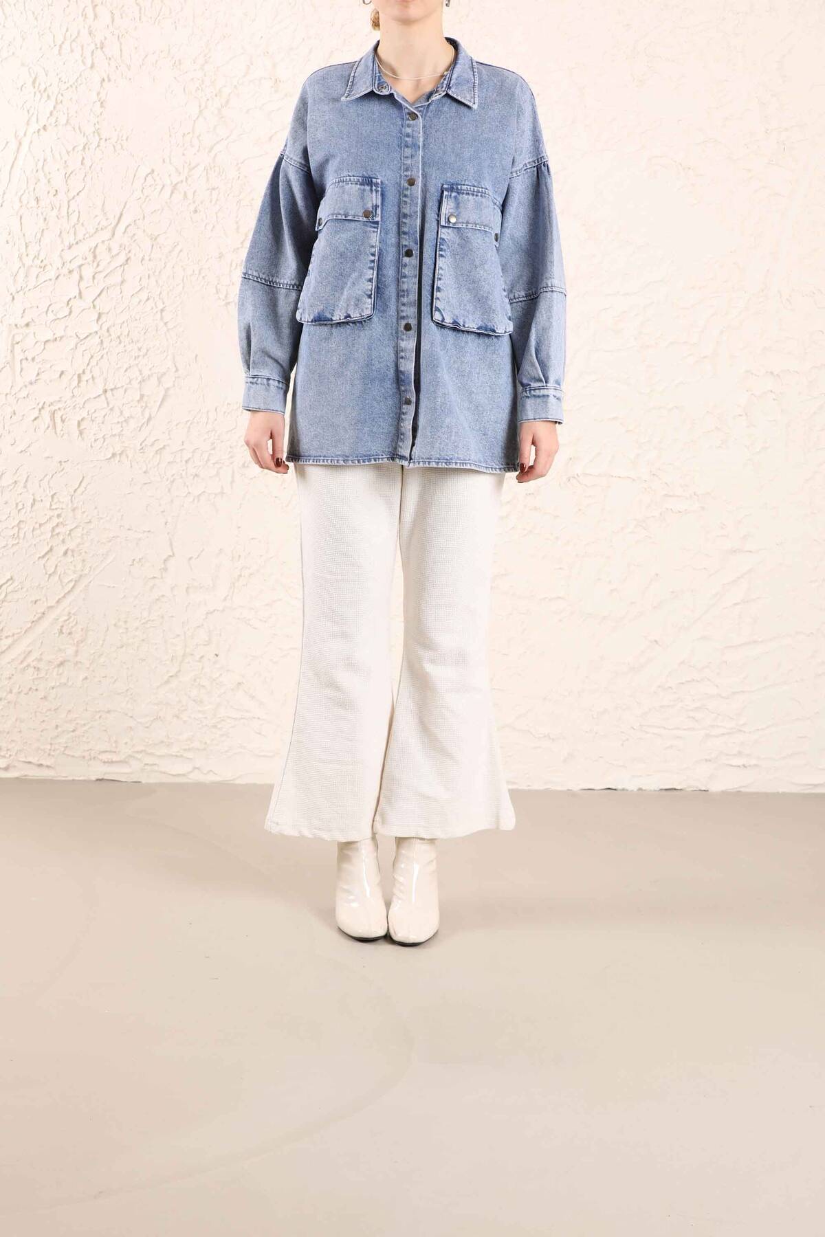 Big Pocket Denim Jacket Light Blue. The shirt is collar. Front snap fastener. Large pocket detail. It can be used as optional shirt and jacket.
