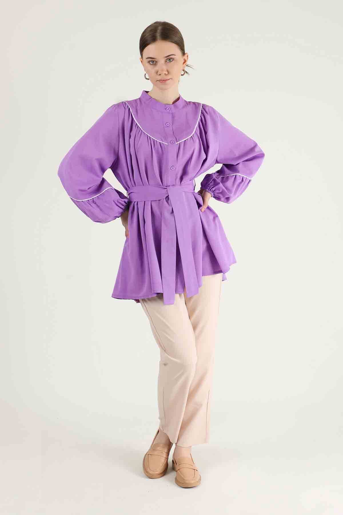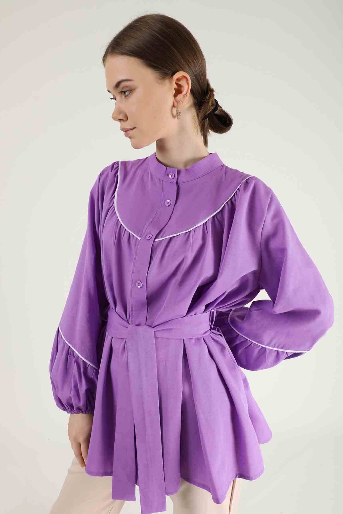 Piping Detail Belted Shirt Lilac. It is belted. The sleeves and collar are piping. The cuff is elastic. The front is shirred. It is upright. You can choose it for your daily use and special days.