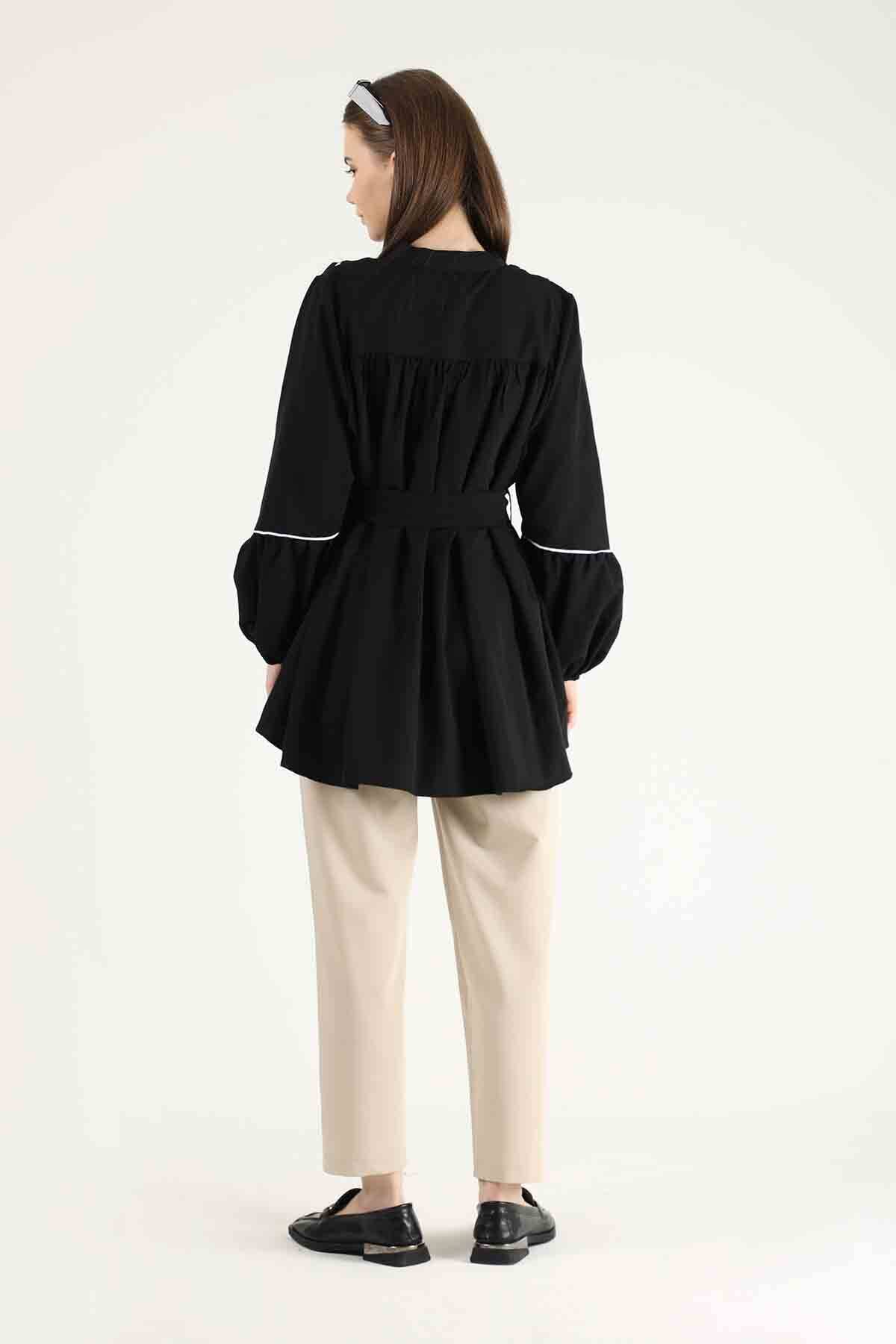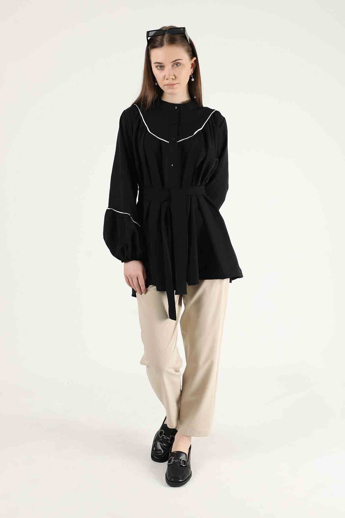 Biye Detay Kuşaklı Gömlek Siyah. Kuşaklıdır. Kolları ve yakası biyelidir. Manşeti lastiklidir. Önü büzgülüdür. Dik yakalıdır. Günlük kullanım ve Özel günlerinizde tercih edebilirsiniz.