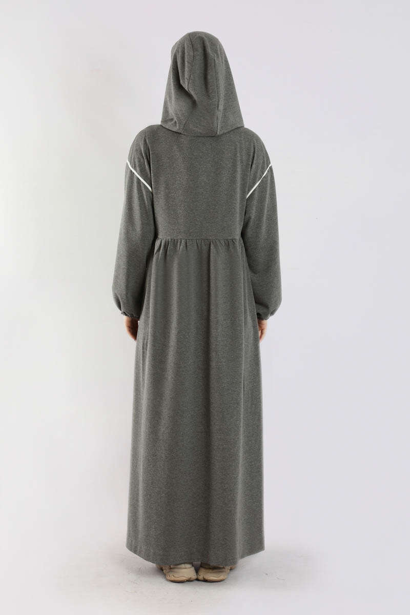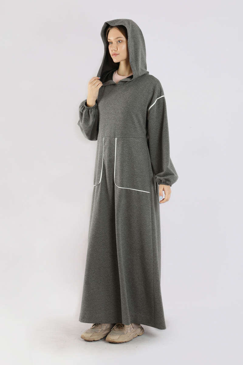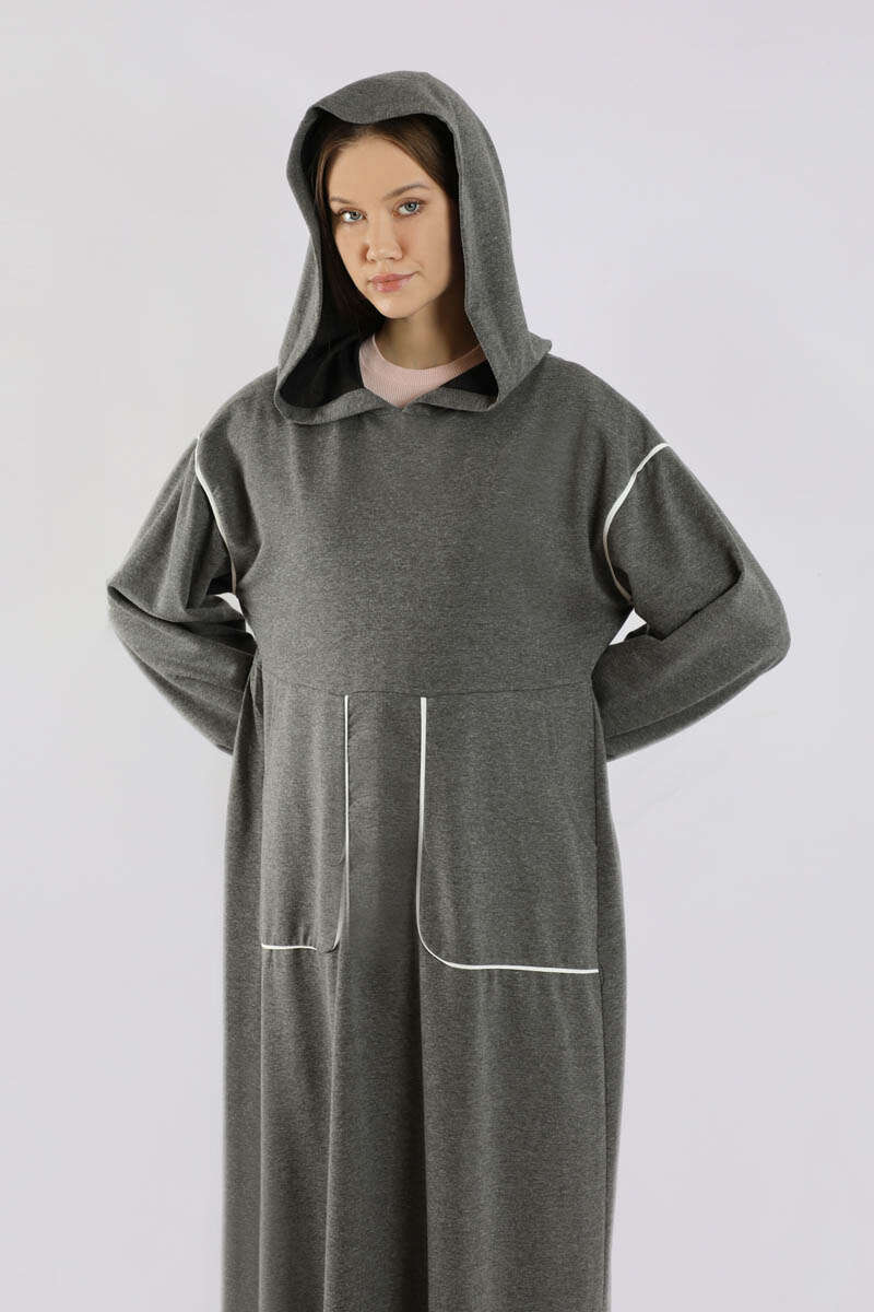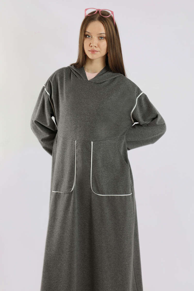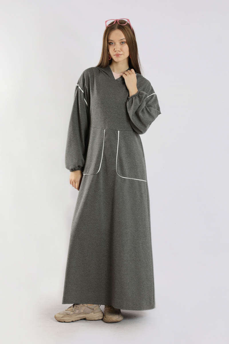 Biye Detaylı Elbise Füme. Cep ve omuzda biye detayı mevcuttur. Düşük omuzludur. Manşeti lastiklidir. Belden kesiklidir. Bel arkadan büzgülüdür. Kapüşonludur. Günlük kullanım ve özel günlerinizde tercih edebilirsiniz.
