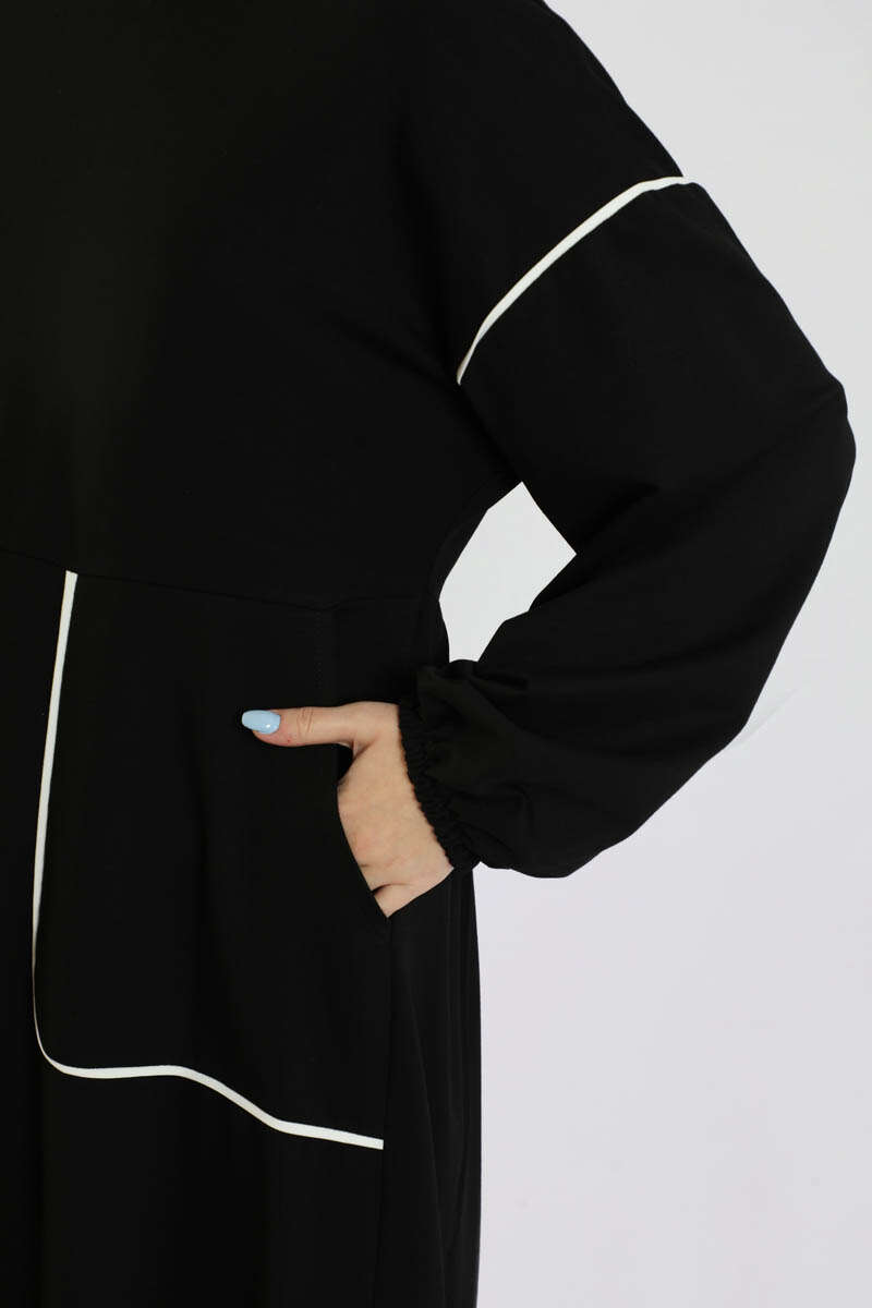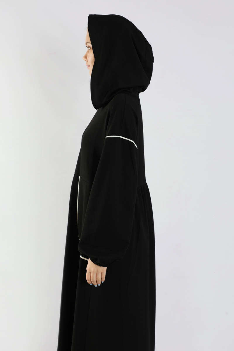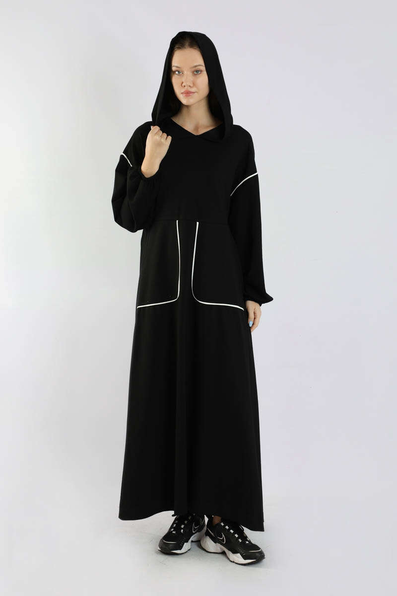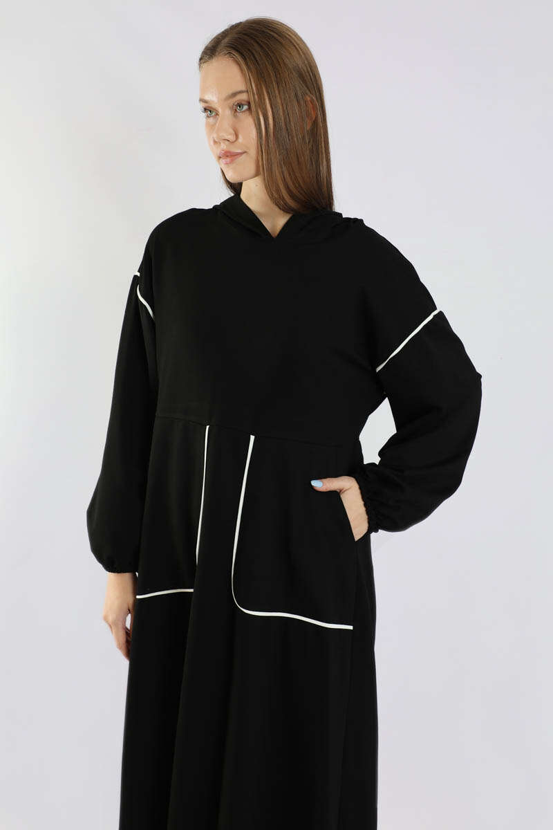 Biye Detaylı Elbise Siyah. Cep ve omuzda biye detayı mevcuttur. Düşük omuzludur. Manşeti lastiklidir. Belden kesiklidir. Bel arkadan büzgülüdür. Kapüşonludur. Günlük kullanım ve özel günlerinizde tercih edebilirsiniz.
