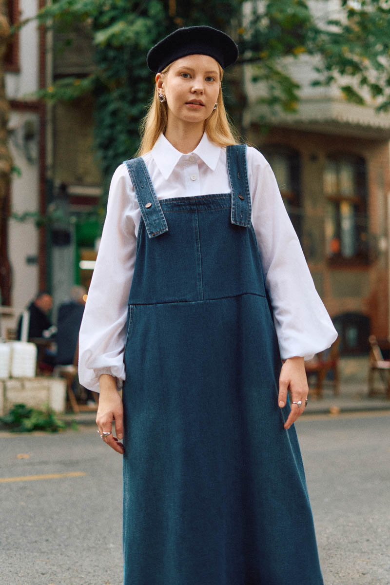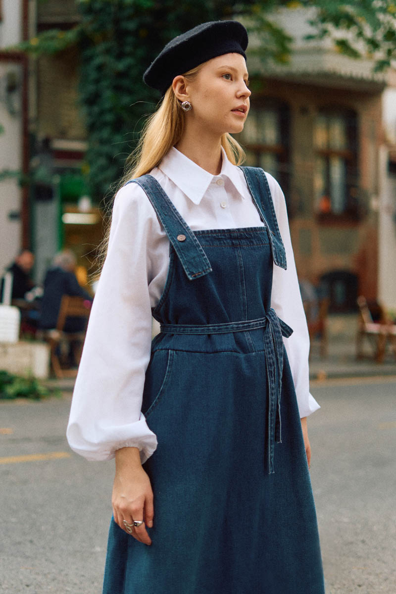 Biye Kuşaklı Denim Jumper Dress Blue with Piped Belt in Blue is a timeless piece that combines comfort and elegance for modern city style. The piped belt creates a feminine, body-shaping silhouette. The denim texture makes it both durable and suitable for everyday wear. It pairs easily with relaxed shirts, knitwear, or basic tops and adapts to all seasons. With its long length and simple design, it offers both a minimal and refined look.