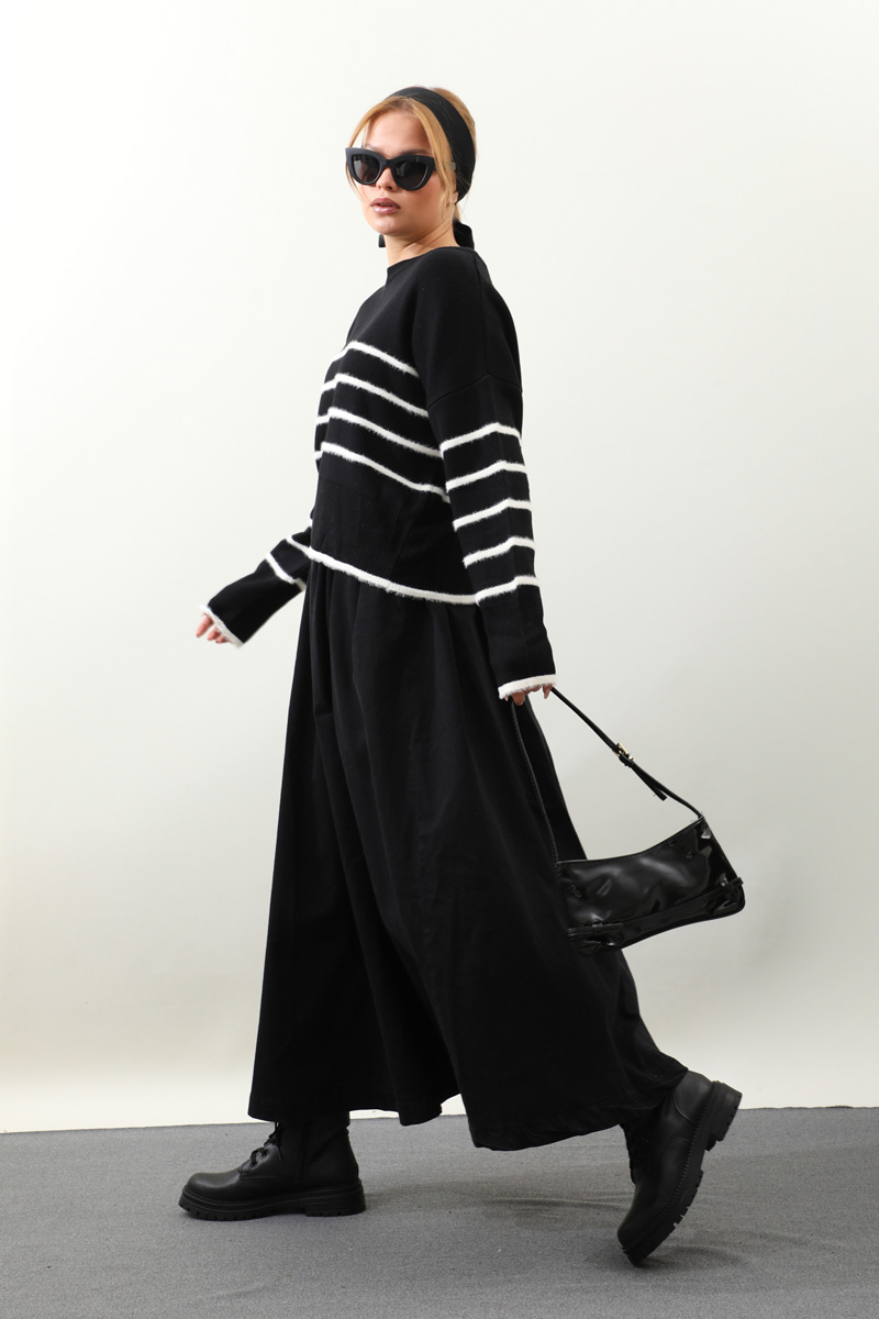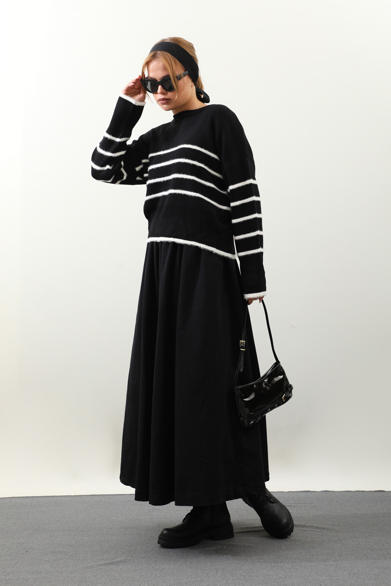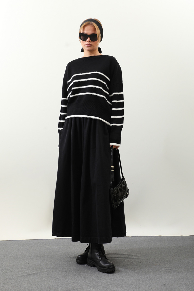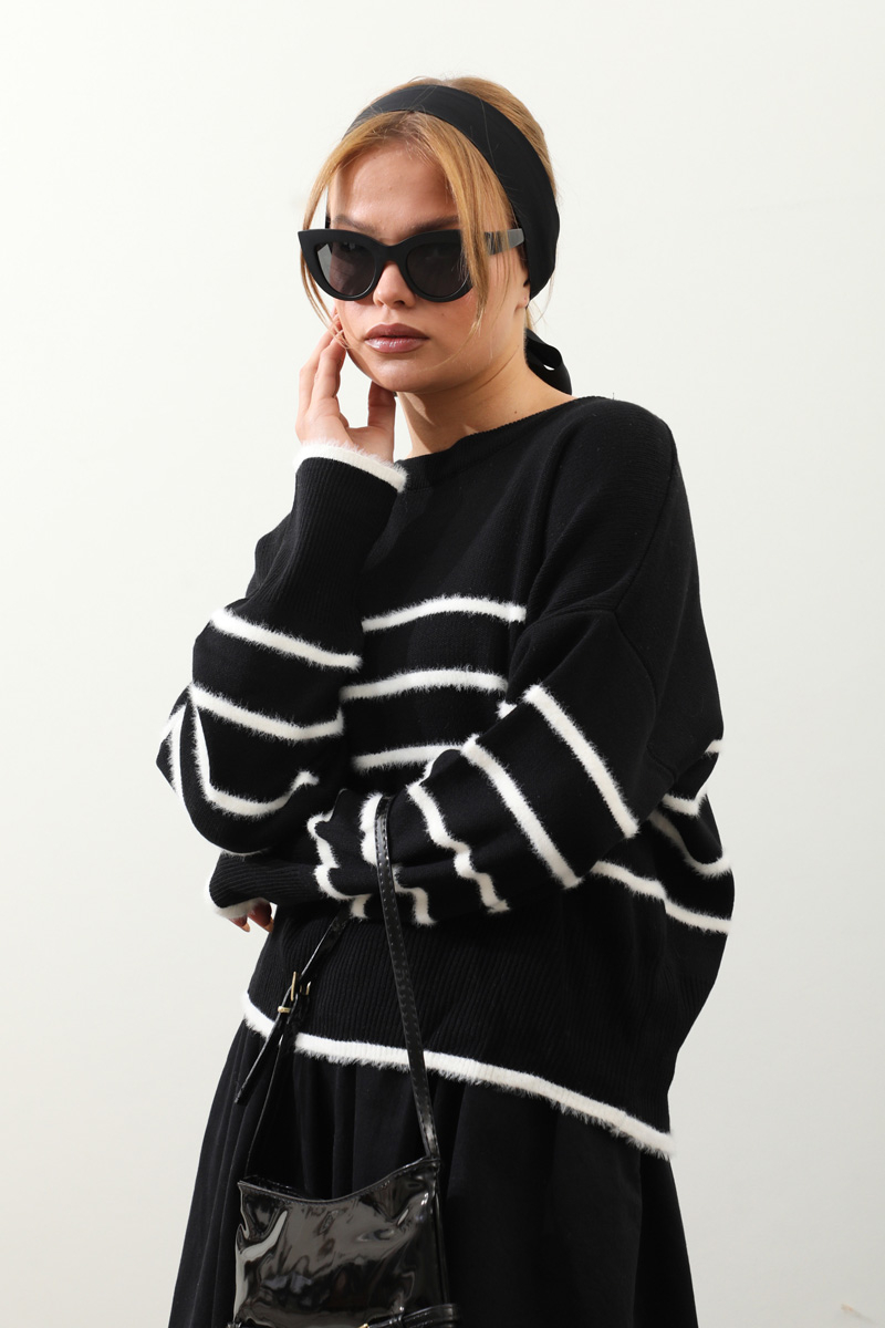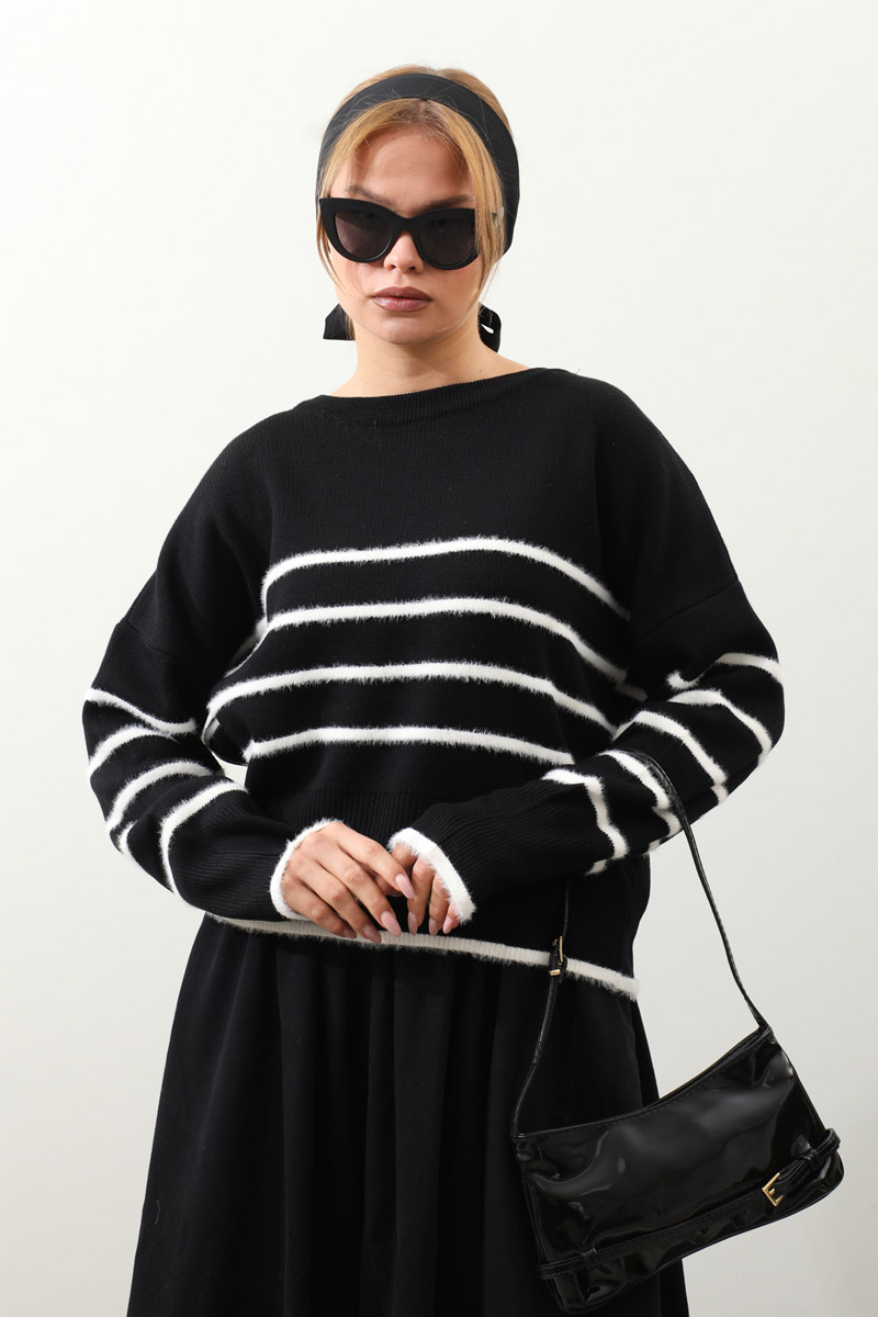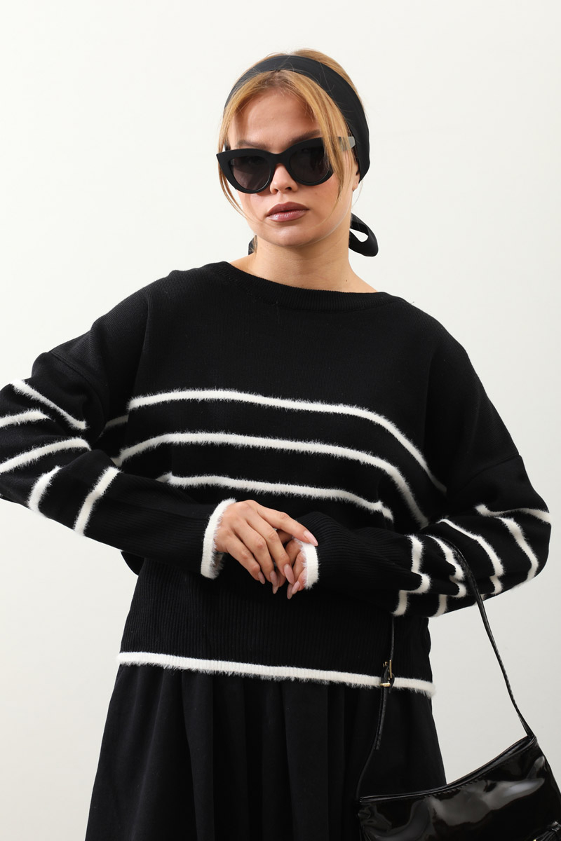 Biyeli Kısa Kazak Siyah. Geniş bisiklet yakalıdır, düşük omuzludur, manşeti ve etek uçları ribana detaylıdır, önü ve kolları tüylü biye detaylıdır. Günlük kullanım ve özel günlerinizde tercih edebilirsiniz.