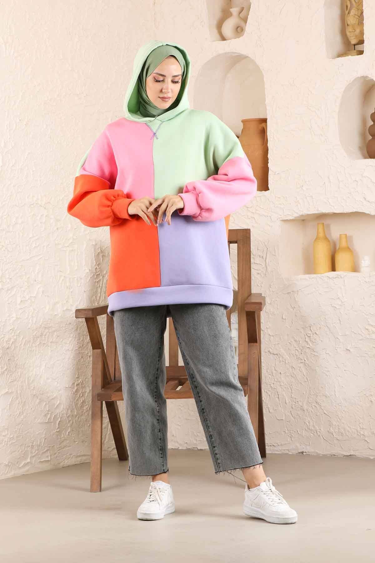 Bloklu Renkli Sweat Mint. Kopüşonludur. Yumuşak dokuludu içini yünlüdür.Oversize kalıp