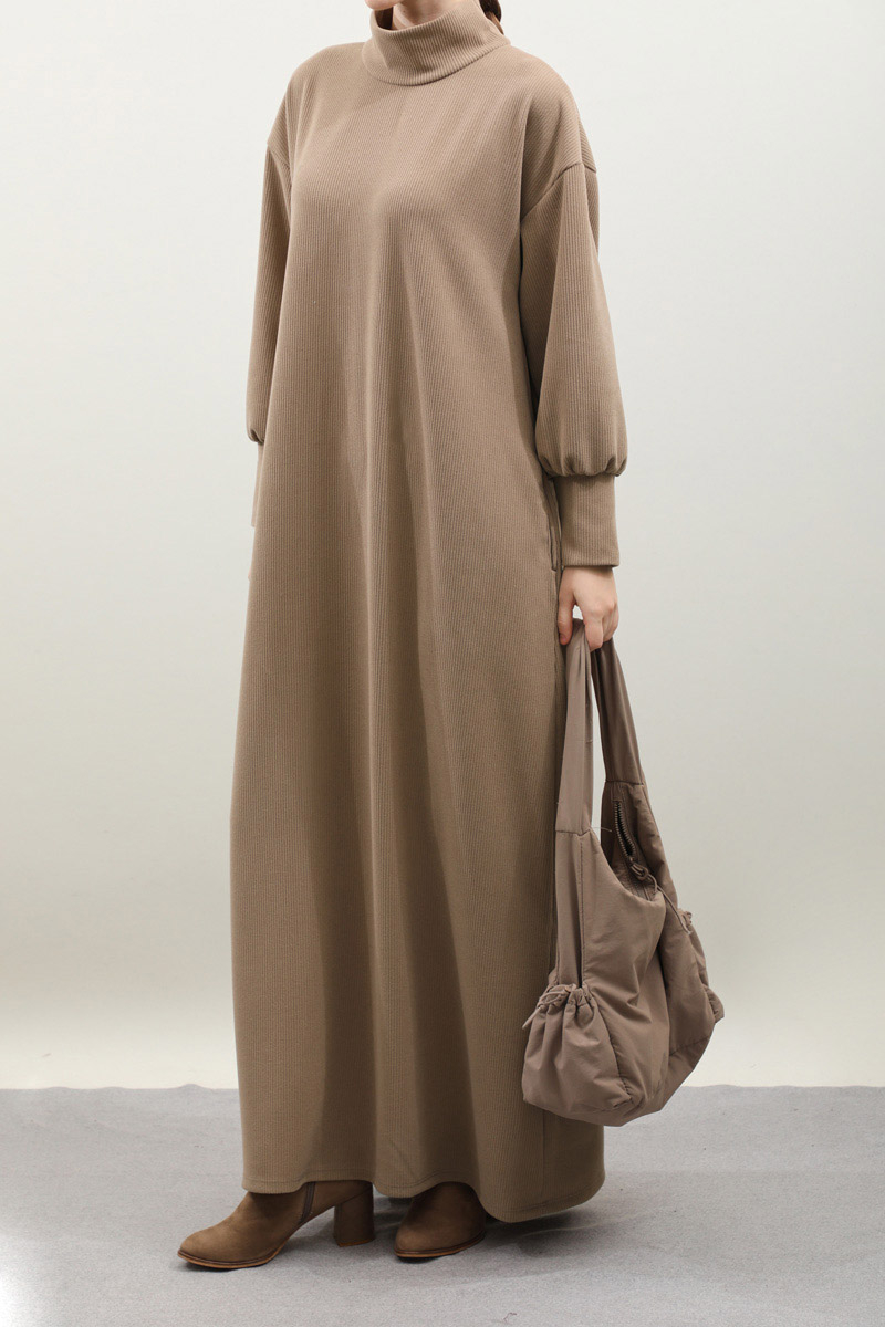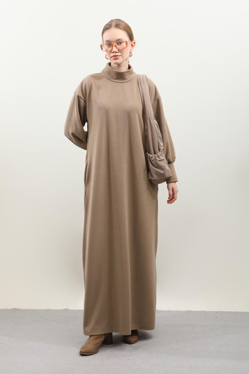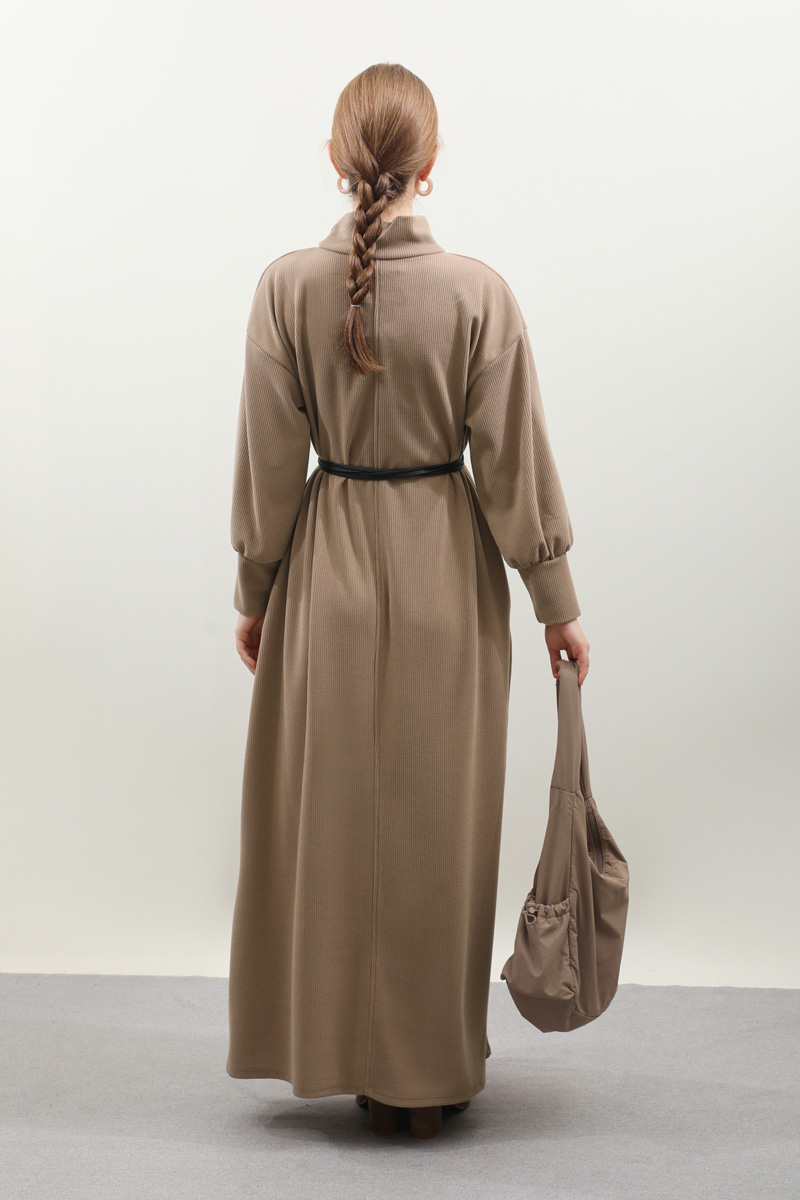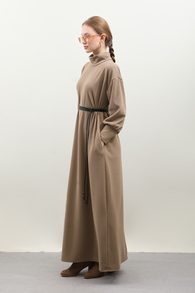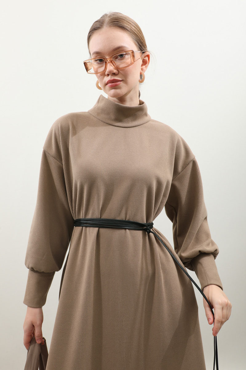 Boğazlı Fitilli Triko Elbise Koyu Vizon