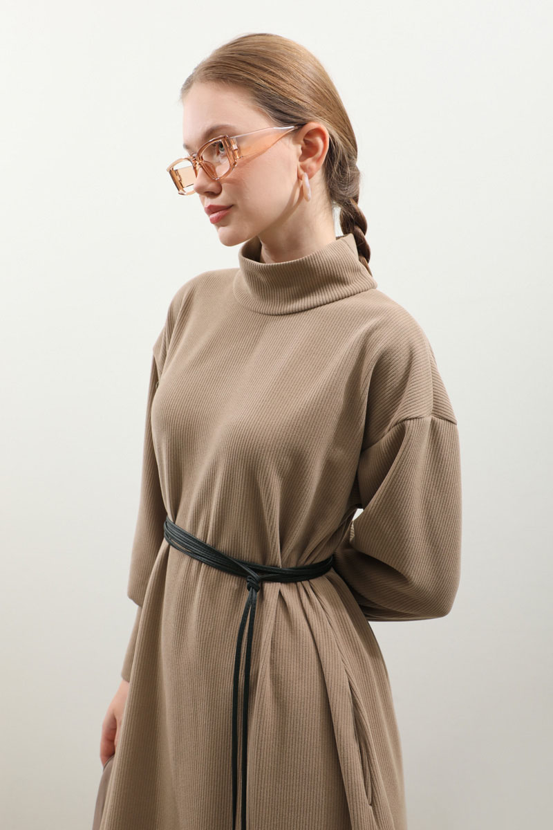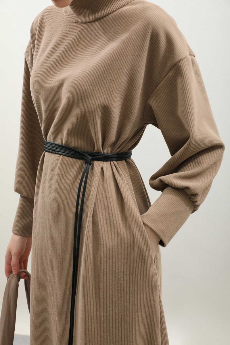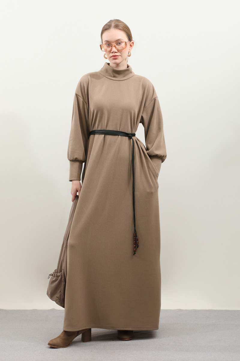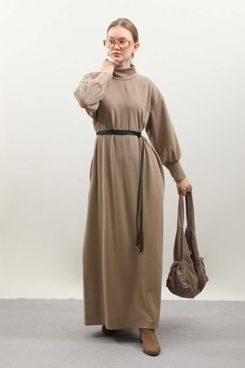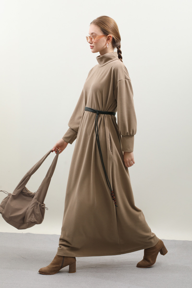 Boğazlı Fitilli Triko Elbise Koyu Vizon. Bol balıkçı boğazdır, düşük omuzludur, uzun manşetlidir, yanlardan ceplidir, ahşap boncuklu deri kordon detaylıdı, astarsızdır, Fitilli triko kumaş olduğundan iç göstermez. Günlük kullanım ve özel günlerinizde tercih edebilirsiniz.