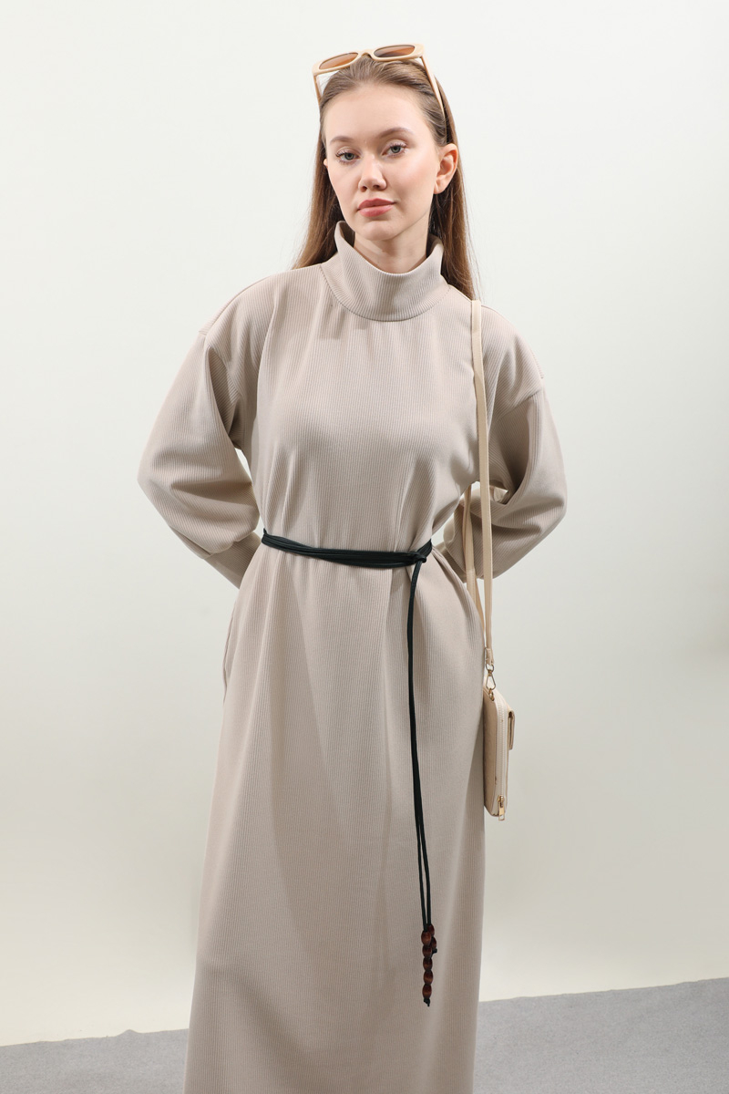 Boğazlı Fitilli Triko Elbise Krem. Bol balıkçı boğazdır, düşük omuzludur, uzun manşetlidir, yanlardan ceplidir, ahşap boncuklu deri kordon detaylıdı, astarsızdır, Fitilli triko kumaş olduğundan iç göstermez. Günlük kullanım ve özel günlerinizde tercih edebilirsiniz.