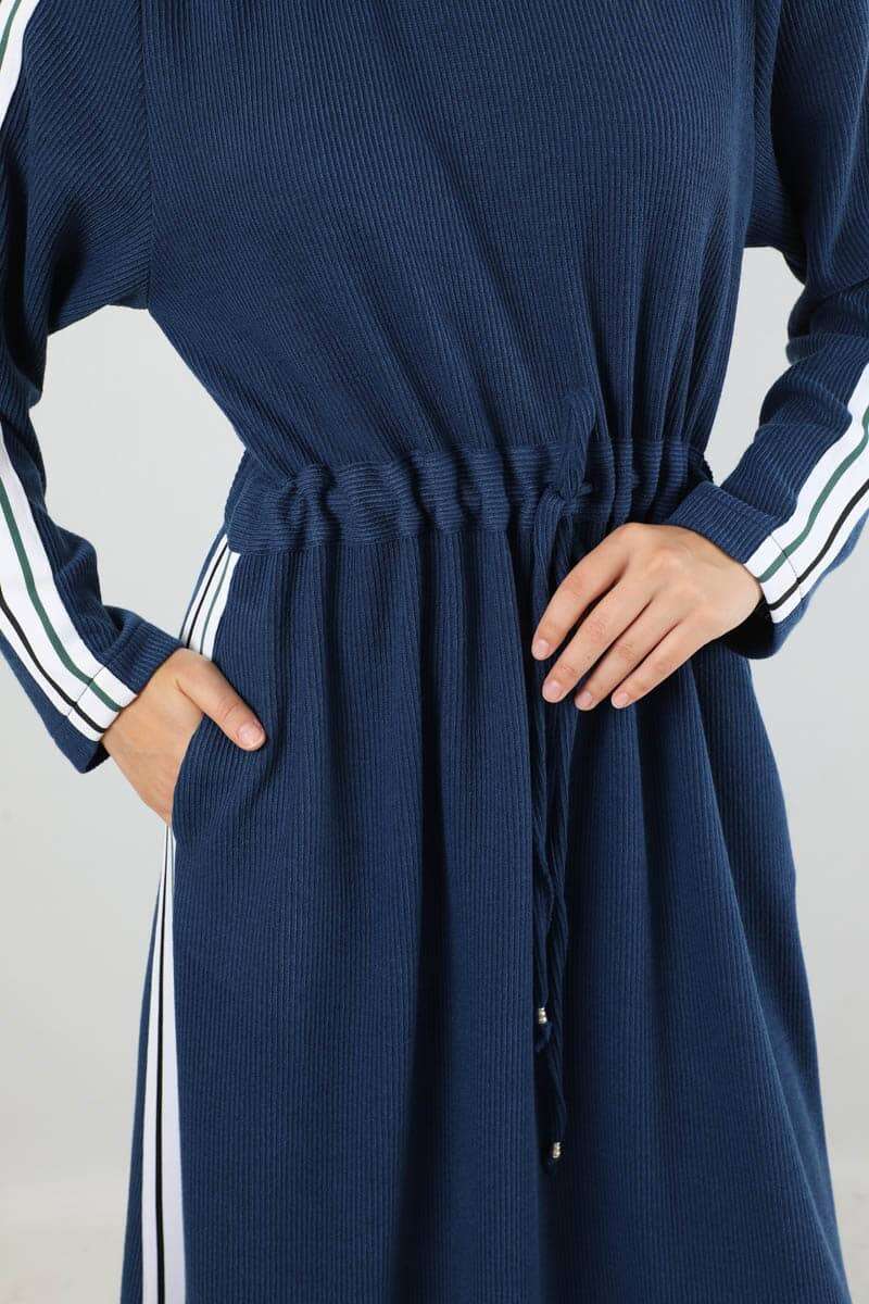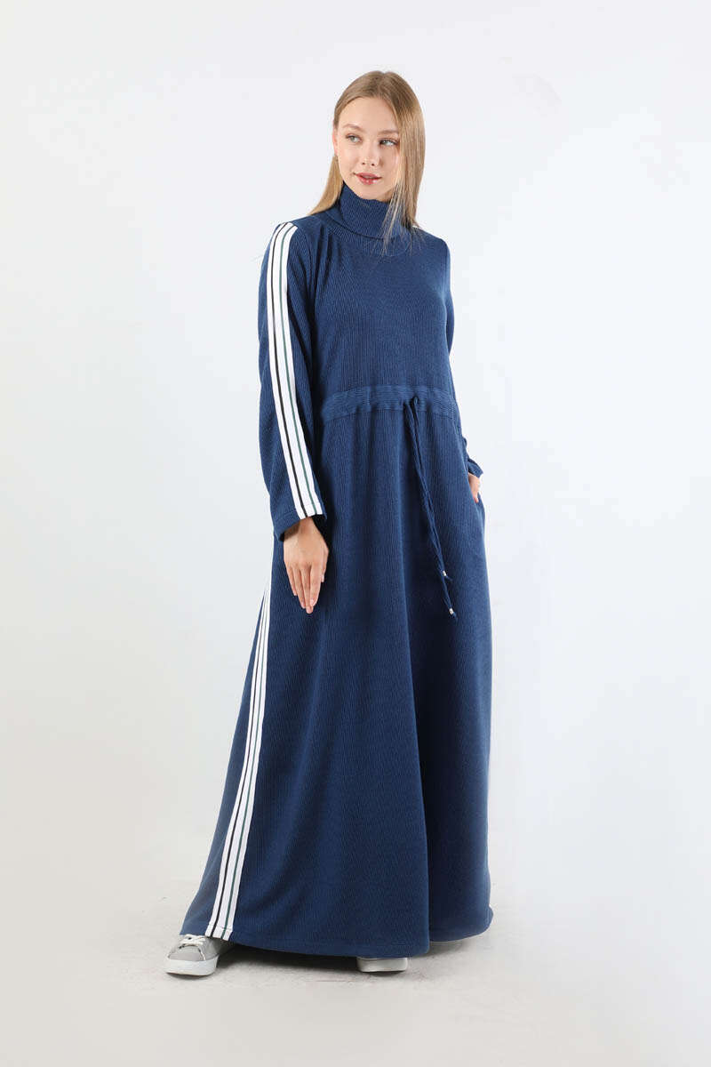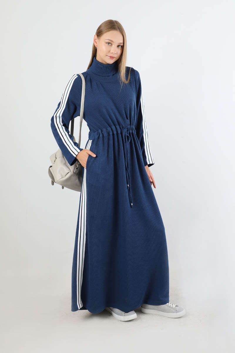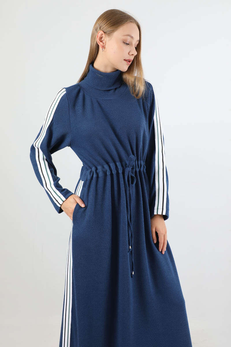 Boğazlı Triko Elbise Lacivert. Kol ve bedenden şerit aksesuar detaylıdır. Boğazlı yakalıdır. Belden tünelli bağcık detaylıdır. Günlük kullanım ve özel günlerinizde tercih edebilirsiniz.