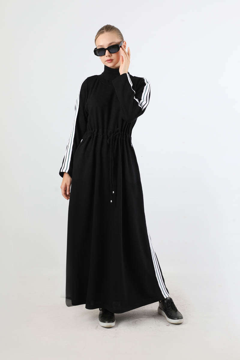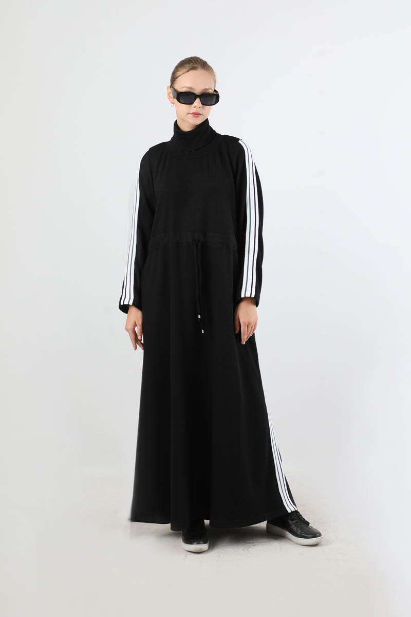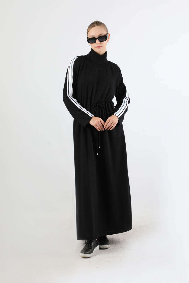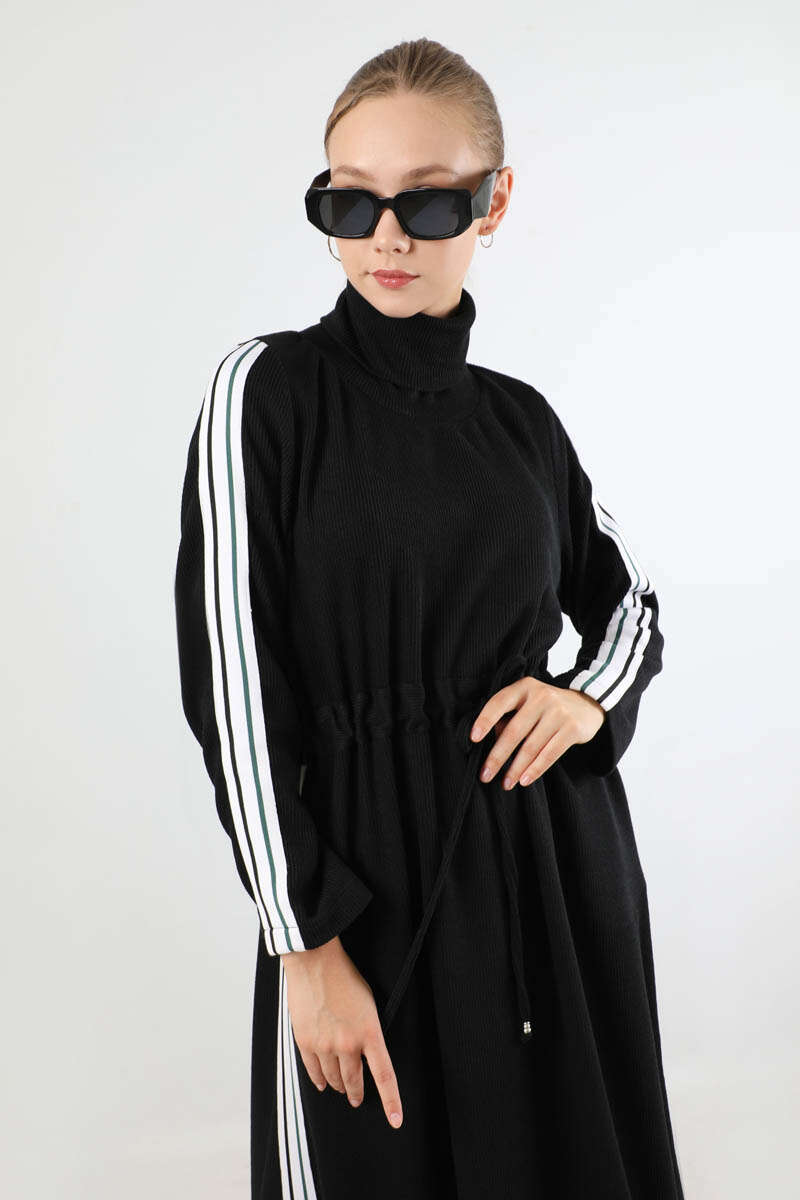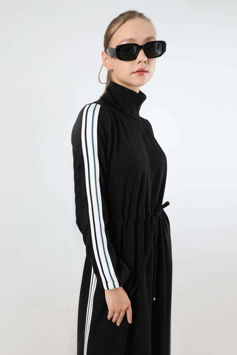 Boğazlı Triko Elbise Siyah. Kol ve bedenden şerit aksesuar detaylıdır. Boğazlı yakalıdır. Belden tünelli bağcık detaylıdır. Günlük kullanım ve özel günlerinizde tercih edebilirsiniz.