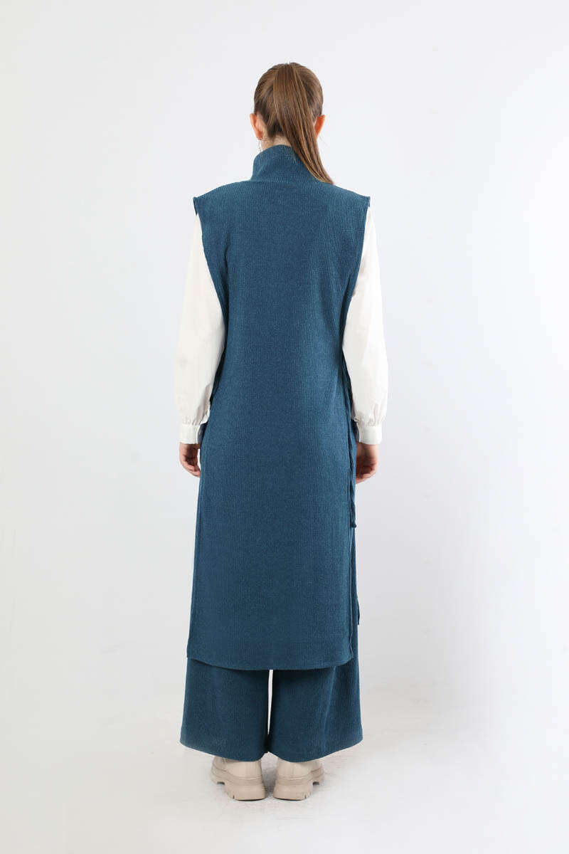 Boğazlı Triko Uzun Yelek Takım İndigo. Yelek yandan bağcıklıdır. Yelek boğazlı yakadır. Pantolon bol paçadır. Pantolon beli lastiklidir. Gömlek bisiklet yakadır. Gömlek manşeti düğmelidir. Üçlü takım olarak satılmaktadır. Günlük kullanım ve özel günlerinizde tercih edebilirsiniz.