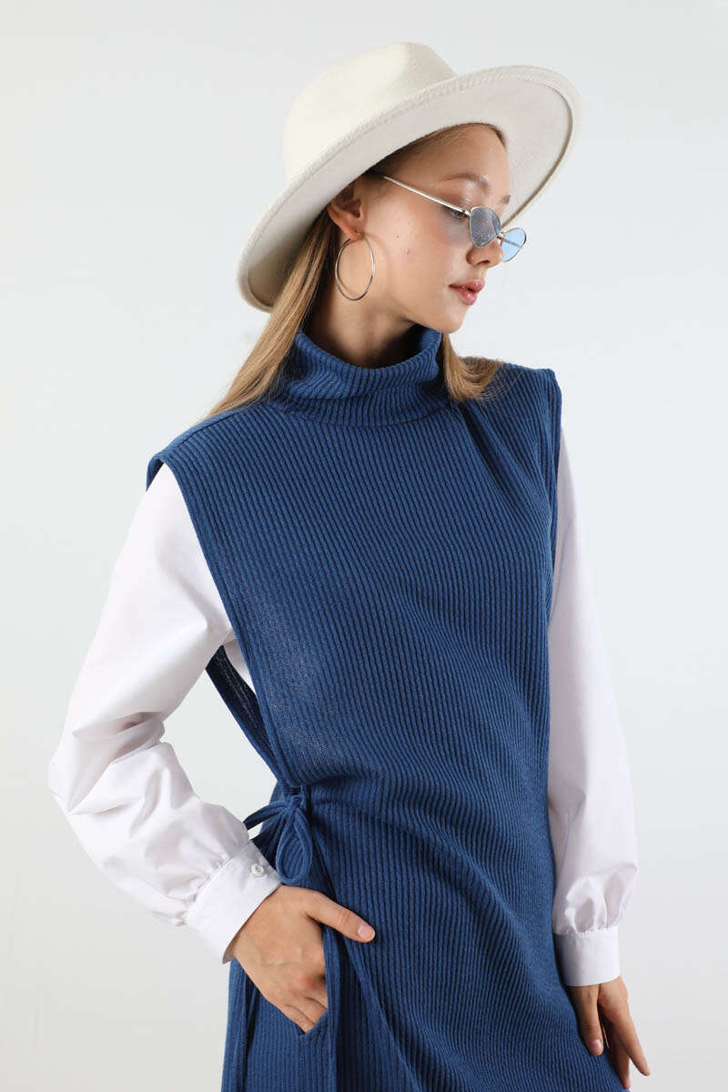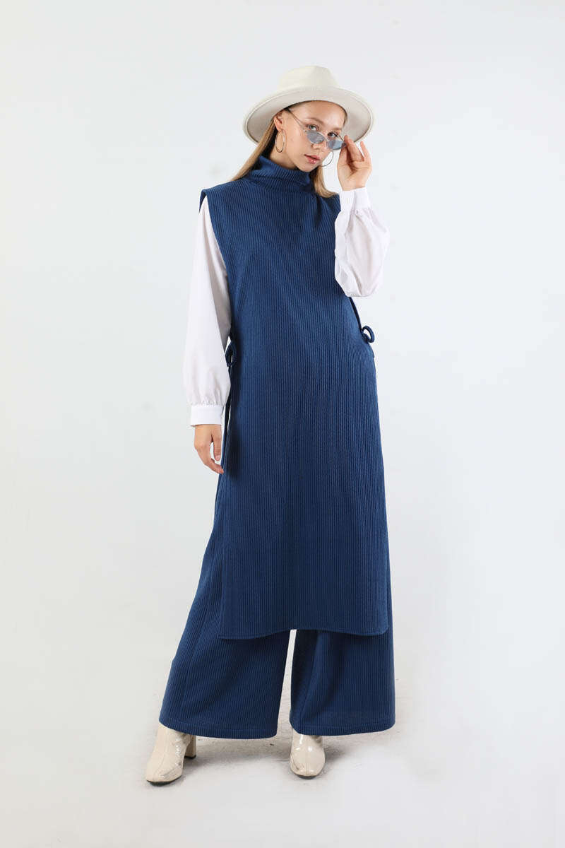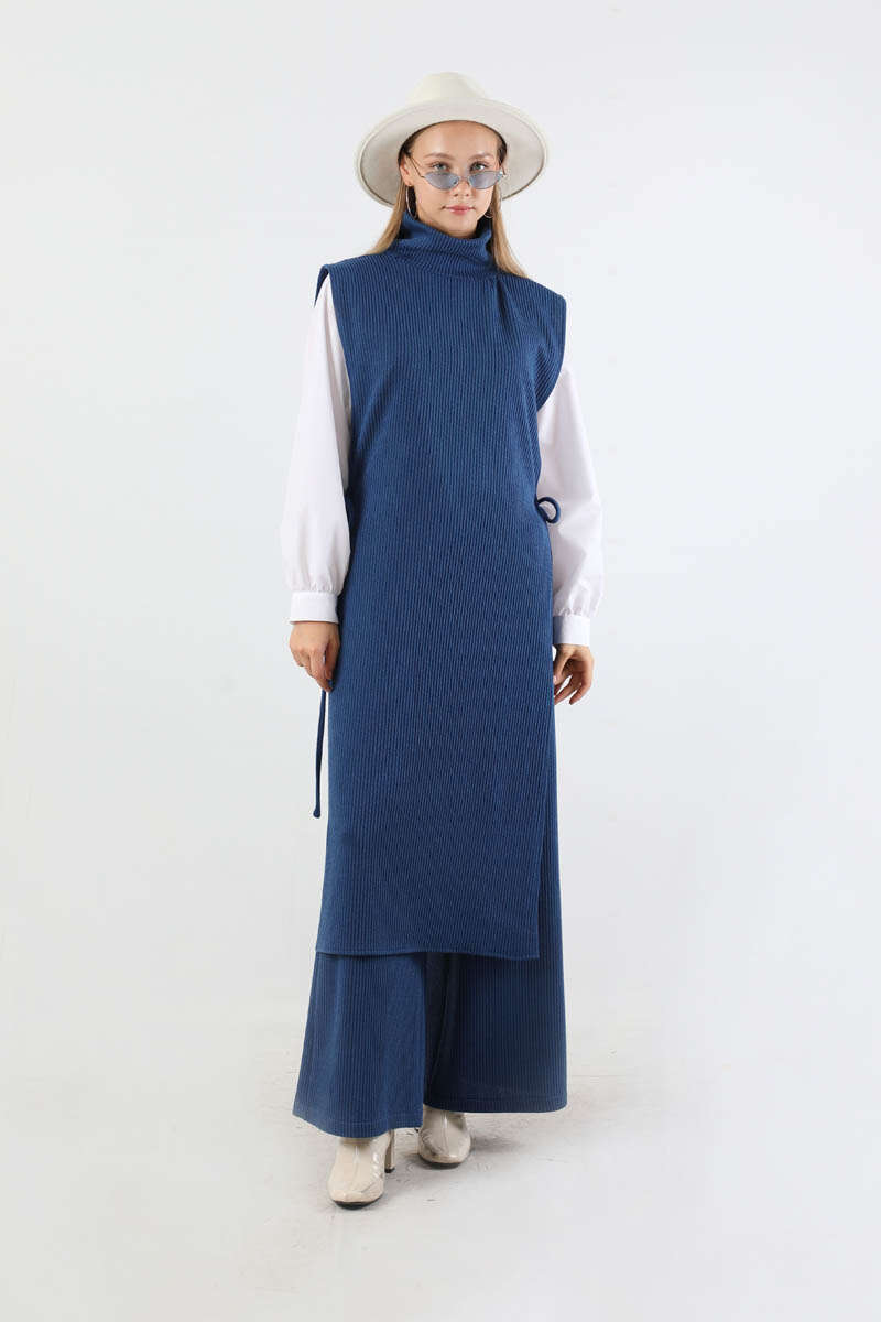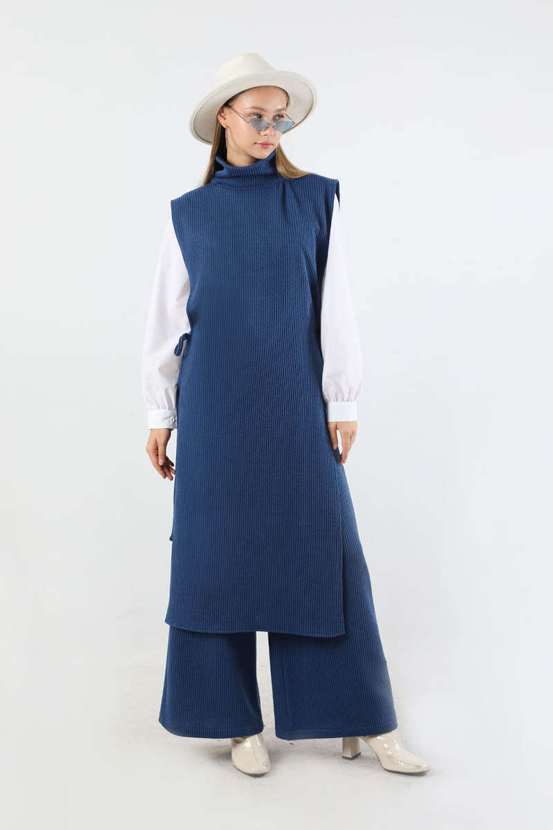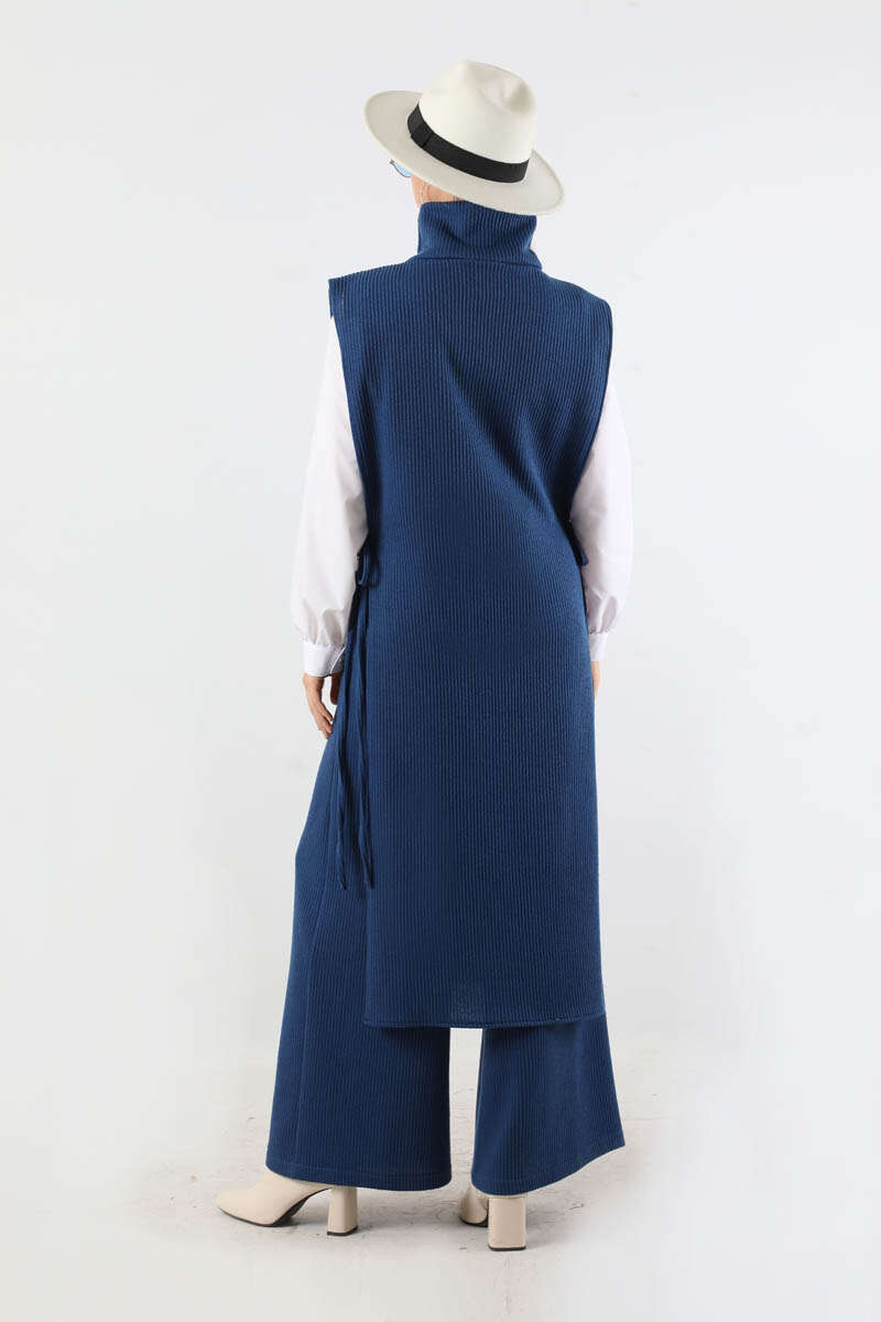 Boğazlı Triko Uzun Yelek Takım Lacivert. Yelek yandan bağcıklıdır. Yelek boğazlı yakadır. Pantolon bol paçadır. Pantolon beli lastiklidir. Gömlek bisiklet yakadır. Gömlek manşeti düğmelidir. Üçlü takım olarak satılmaktadır. Günlük kullanım ve özel günlerinizde tercih edebilirsiniz.