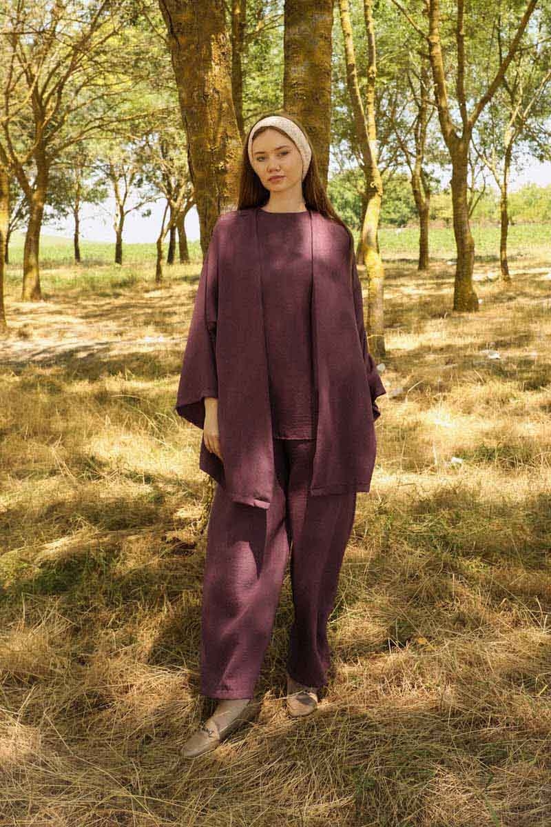 Bol Kimono Takım Mürdüm. Kimono, düşük omuzlu, şal yaka, cepsiz, kuşaksız. İç tunik, arkadan fermuarlı bisiklet yaka, sıfır kol. Pantolon beli lastikli, yandan ceplidir.