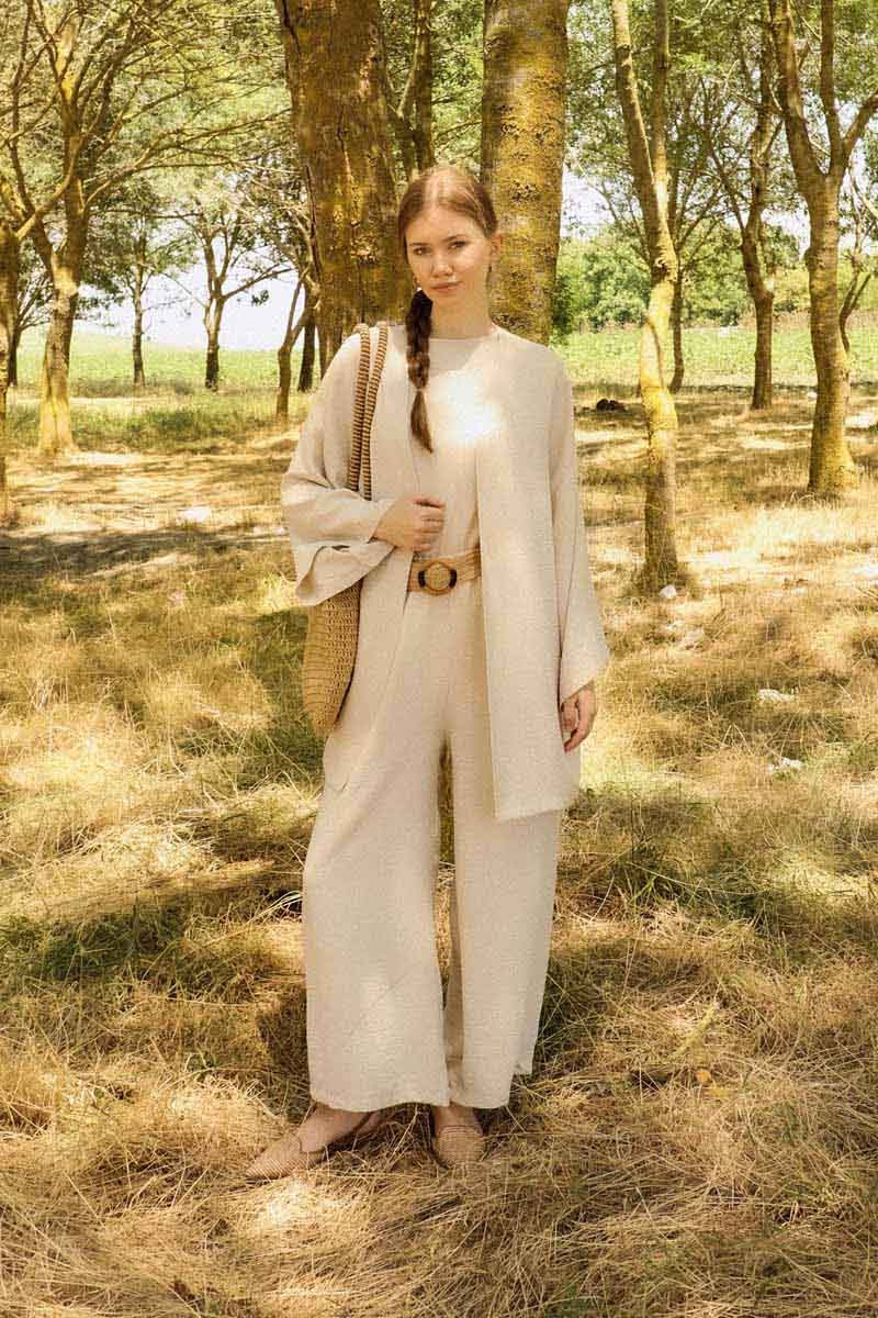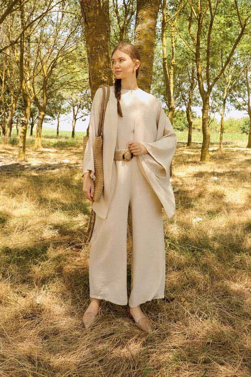 Bol Kimono Takım Taş. Kimono, düşük omuzlu, şal yaka, cepsiz, kuşaksız. İç tunik, arkadan fermuarlı bisiklet yaka, sıfır kol. Pantolon beli lastikli, yandan ceplidir.