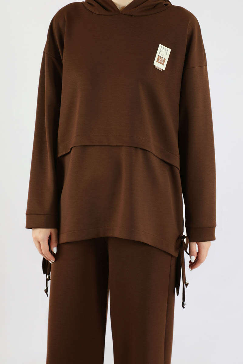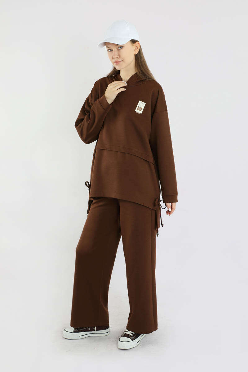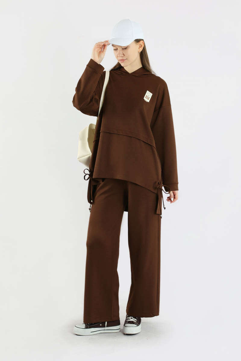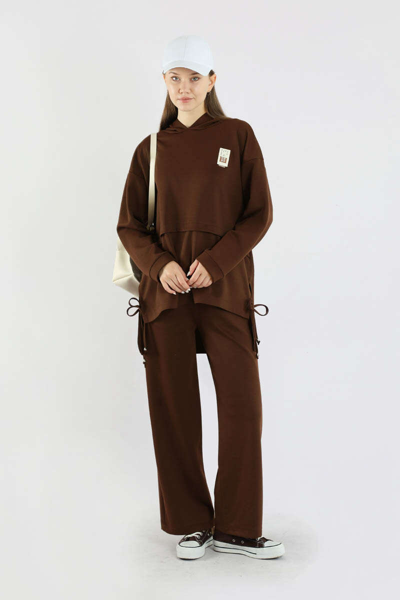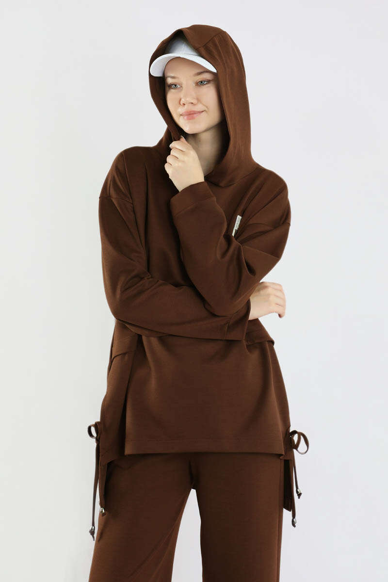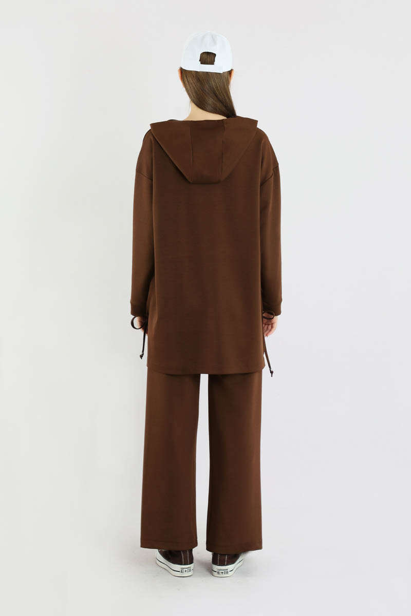 Bol Paça Kapüşonlu Sweat Takım Acı Kahve