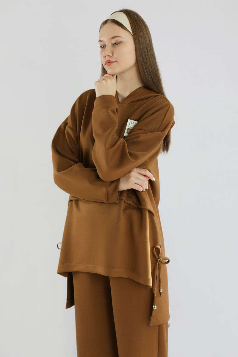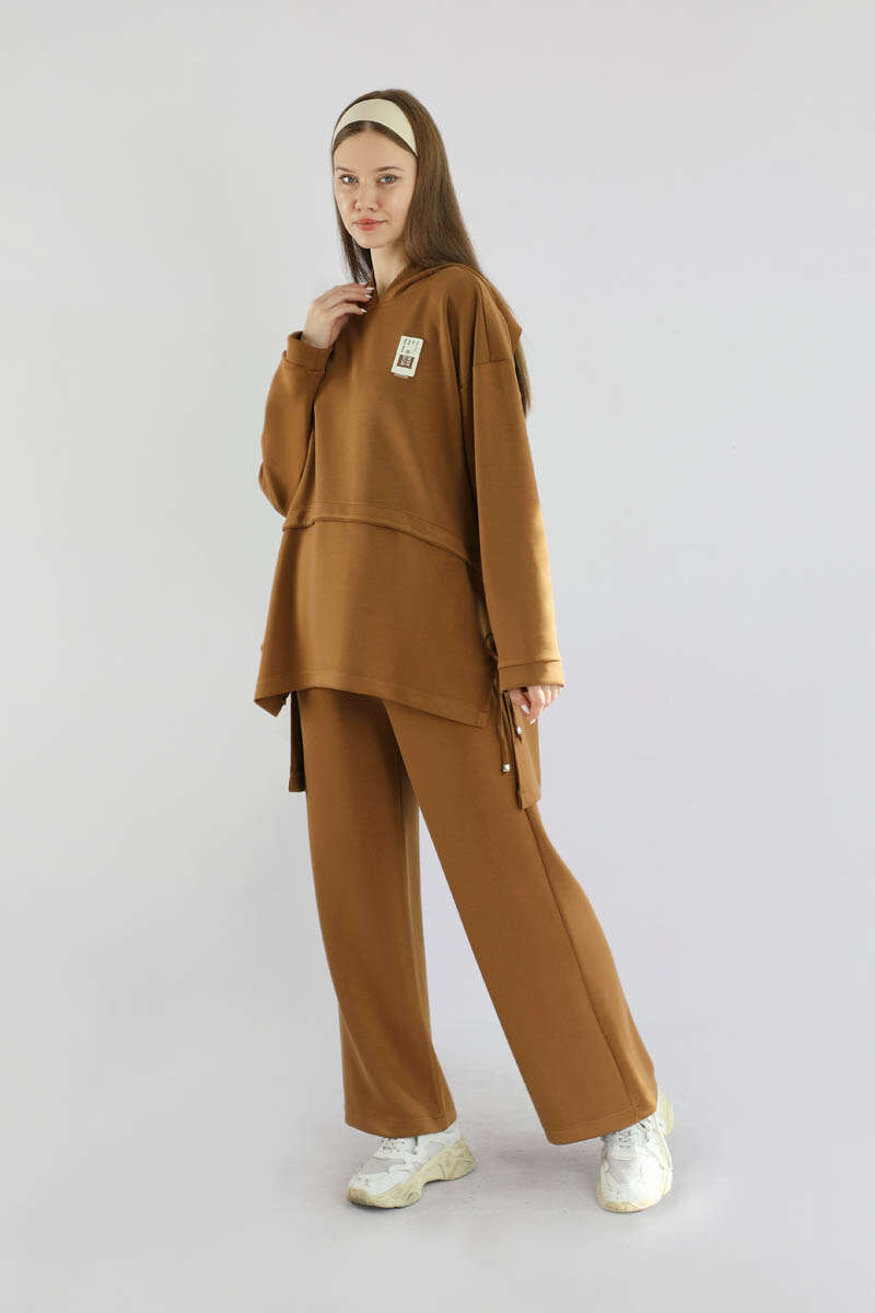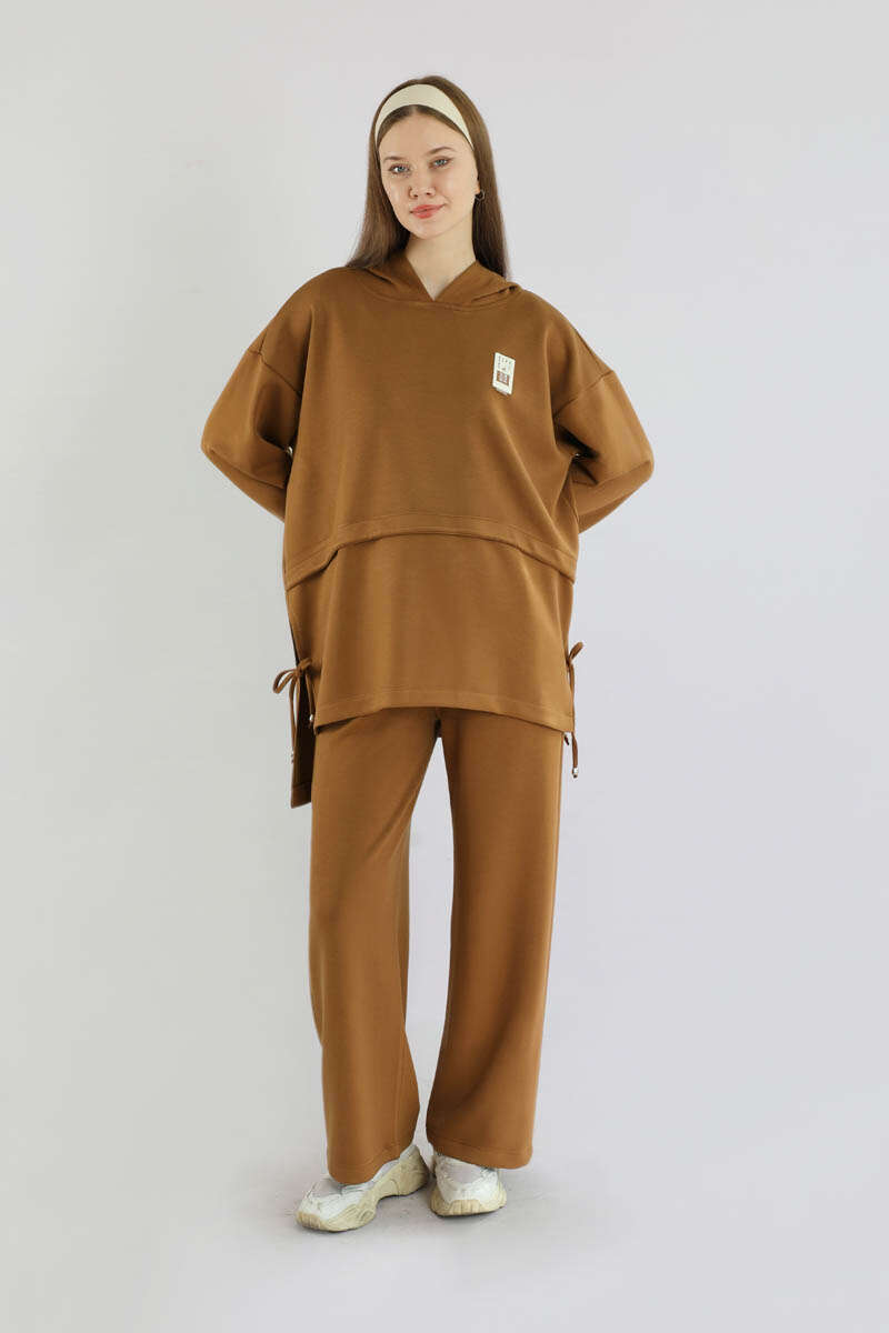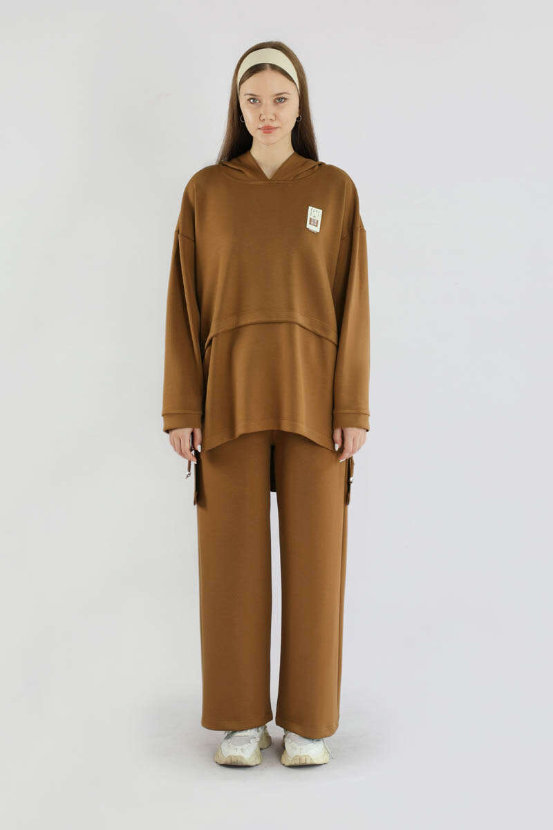 Bol Paça Kapüşonlu Sweat Takım Kahve