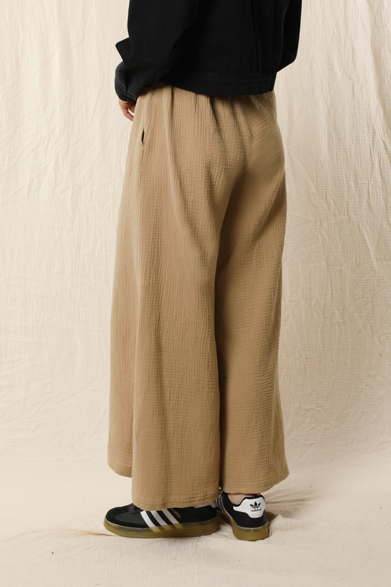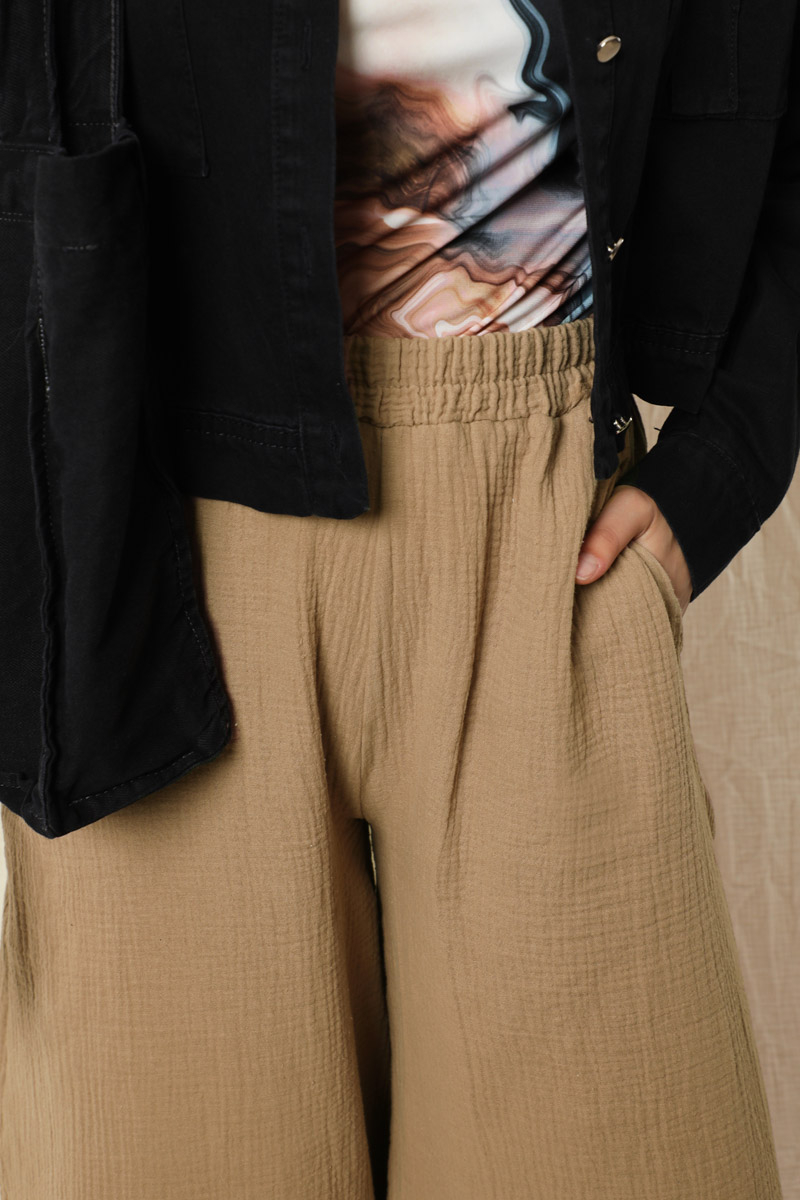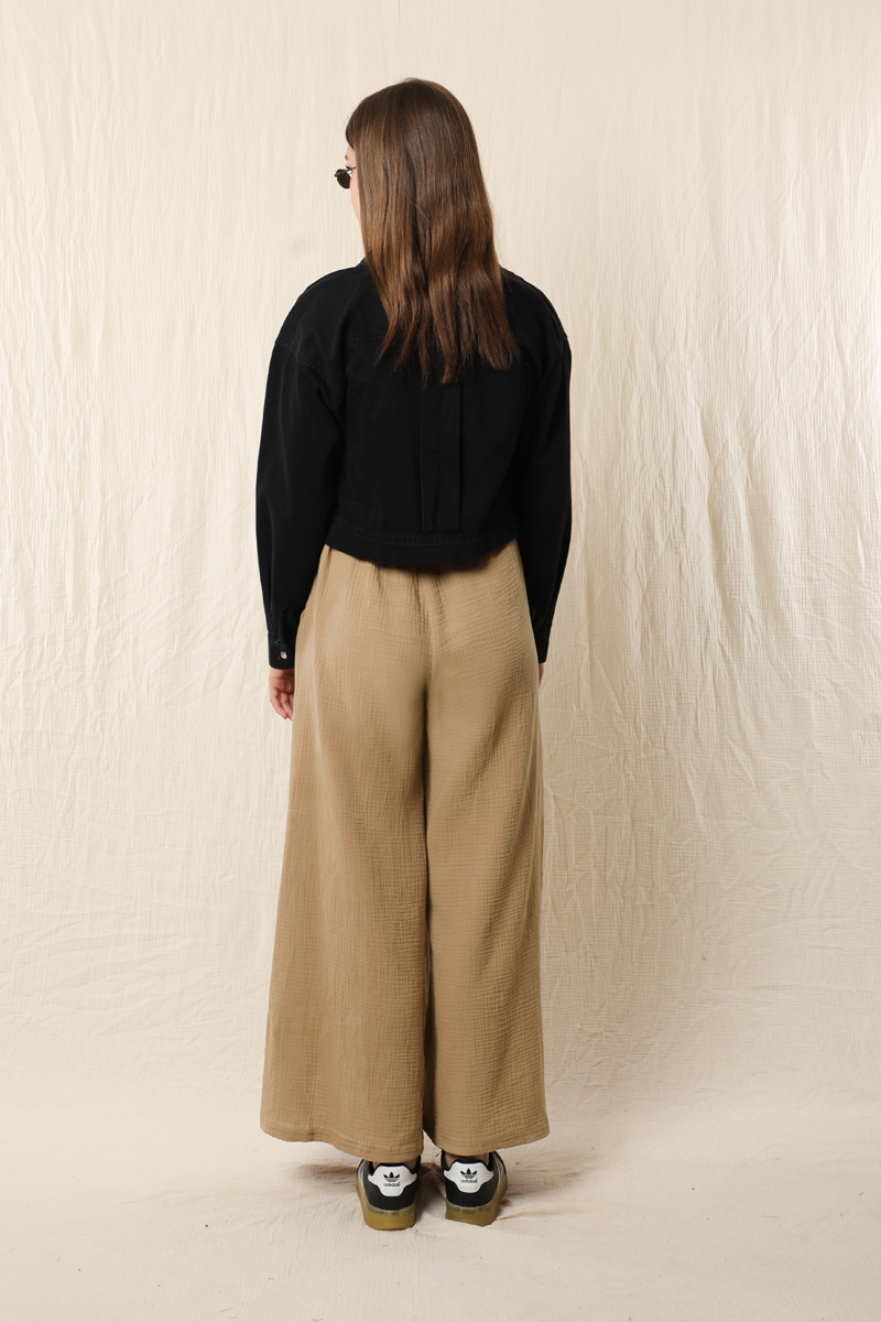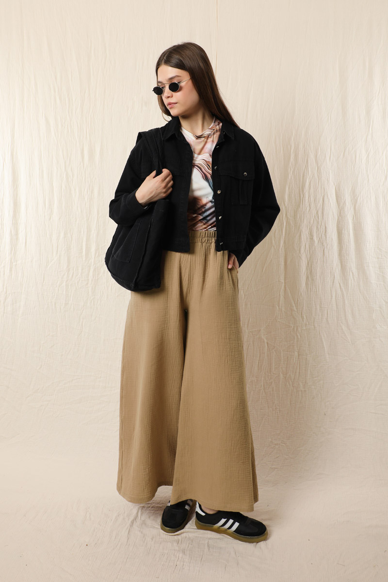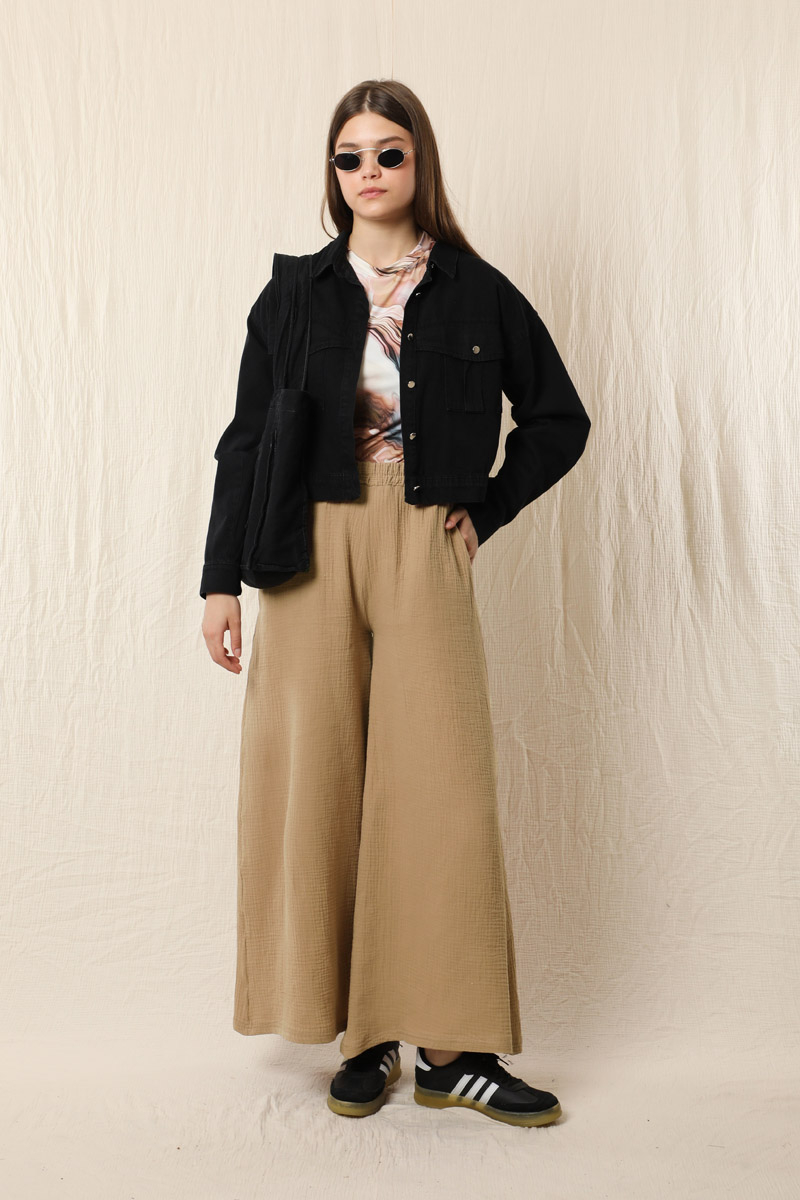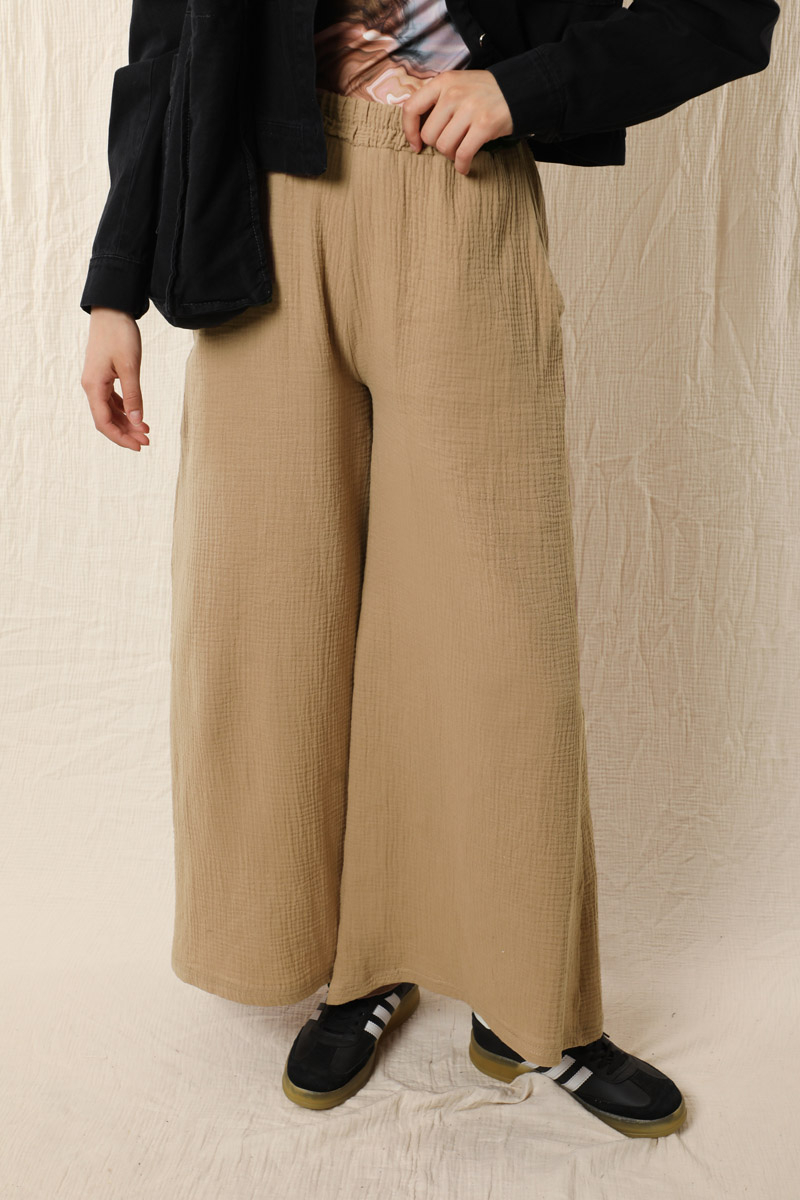 Bol Paça Müslin Pantolon Vizon. Beli lastiklidir. Yan ceplidir. Salaş bir modeldir. Astarsızdır.