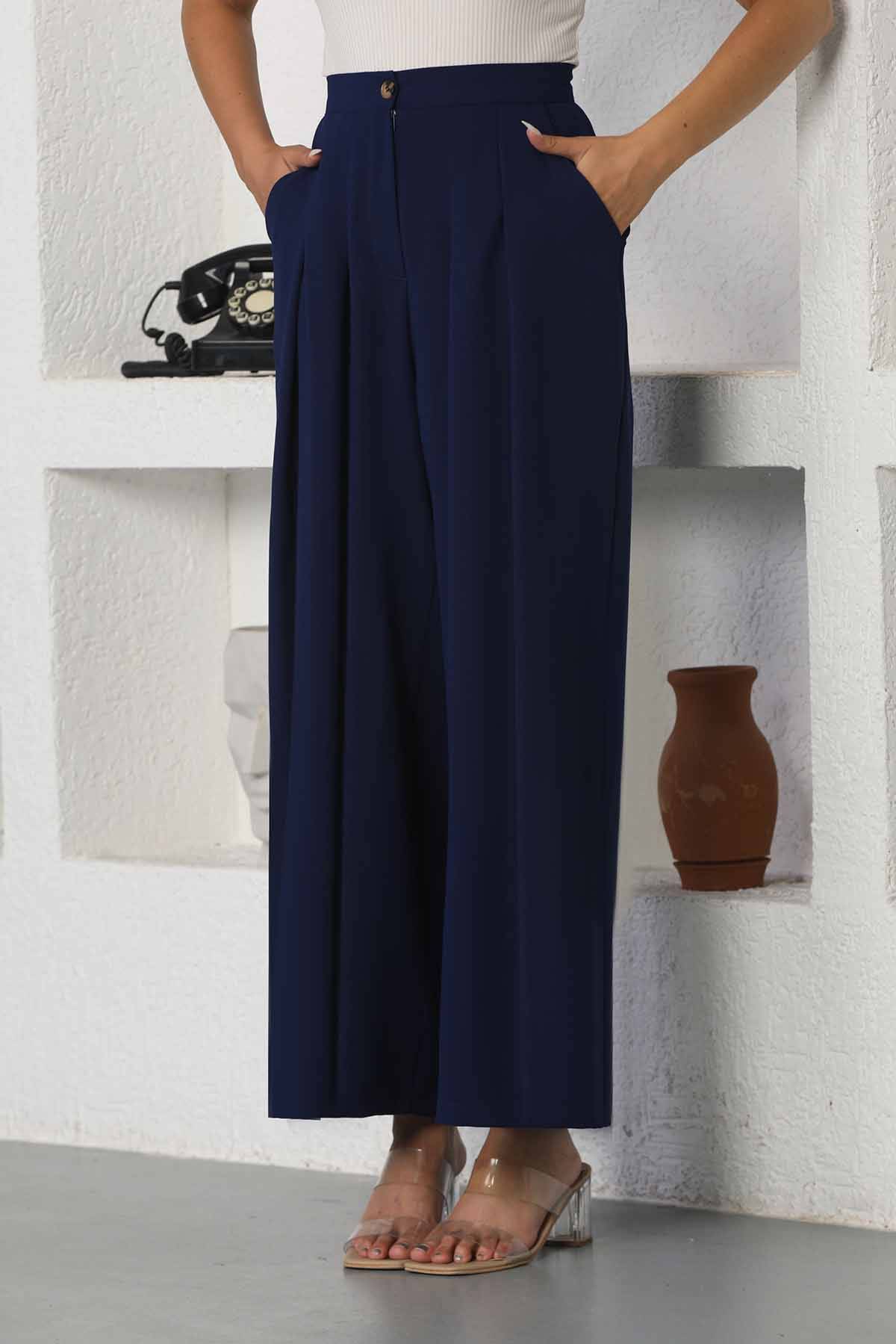Bol paça pileli pantolon, düğmeli ve fermuarlıdır. Cep detayı bulunmaktadır. Krep kumaş olup tam kalıptır. Ürün dört mevsimliktir rahatça kullanabilirsiniz.