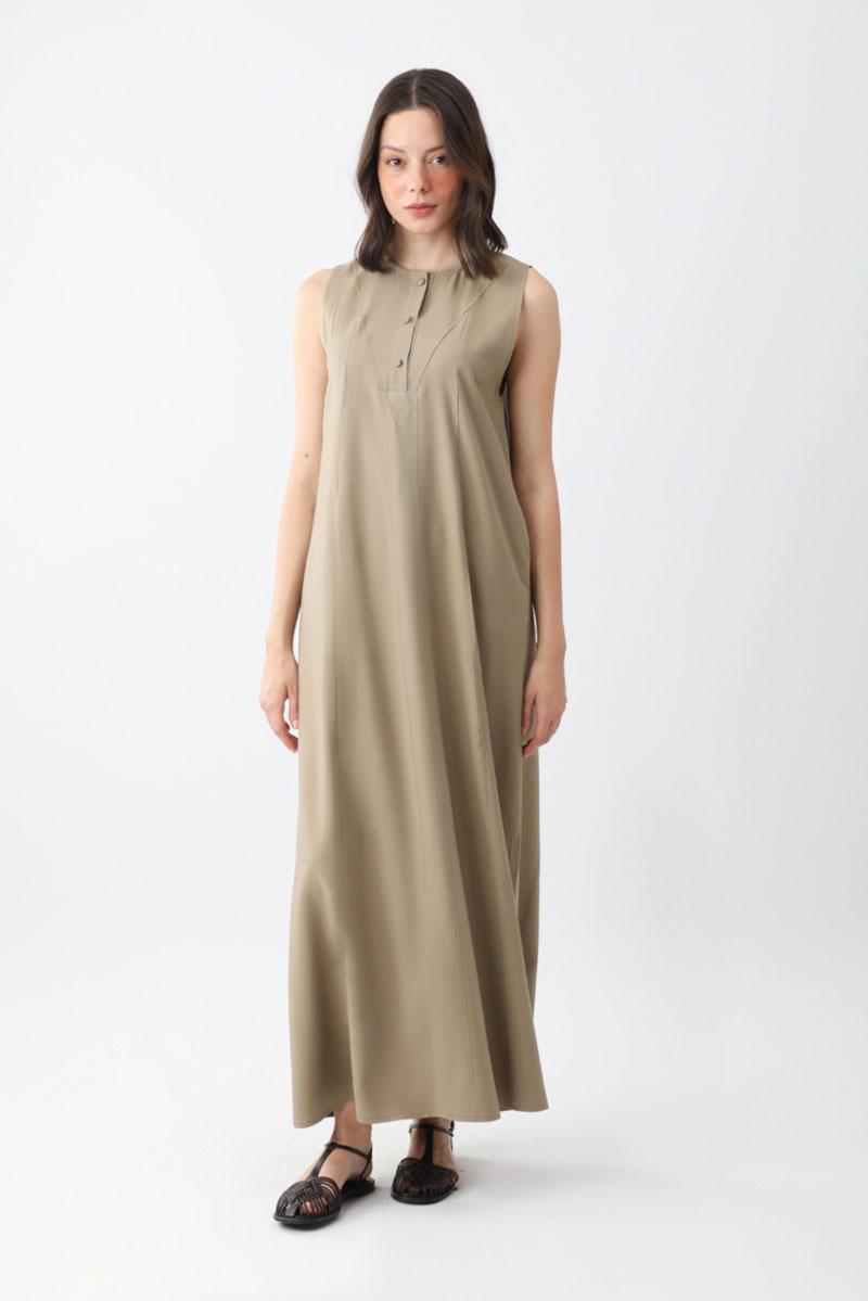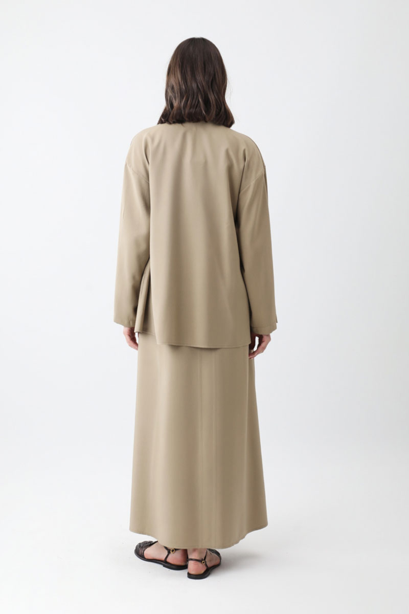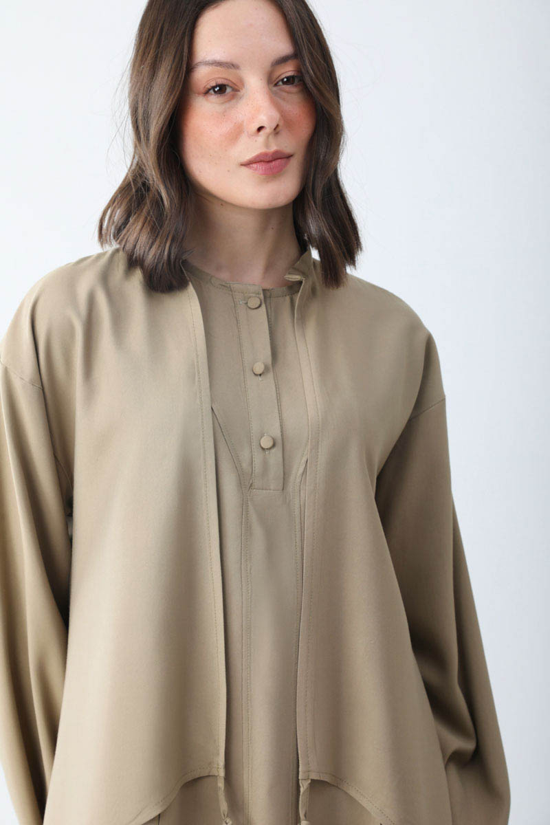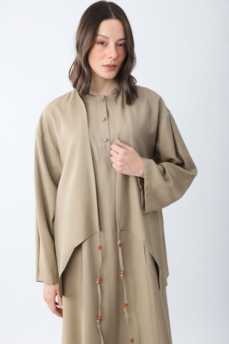 Boncuklu Jile Takım Vizon. Kimono önden asimetrik kesimdir, düşük omuzludur, bağlanabilir bilelidir ve önden tahta boncuk detaylıdır. İç elbise bisiklet yakadır, önden yarım düğmelidir, yandan cepli ve astarsızdır, bol kalıptır. Günlük kullanım için uygundur.