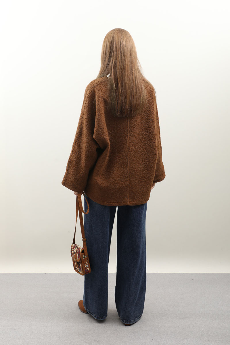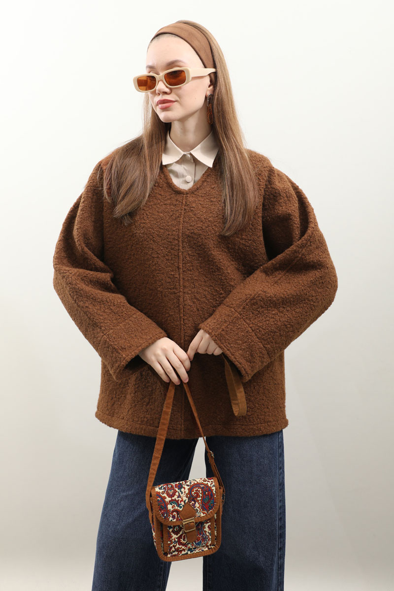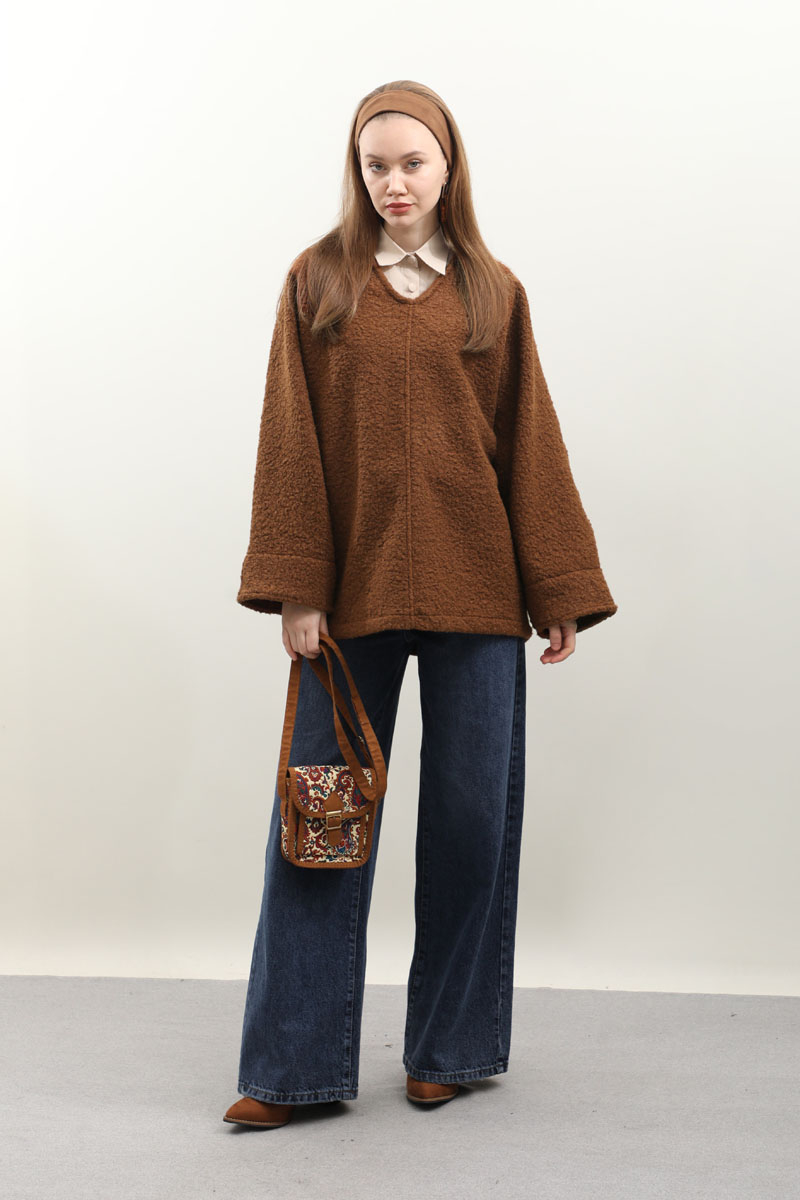 Buklet V Yaka Sweat Taba. V yaka, kalın manşet, ön ve arka ortada dikiş detaylı, geniş hafif yarasa kolludur. Kış mevsimi için uygundur.
