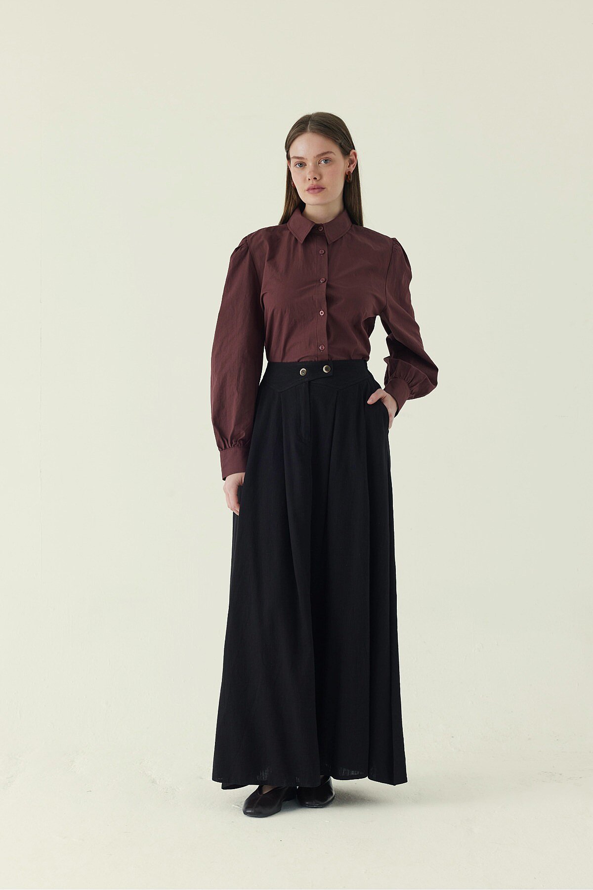 Buttoned Belt Skirt Black offers a strong and distinctive character to the classic skirt silhouette with its button-detailed belt design at the waist. Its softly flowing, near A-line cut provides ease of movement, while the long length creates a balanced and elegant silhouette. Thanks to its structured yet drapey fabric, it maintains its form throughout the day and can be easily styled with shirts, blouses, or knitwear. A timeless piece suitable for a wide range of looks, from everyday city style to more polished combinations.