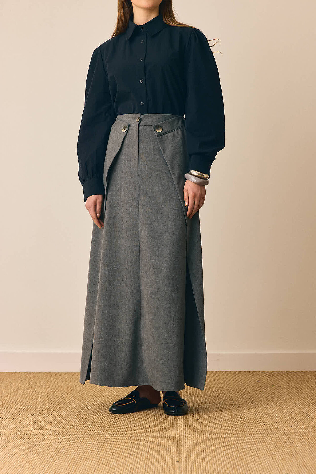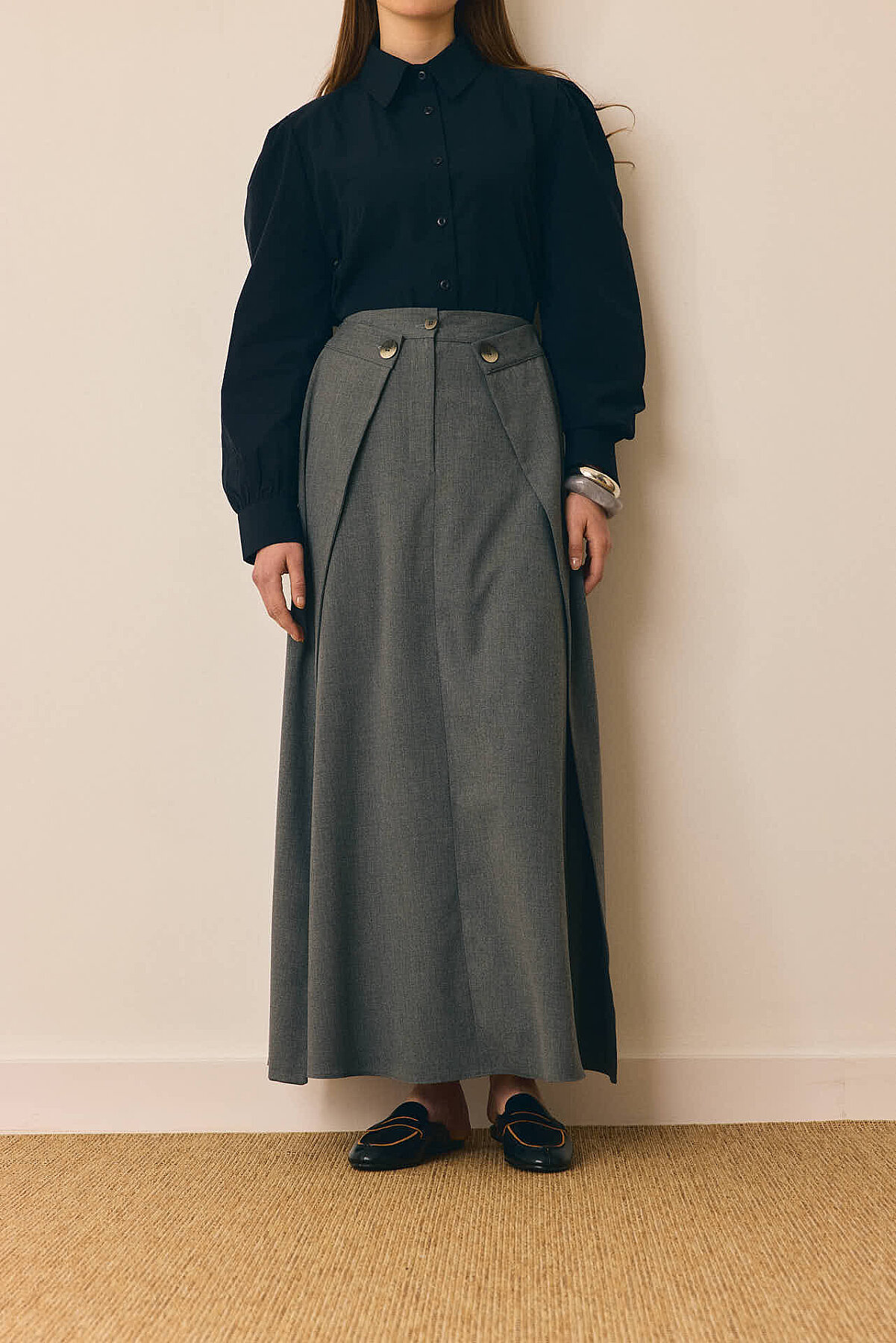Buttoned Polyviscose Skirt – Grey offers a clean yet distinctive look with its front button details and pleated structure that balances the silhouette. The firm, smooth surface of the polyviscose fabric helps the skirt maintain its shape throughout the day, while its lightweight feel ensures comfortable wear. The structured cut at the waist refines the silhouette, and the solid color makes it easy to style with shirts, knitwear, and jackets. It provides versatile use, from everyday city outfits to more polished combinations.