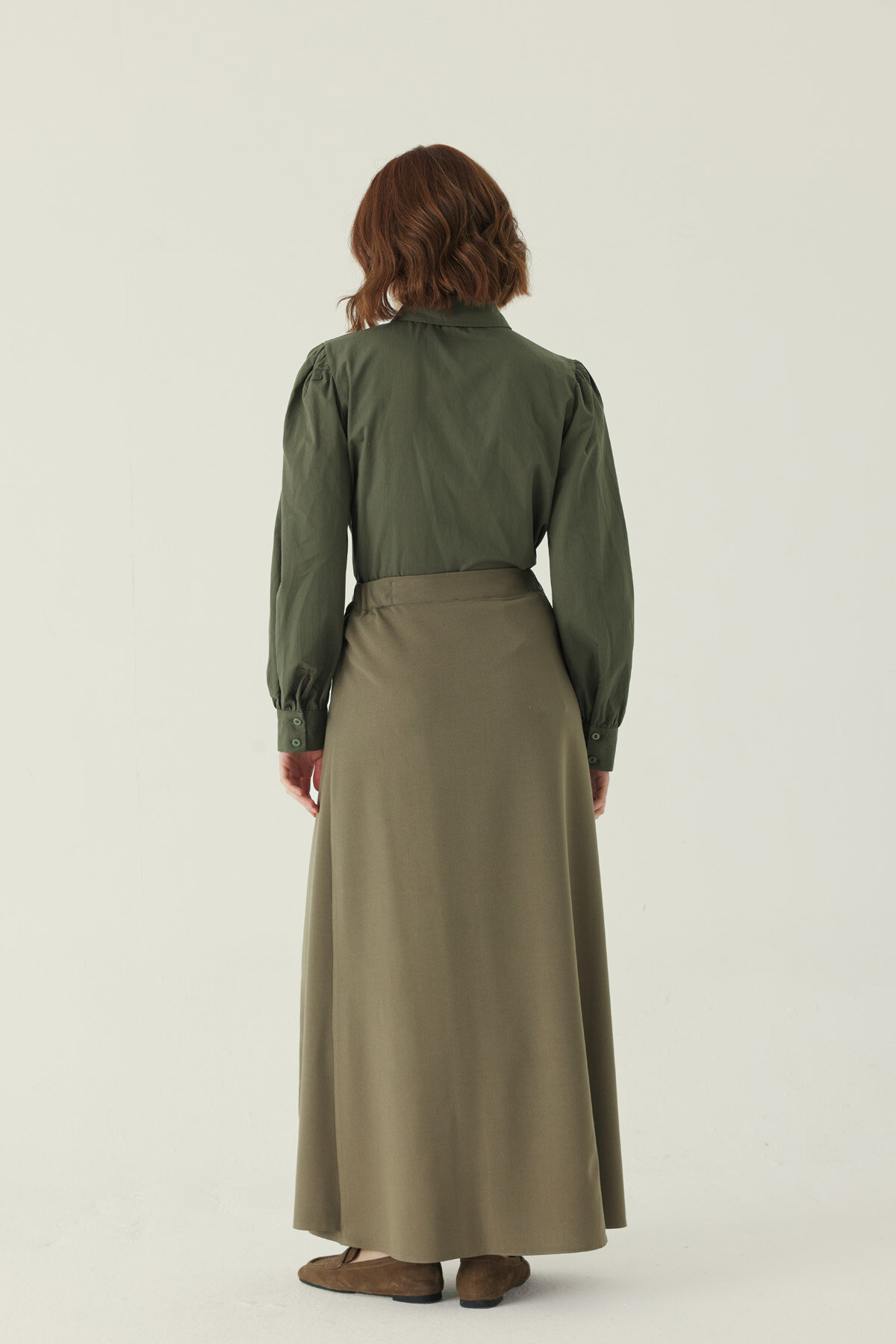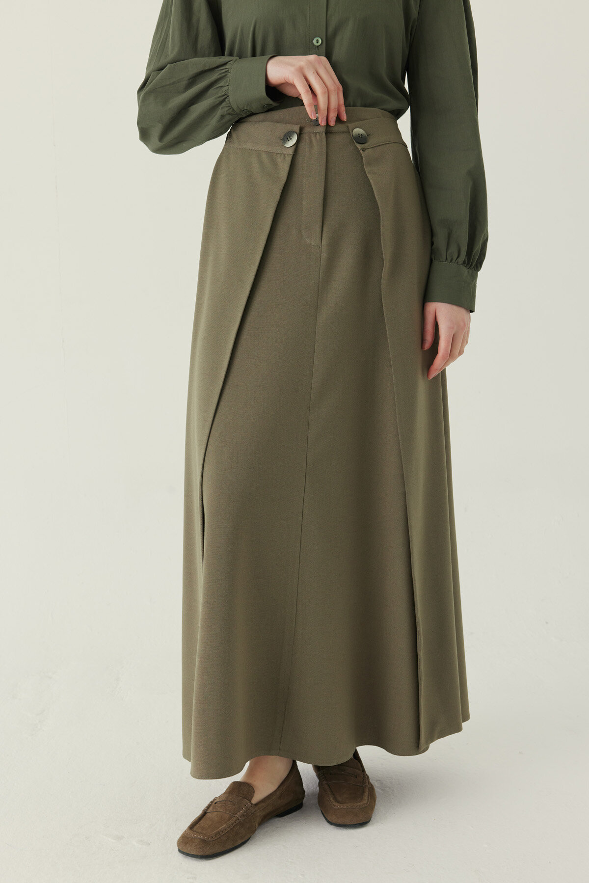 Buttoned Polyviscose Skirt – Khaki offers a clean yet distinctive look with its front button details and pleated structure that balances the silhouette. The firm, smooth surface of the polyviscose fabric helps the skirt maintain its shape throughout the day, while its lightweight feel ensures comfortable wear. The structured cut at the waist refines the silhouette, and the solid color makes it easy to style with shirts, knitwear, and jackets. It provides versatile use, from everyday city outfits to more polished combinations.