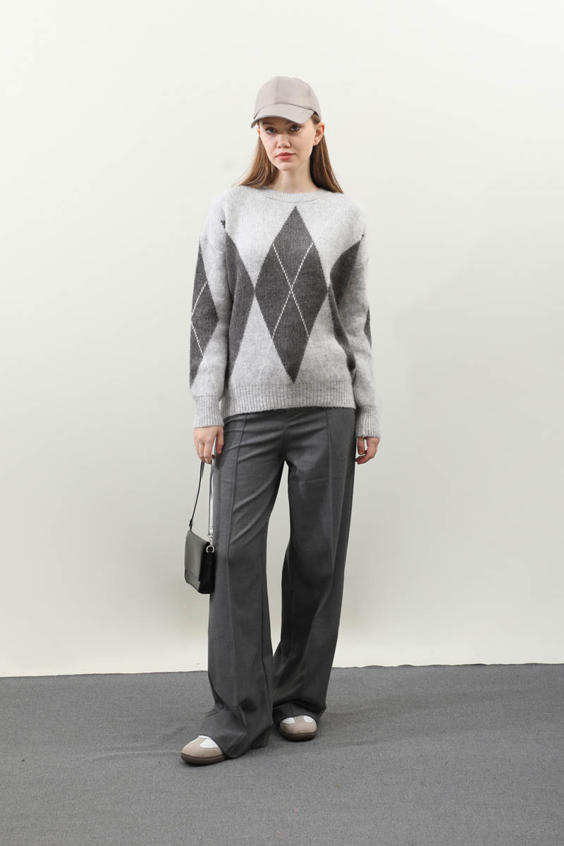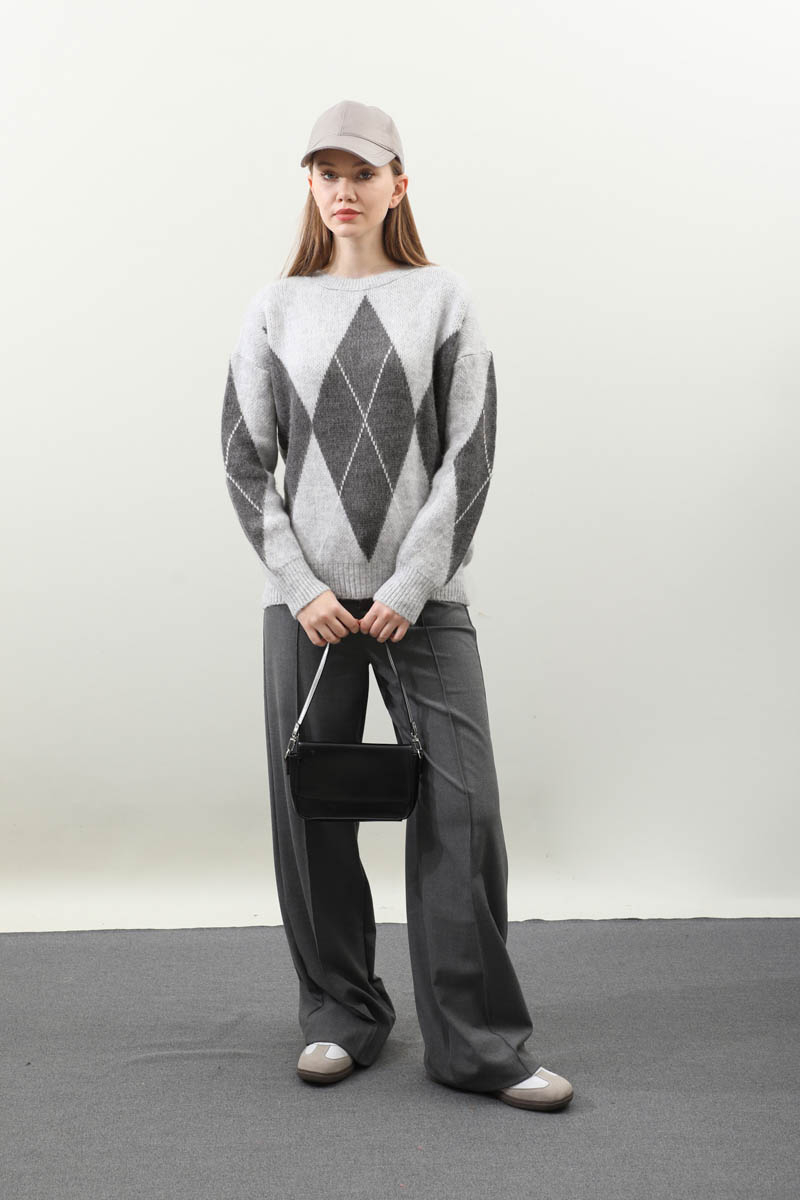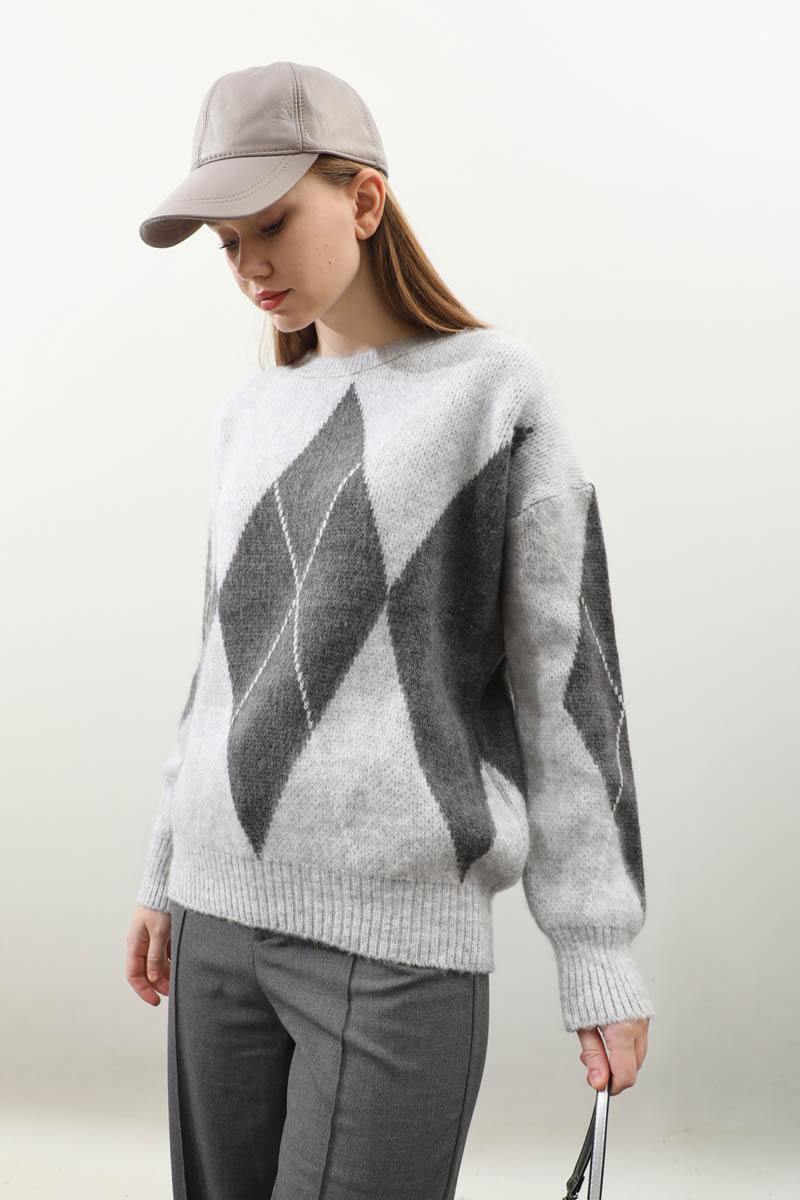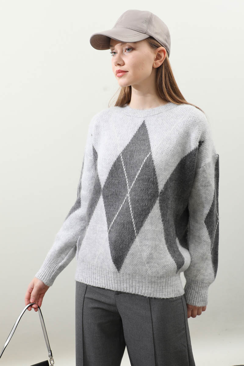 Büyük Baklava Desenli Kazak Gri. Bisiklet düşük omuzludur, yaka, manşet ve etek ucu ribanalıdır, kendiliğinden büyük baklava desenlidir. Günlük kullanım ve özel günlerinizde tercih edebilirsiniz.